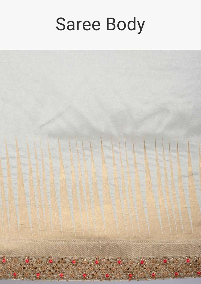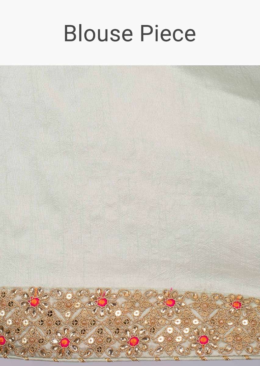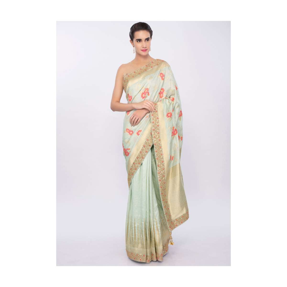 Pista green silk saree with multi color floral weaved pallo with tassel only on Kalki