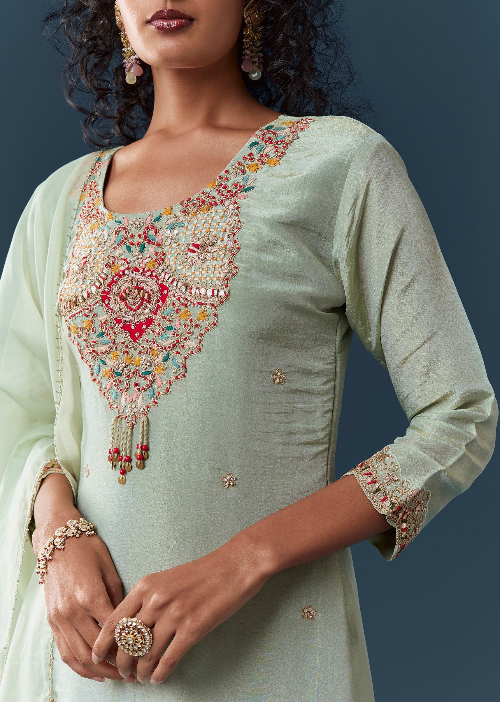 Crafted in luminous tissue, this pista green straight kurta set features zardosi and thread embroidery with patch-work accents for a festive, Pakistani-inspired look. Styled with a round neckline and 3/4th... More Product Details