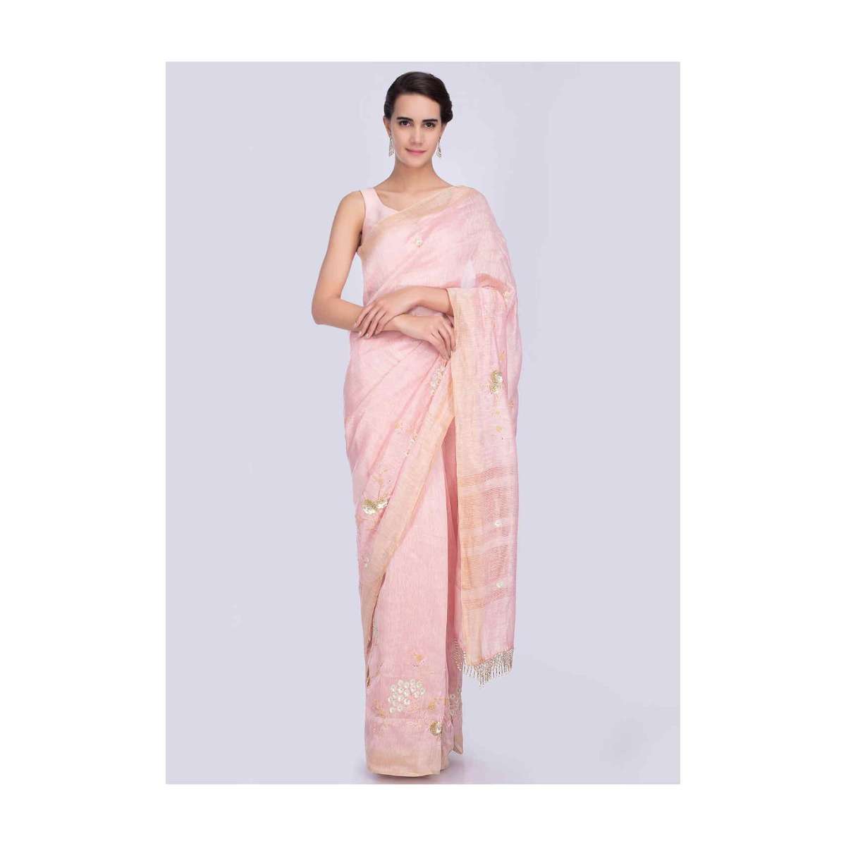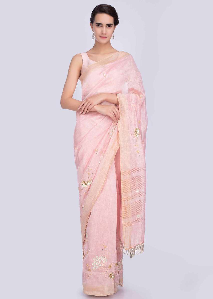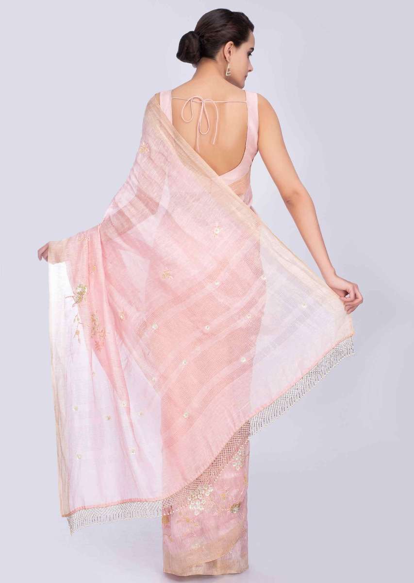 Powder pink linen saree adorn with hand embellished butti and border only on Kalki