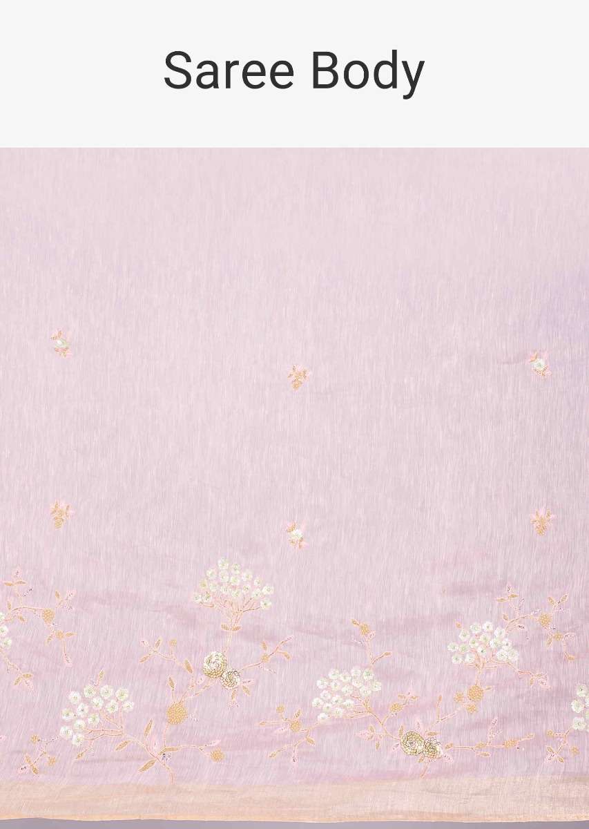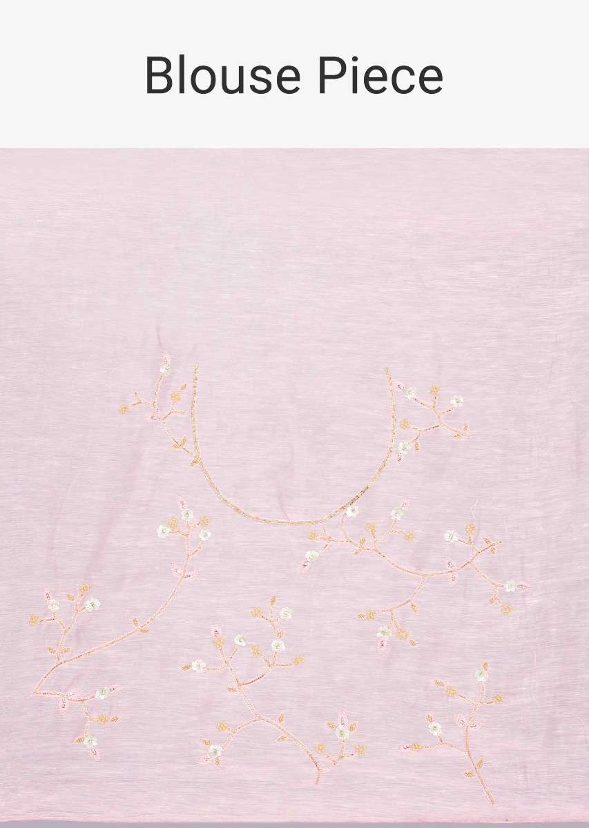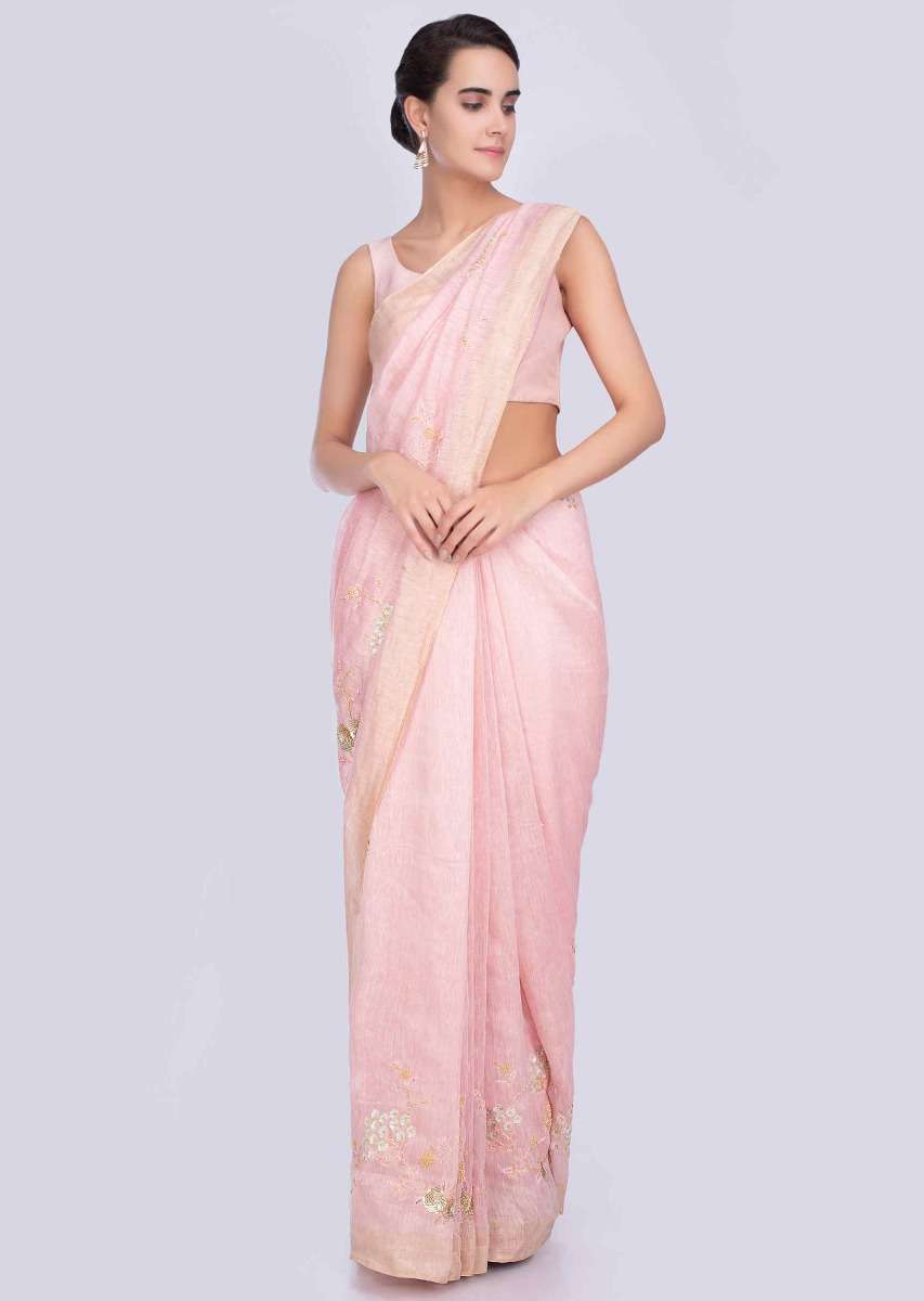 Powder pink linen saree adorn with hand embellished butti and border only on Kalki