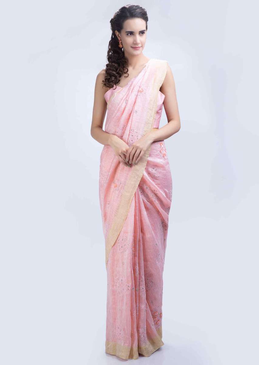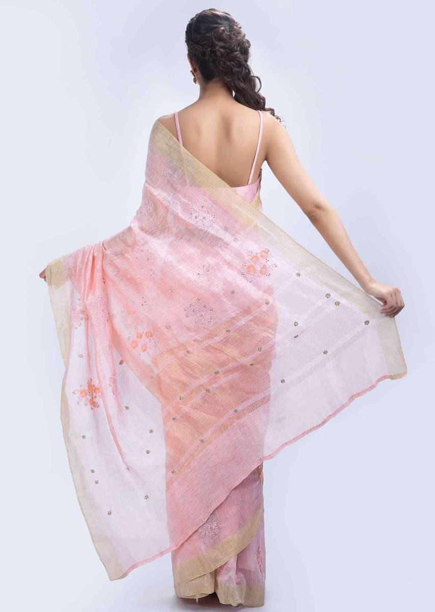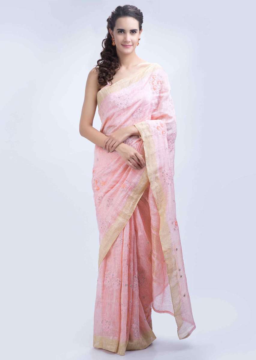 Powder pink linen saree with floral embroidered butti only on Kalki