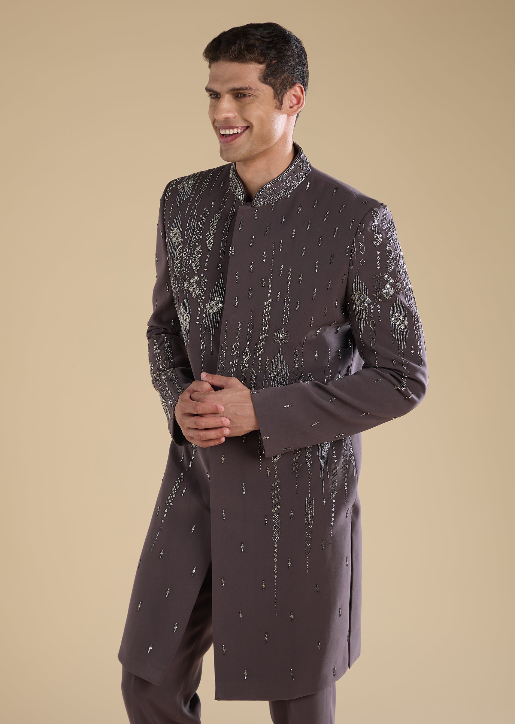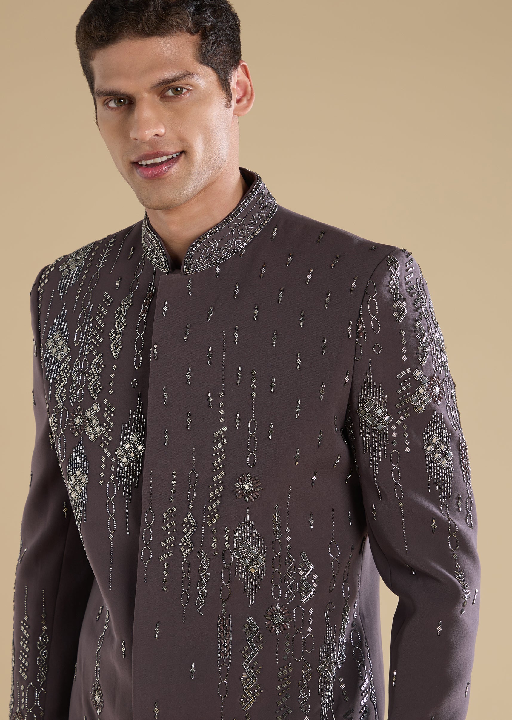Designed in structured polyester, this purple indo-western set is elevated with thread, bead and cut dana embellishments. Featuring a mandarin collar, full sleeves and front hook-eye and button closure, it... More Product Details