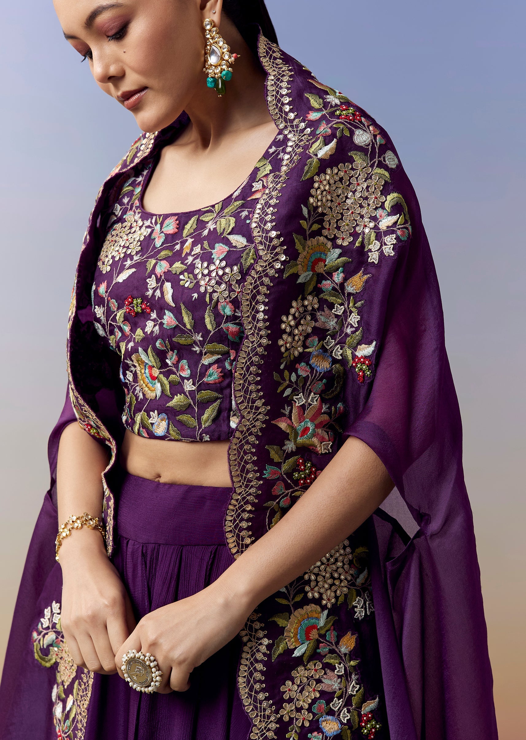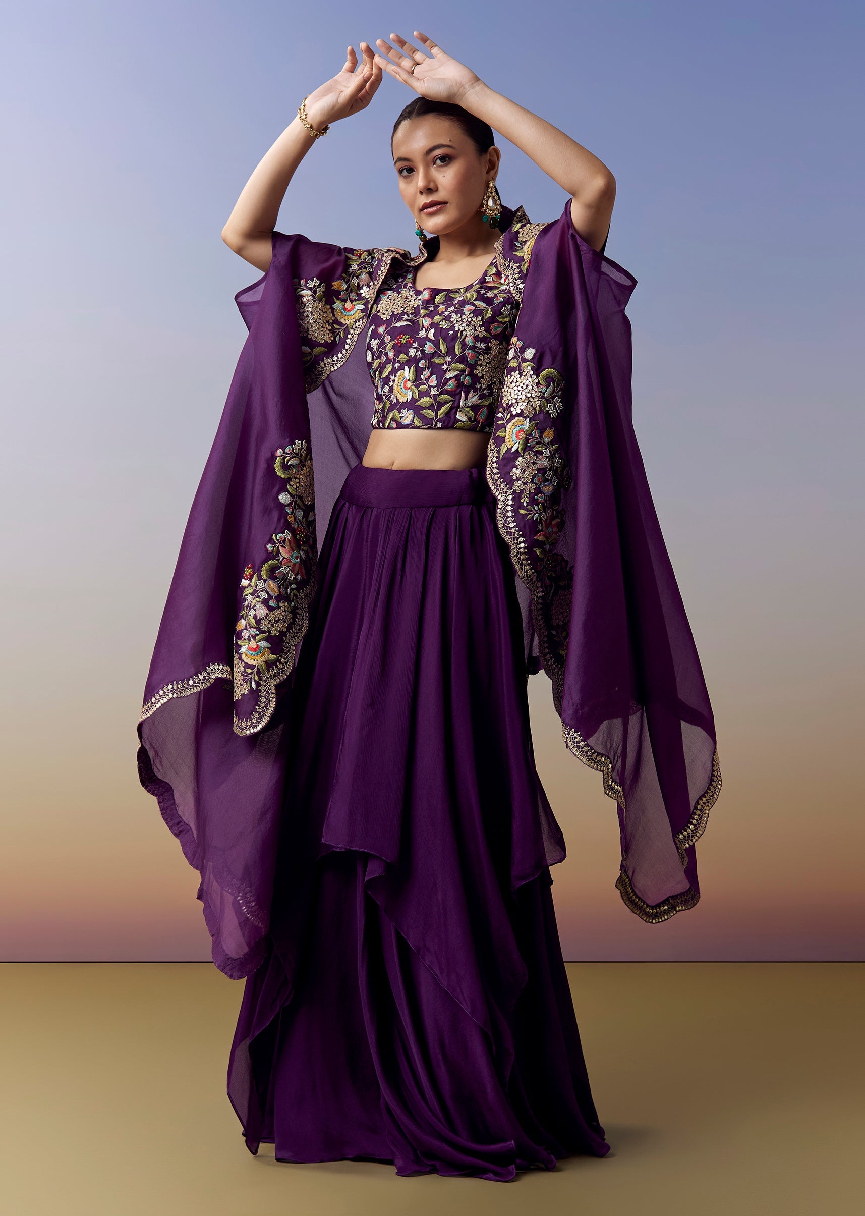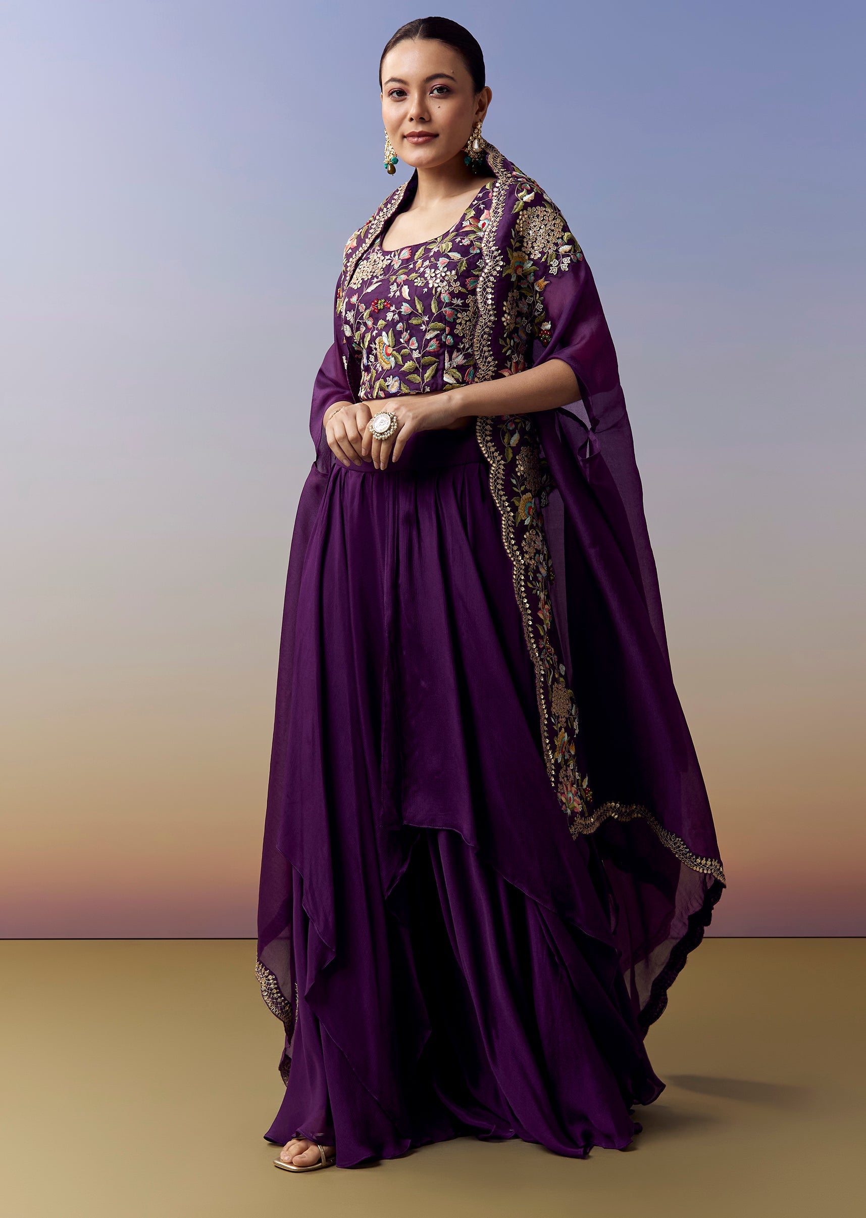 Vibrant and contemporary, this purple crop top and skirt set is crafted for wedding, sangeet and mehendi celebrations. The satin material offers a smooth lustrous fall, while the coordinated cape... More Product Details