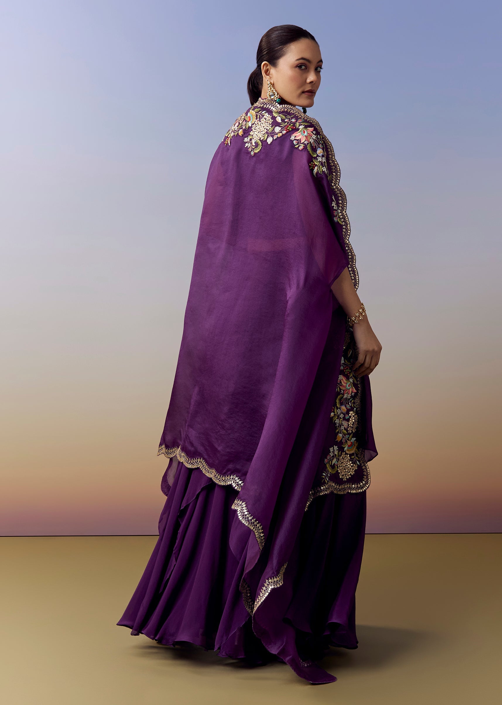 Vibrant and contemporary, this purple crop top and skirt set is crafted for wedding, sangeet and mehendi celebrations. The satin material offers a smooth lustrous fall, while the coordinated cape adds a dramatic modern touch. The crop top and cape are adorned with intricate Parsi work highlighted with delicate gotta accents, giving the ensemble a festive and artistic charm. Designed with a sleeveless silhouette and a graceful square neckline, this look blends elegance with statement making color pop appeal. Awarded as the Most Trusted Brand, we're delivering styles you love, just as promised.