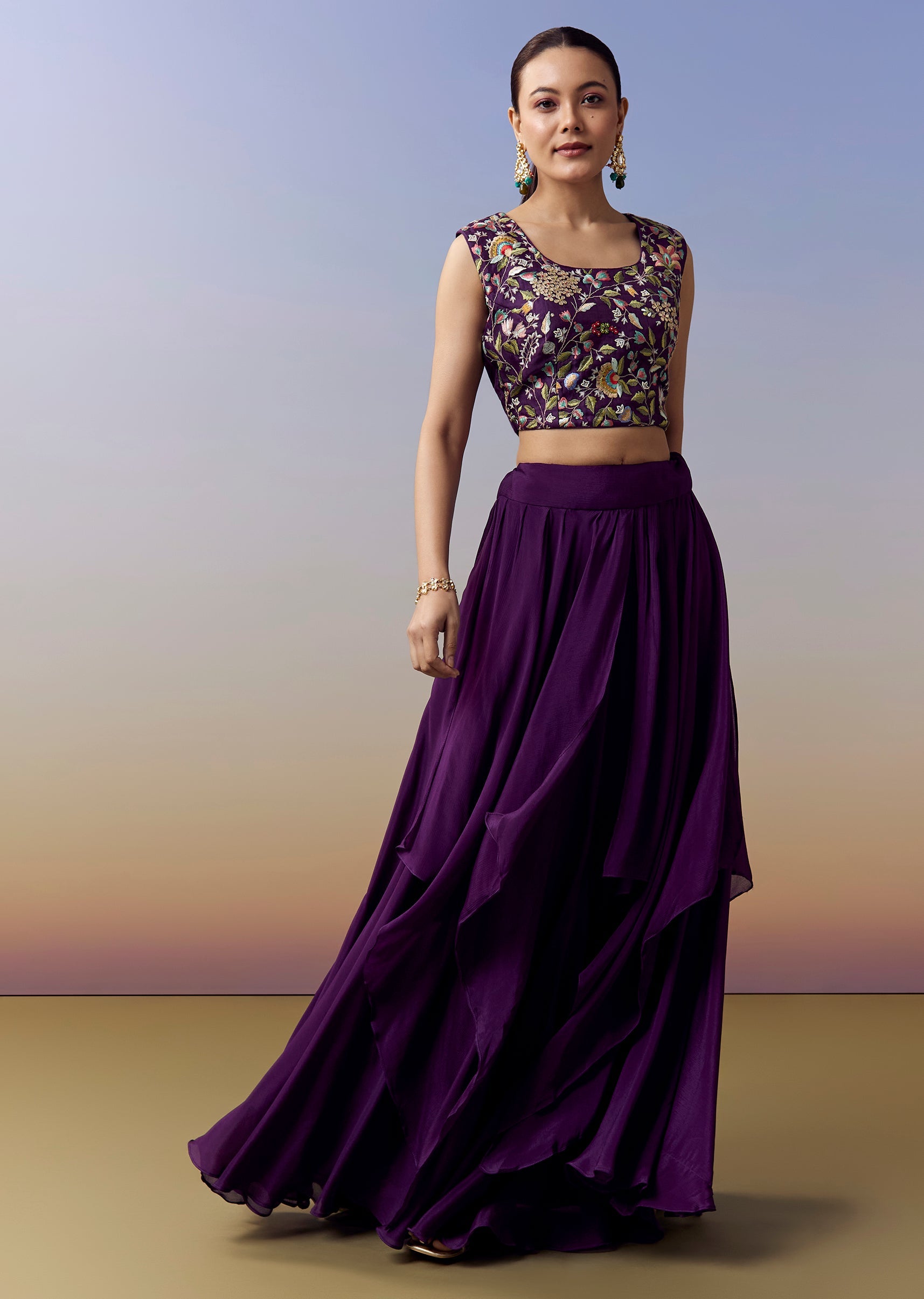 Purple Indo Western Crop Top Skirt Set With Parsi Work