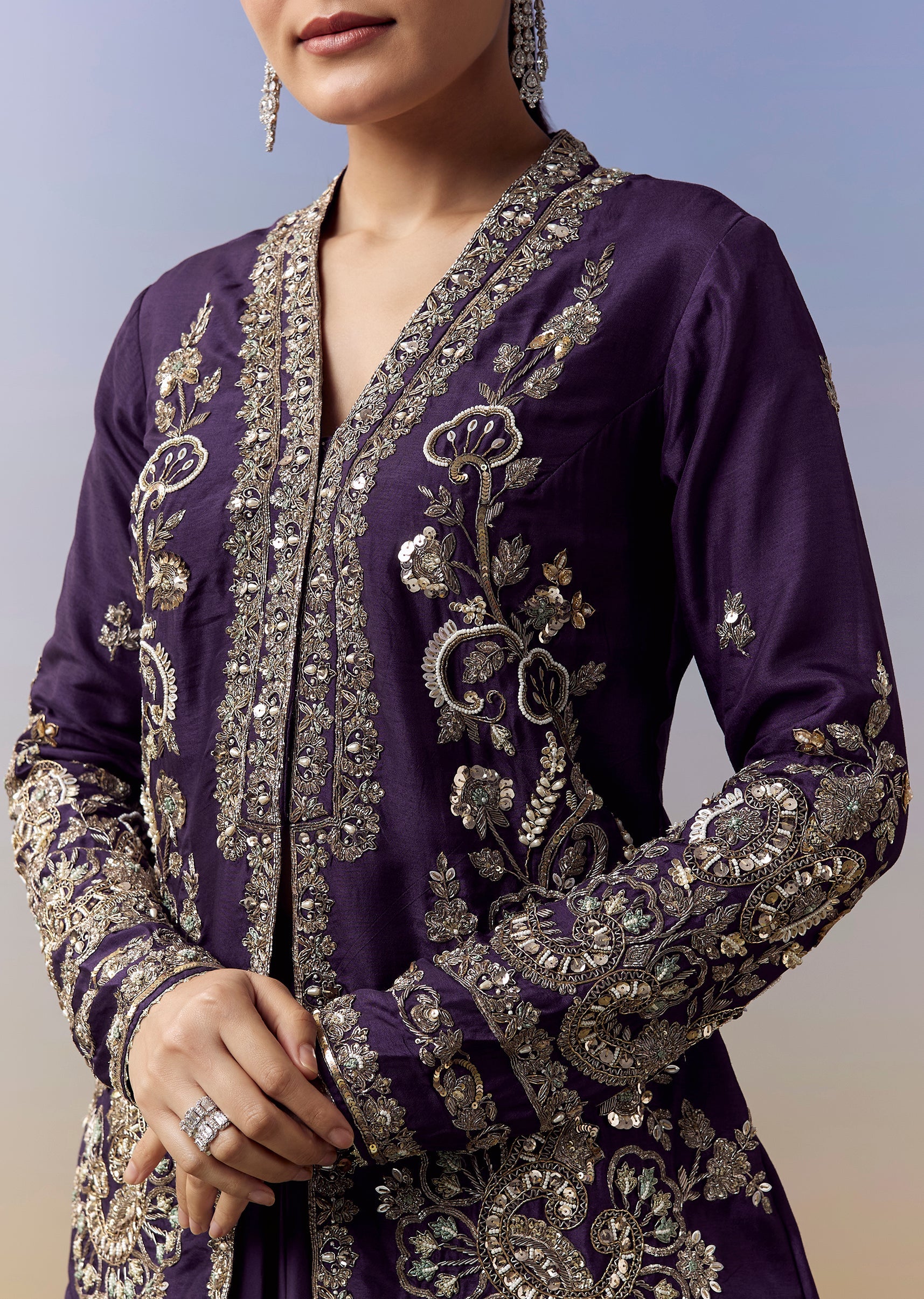Purple Indo Western Crop Top Skirt Set With Zardosi Sequins Work