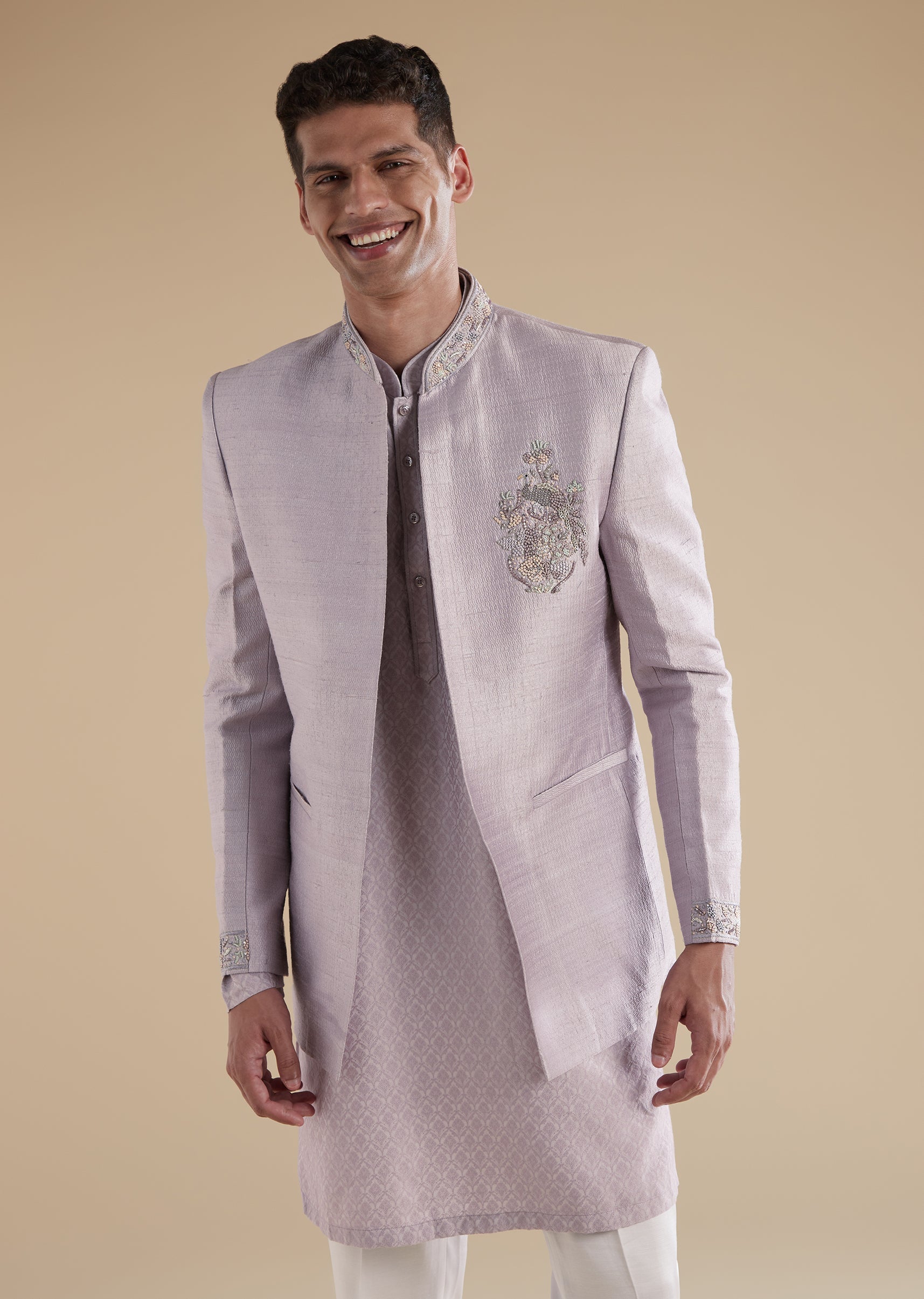Designed for pastel themed festivities, this purple lilac indowestern is tailored in rich jacquard as the primary fabric with silk as the secondary for a refined and contemporary celebration look.... More Product Details