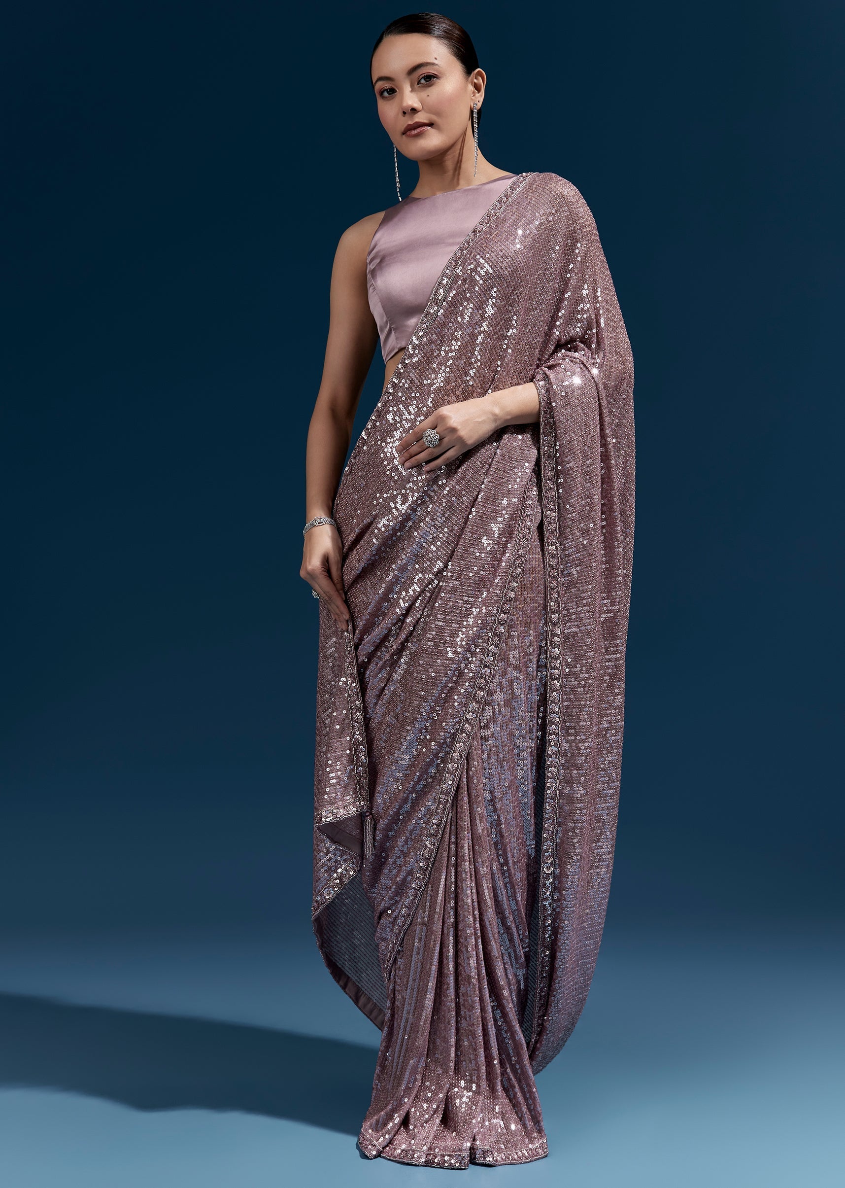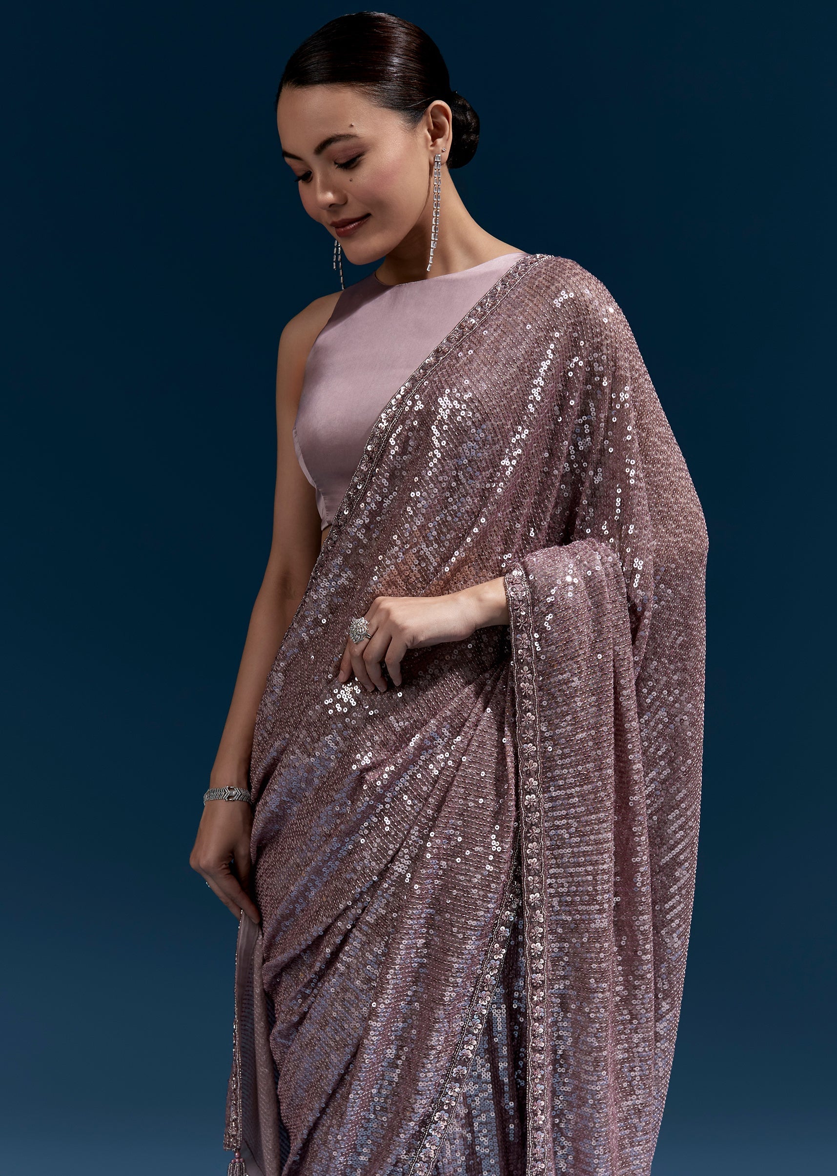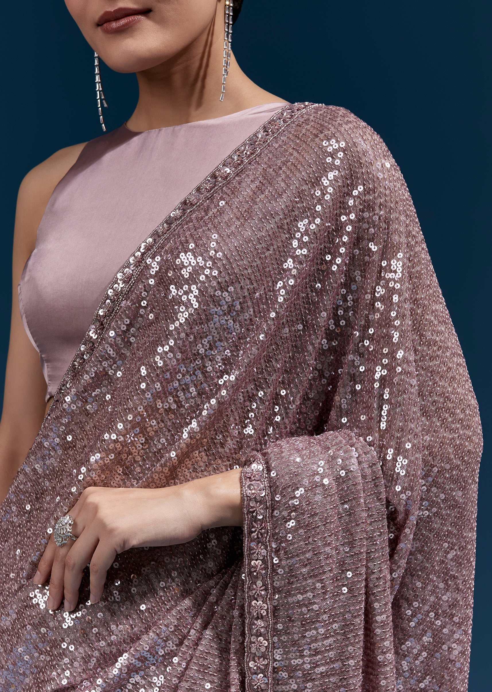 This purple net saree features linear all-over sequin embroidery for a sleek, glowing finish. A hand-embroidered floral border with cutdana, sequins and beads elevates the look—perfect for party and cocktail... More Product Details