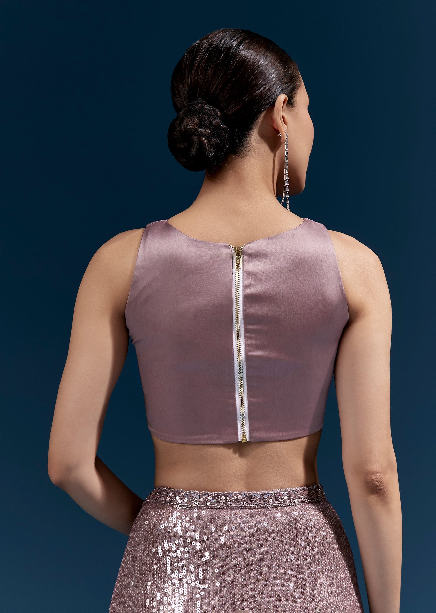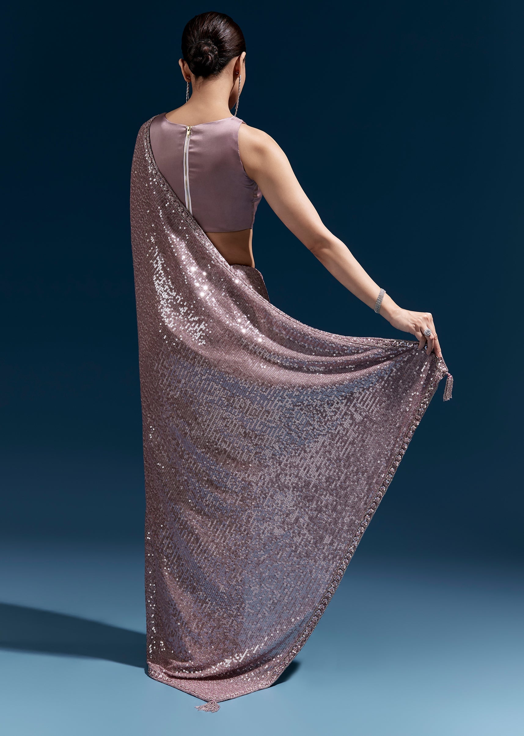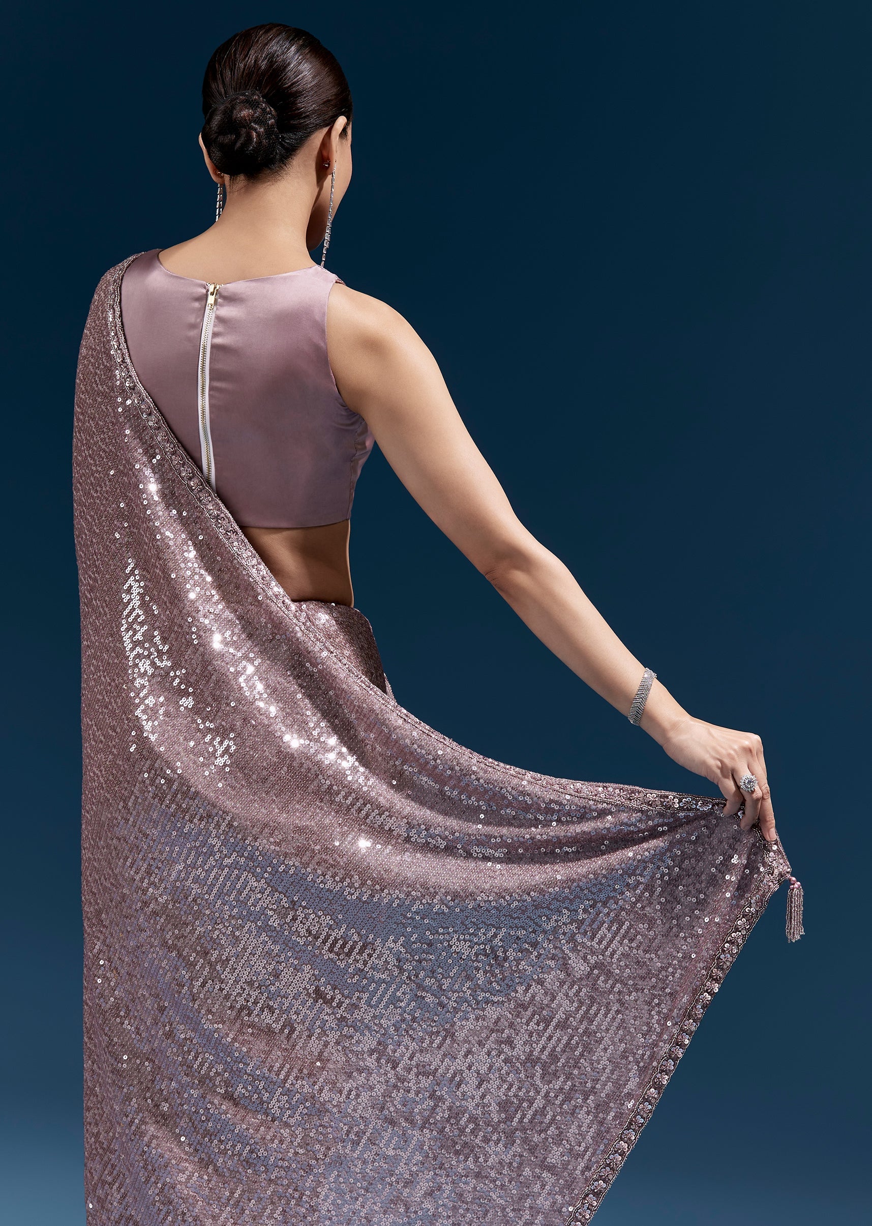 This purple net saree features linear all-over sequin embroidery for a sleek, glowing finish. A hand-embroidered floral border with cutdana, sequins and beads elevates the look—perfect for party and cocktail occasions. Awarded as the Most Trusted Brand, we're delivering styles you love, just as promised.