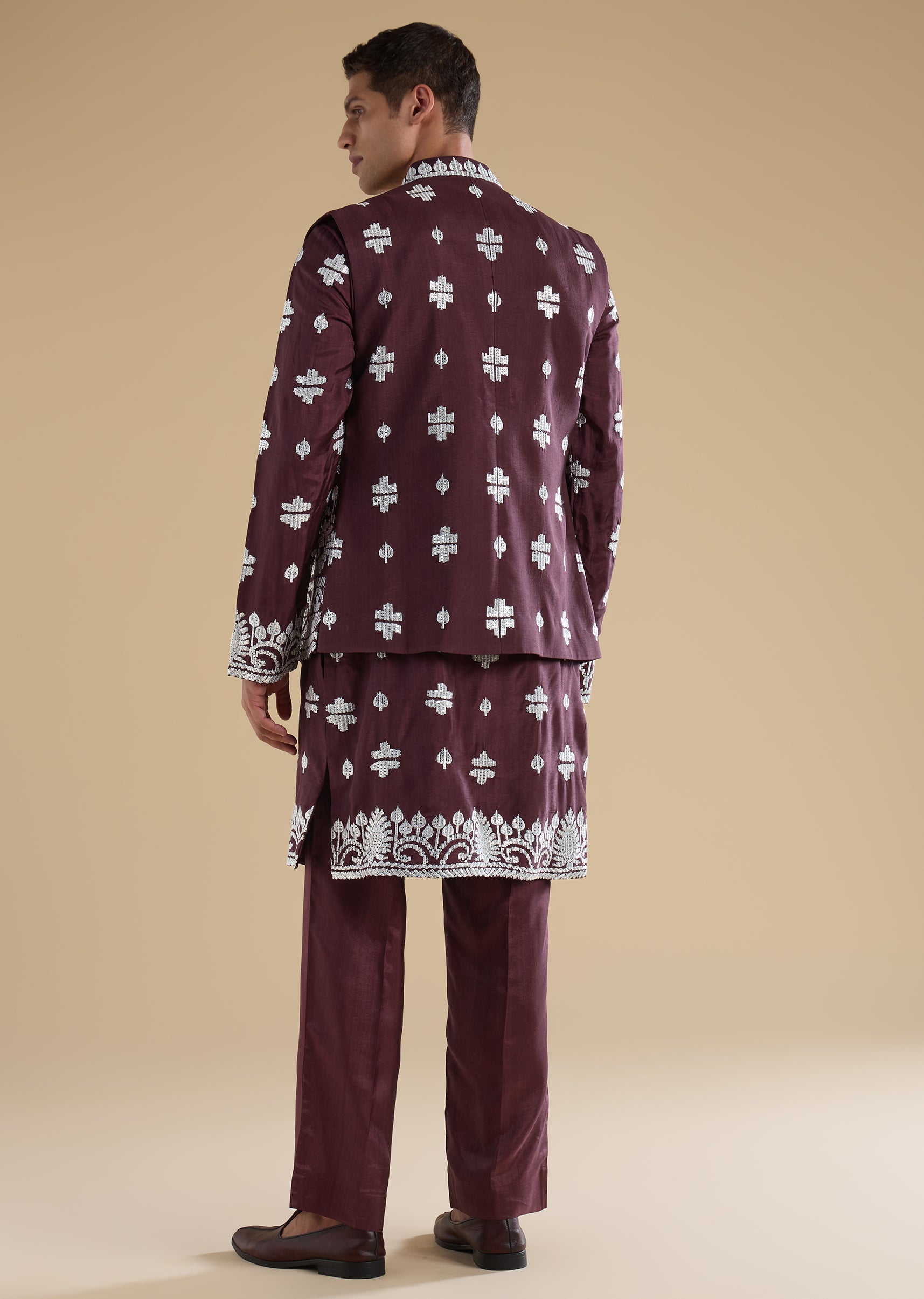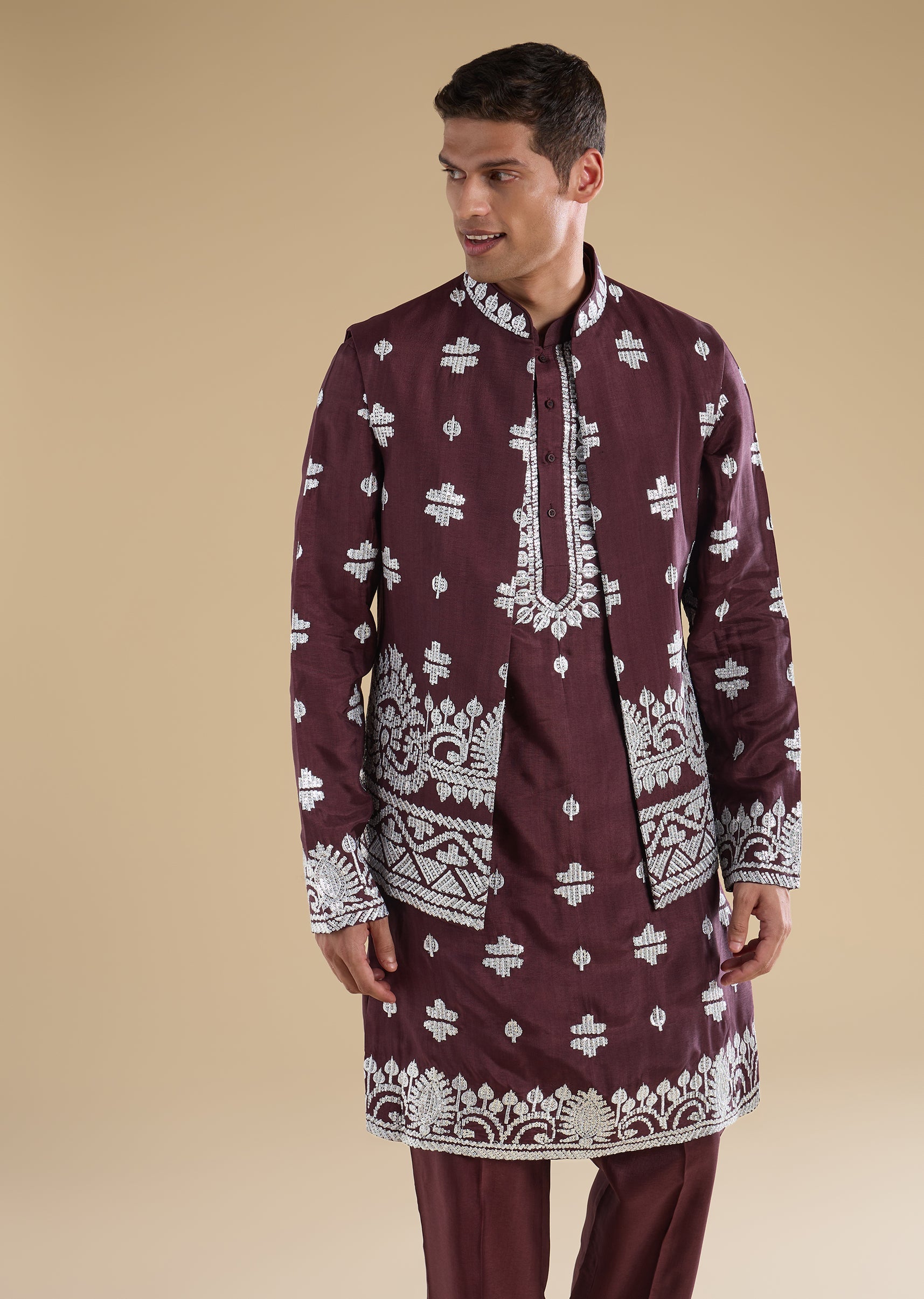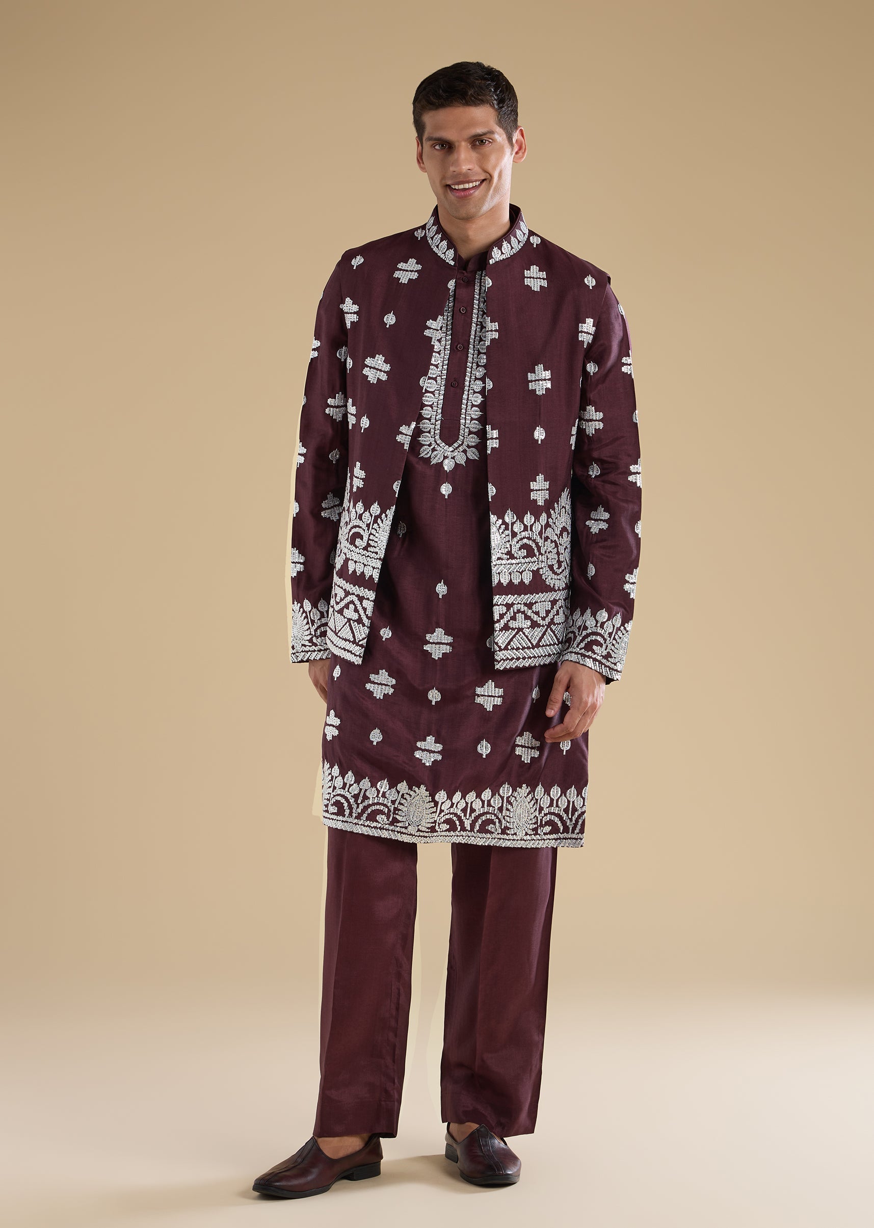 Regal and celebration-ready, this purple kurta jacket set is crafted in a luxurious silk-blend fabric for wedding occasions. The kurta features a mandarin collar, full sleeves, and side slits, paired... More Product Details