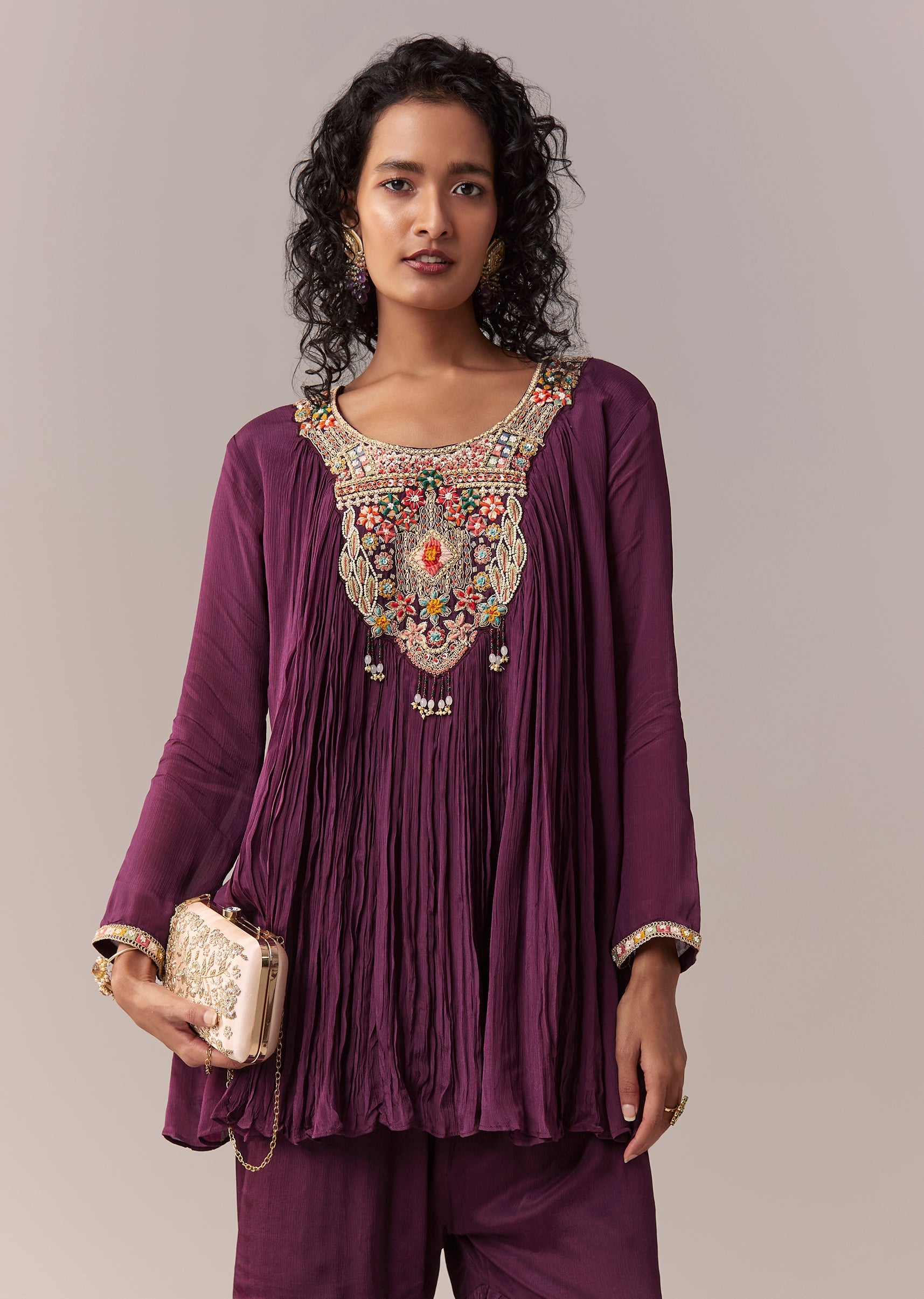 Style with oxidised silver jewellery for a sharp contrast against the purple hue.