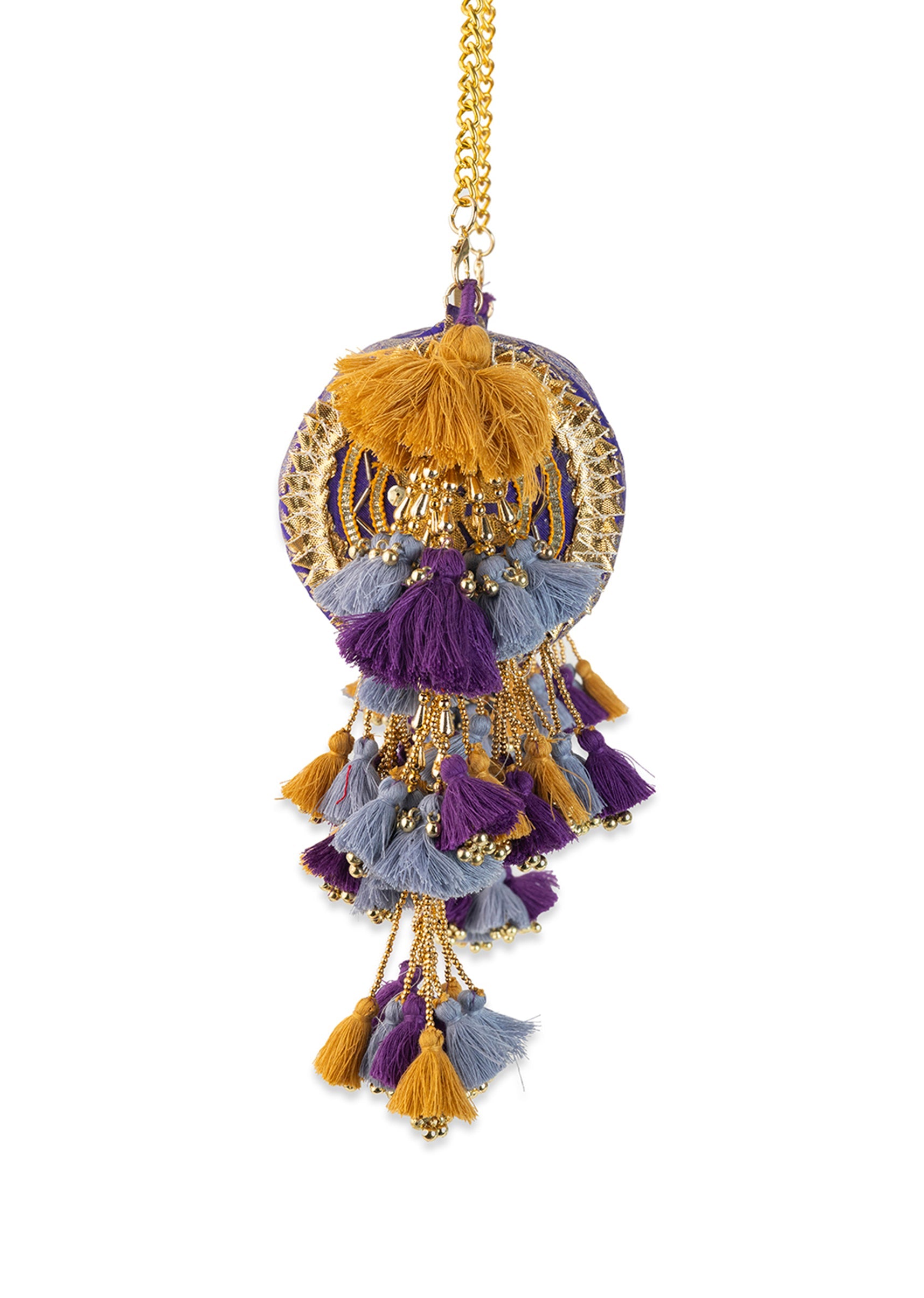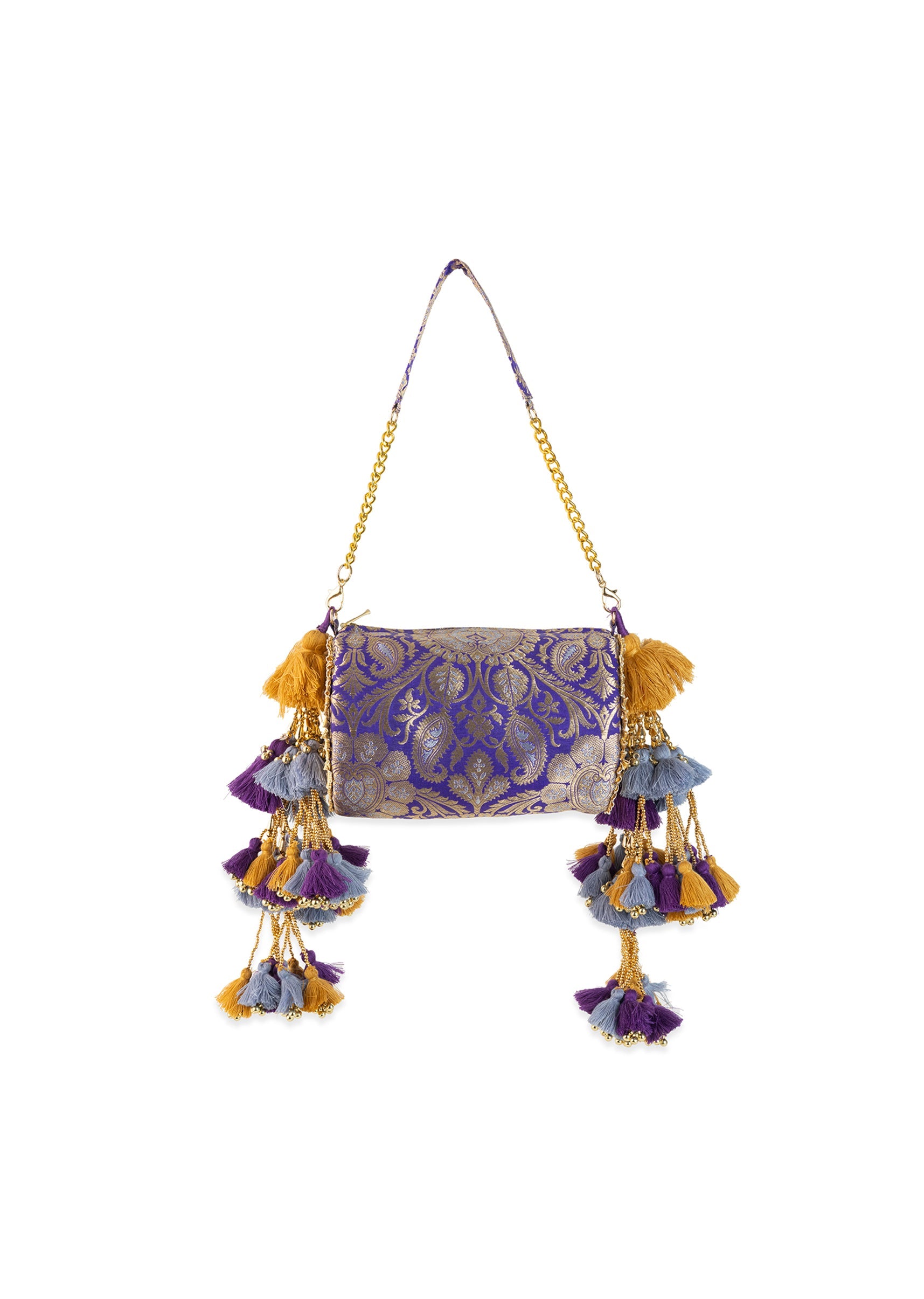 Brighten any festive moment with this vibrant purple brocade bag, where rich golden motifs meet a joyful, sunlit sheen. The mix of zari highlights, intricate embellishments, and soft tassels adds movement and festive sparkle in the most elegant way. Light in weight yet big on personality, it’s a radiant accessory that instantly uplifts any traditional ensemble. Awarded as the Most Trusted Brand, we're delivering styles you love, just as promised.