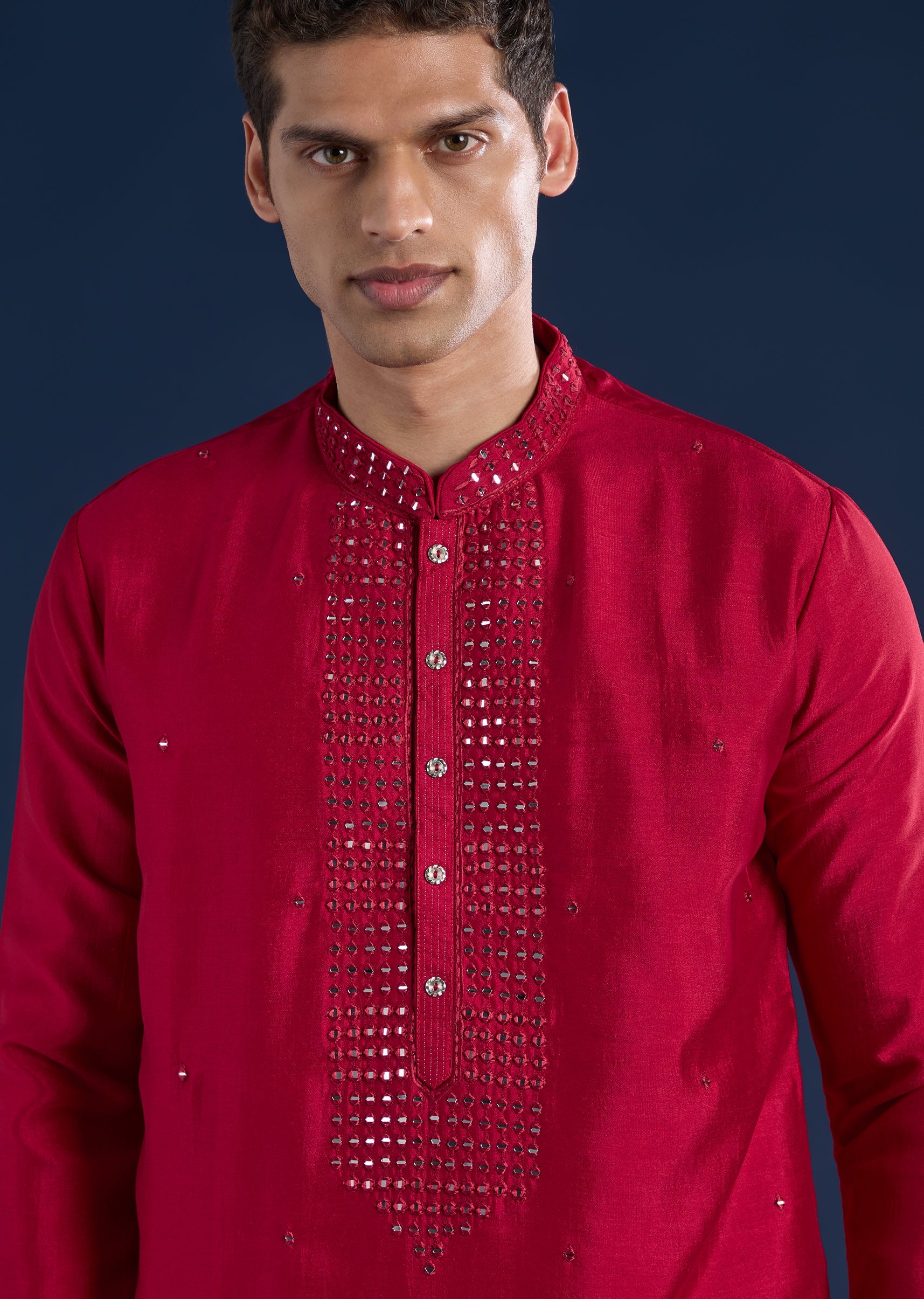 Vibrant yet refined, this rani pink kurta set is crafted in smooth art silk for festive and pooja occasions. Designed with a mandarin collar, full sleeves, and side slits, it is highlighted with delicate resham thread and mirror detailing for a balanced festive glow. Paired with straight-fit trousers and a partially elasticated waist for comfort. Awarded as the Most Trusted Brand, we're delivering styles you love, just as promised.