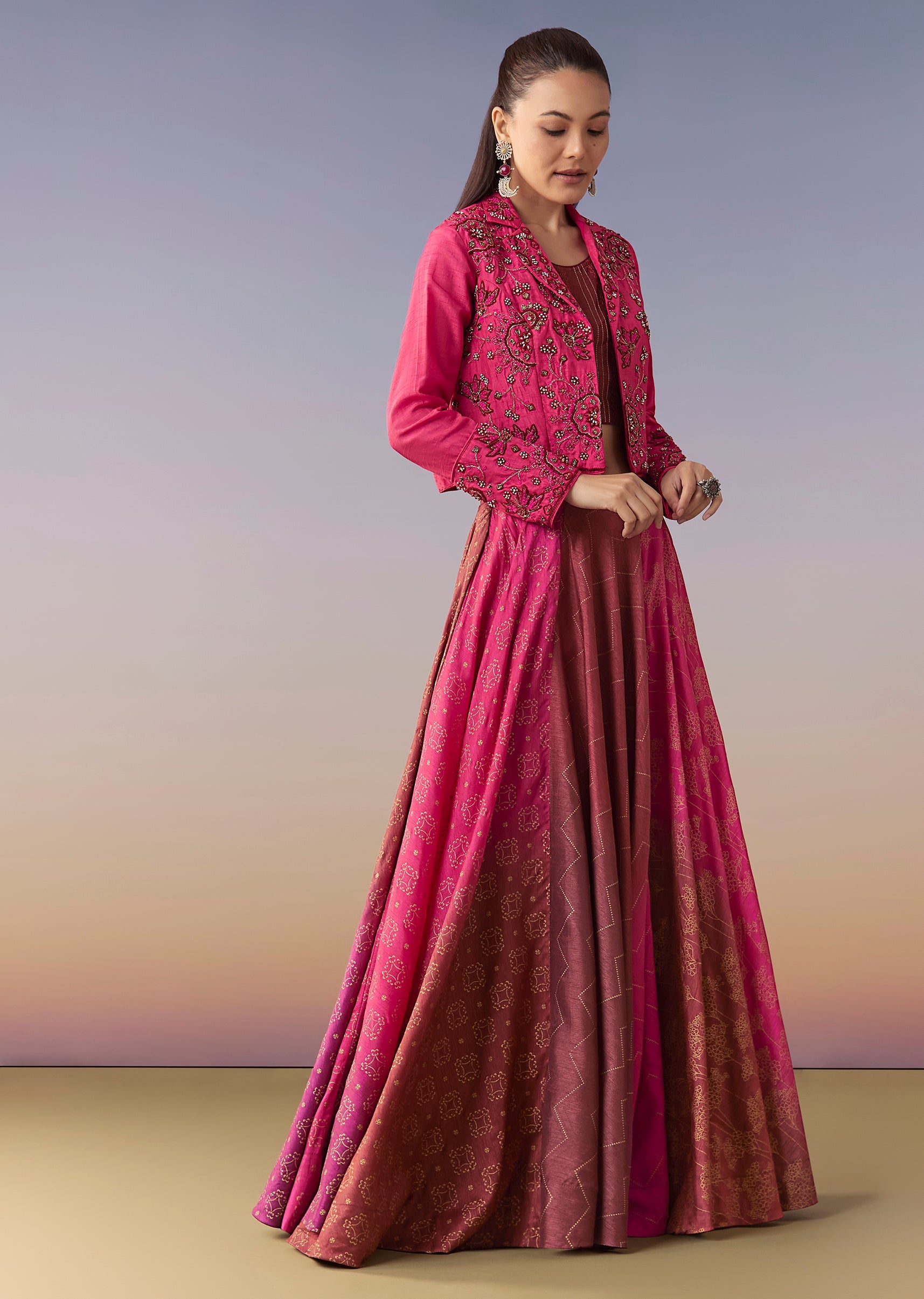 Crafted in raw silk, this festive set features a floral printed skirt paired with a thread and bead embellished jacket and a matching crop top. Finished with full sleeves and a shirt collar on the jacket, it’s a contemporary pick for sangeet and mehendi occasions. Awarded as the Most Trusted Brand, we're delivering styles you love, just as promised.