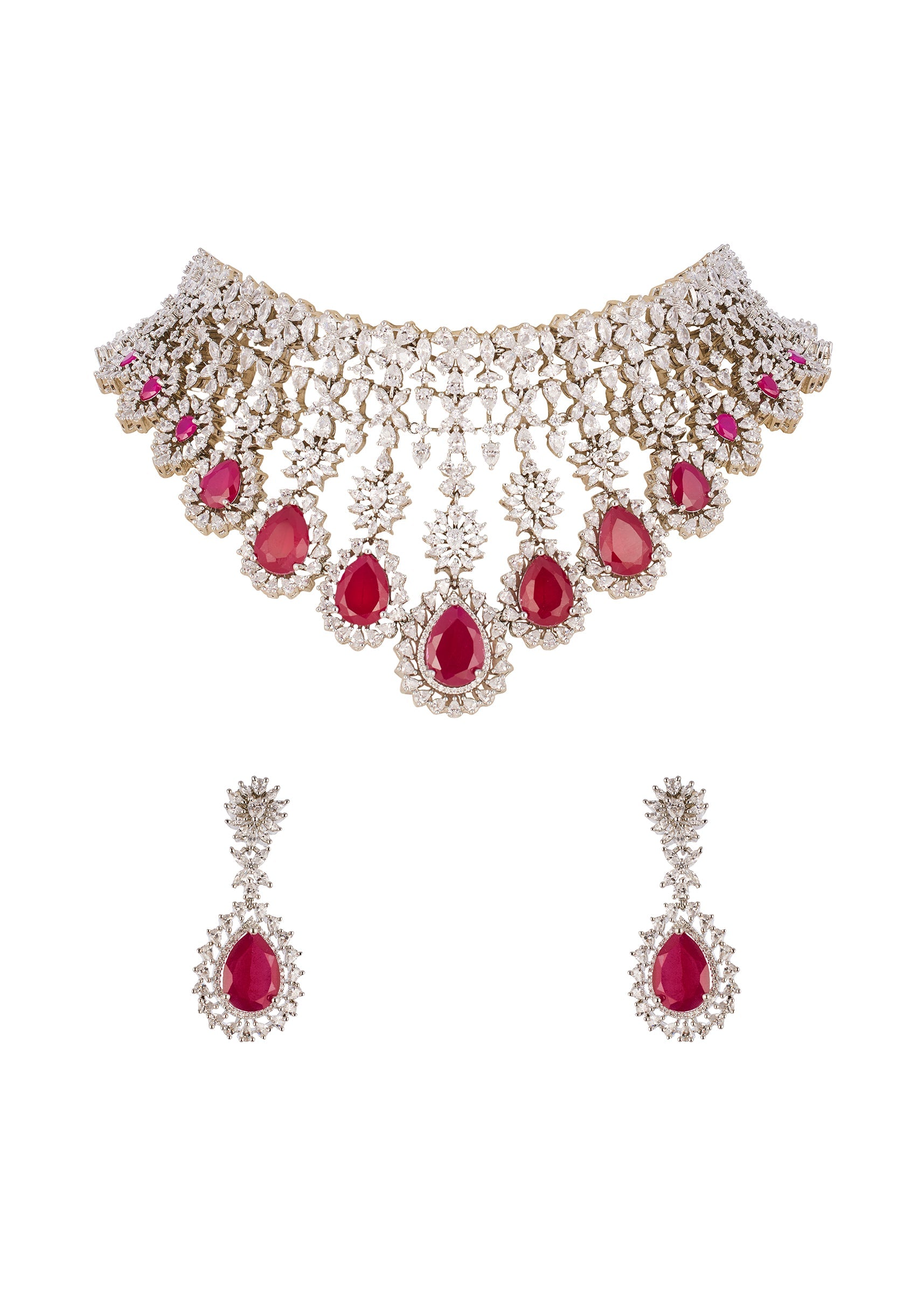 A radiant choice for the rani pink bride, this CZ diamond look necklace set brings together timeless sparkle and modern finesse. Crafted in durable rhodium plated brass with an anti... More Product Details