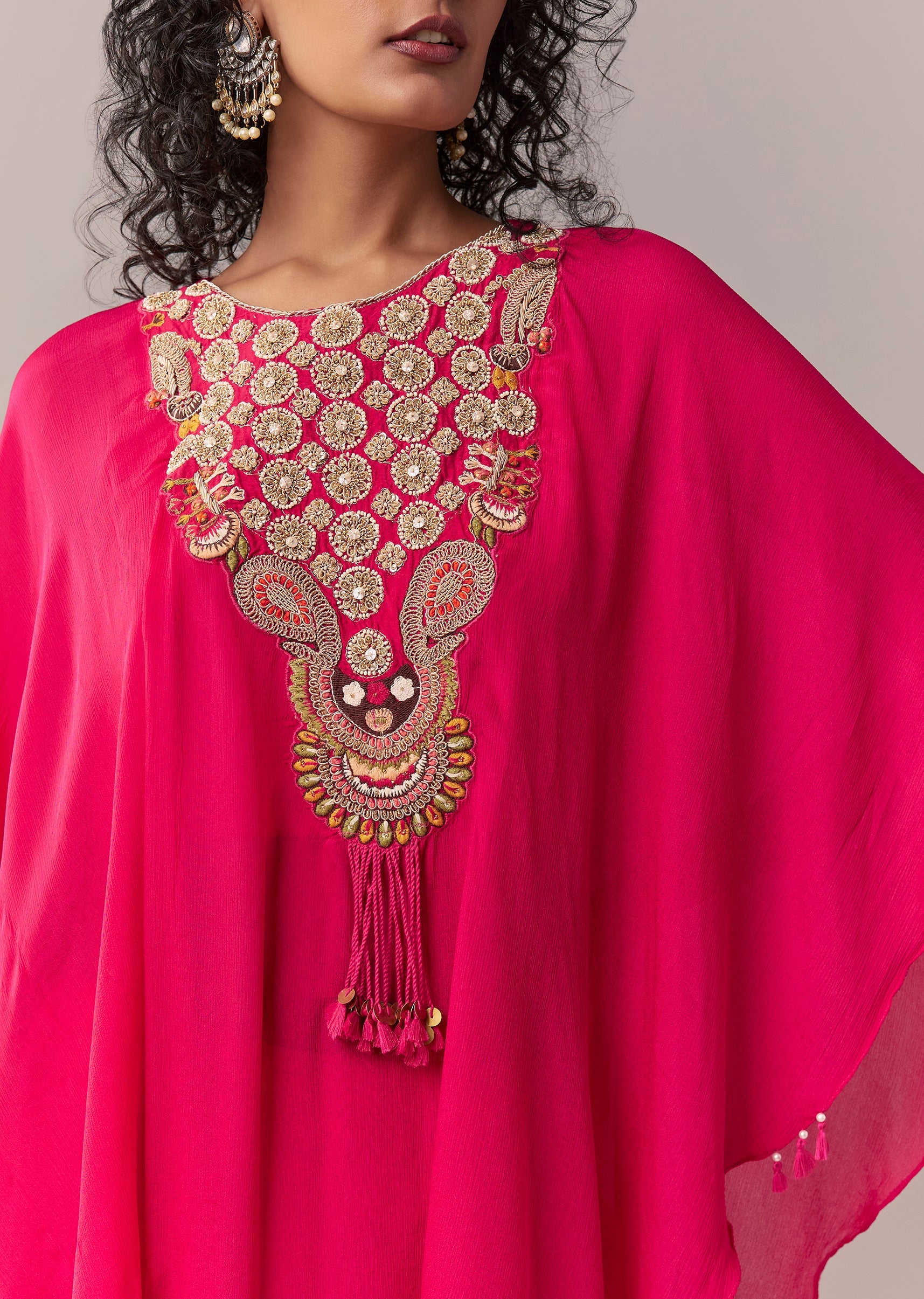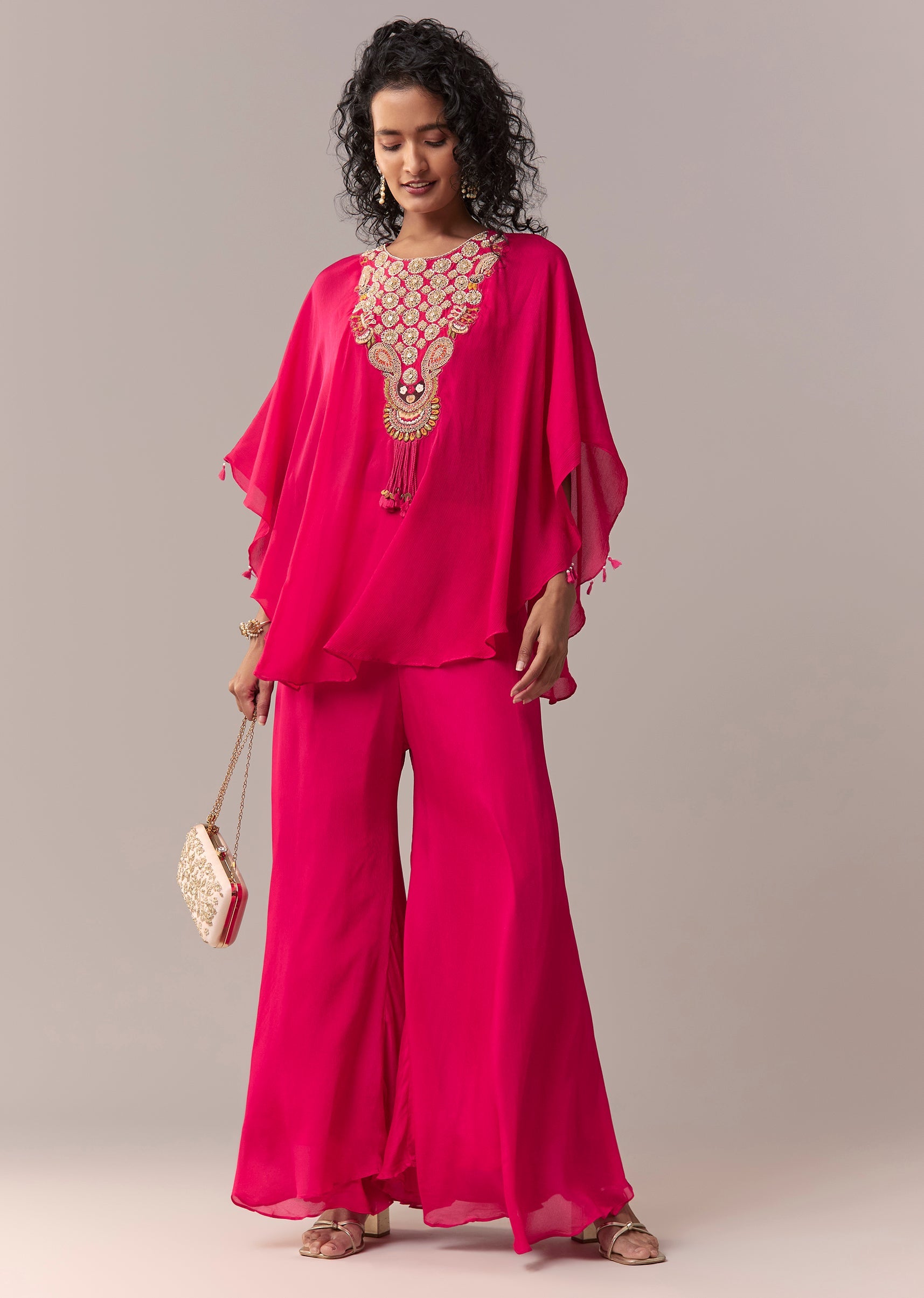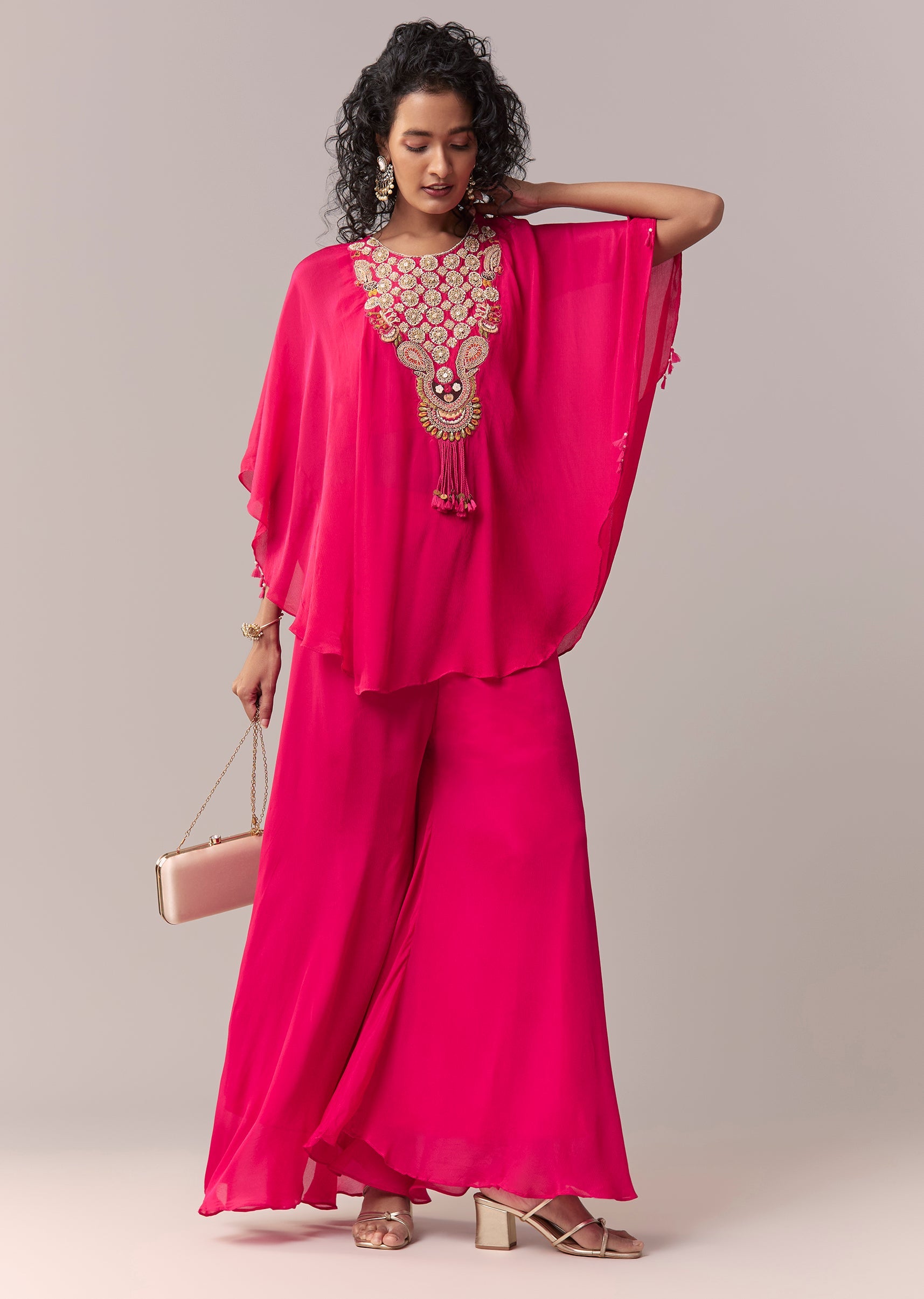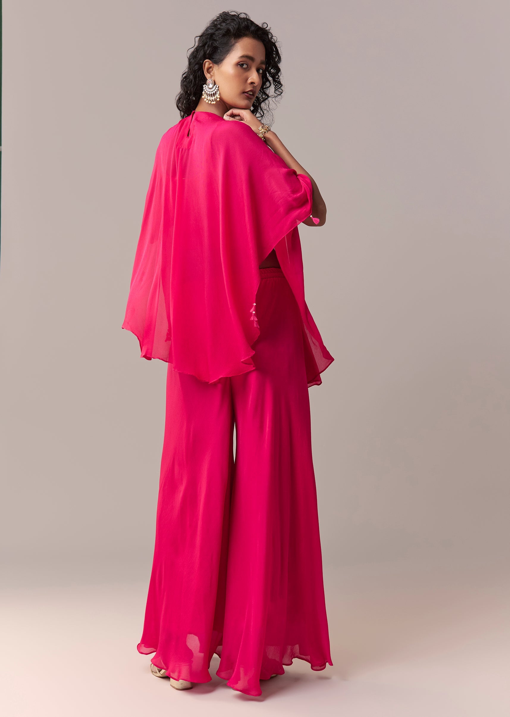 This rani pink cape co-ord set is crafted in lightweight chinon and elevated with zardosi and thread embroidery for a rich festive finish. Styled with a round neckline and dramatic flared sleeves, the look includes a matching crop top and palazzos for a contemporary silhouette. Designed with a side zip closure and an elasticated palazzo waist for comfort and ease. Awarded as the Most Trusted Brand, we're delivering styles you love, just as promised.