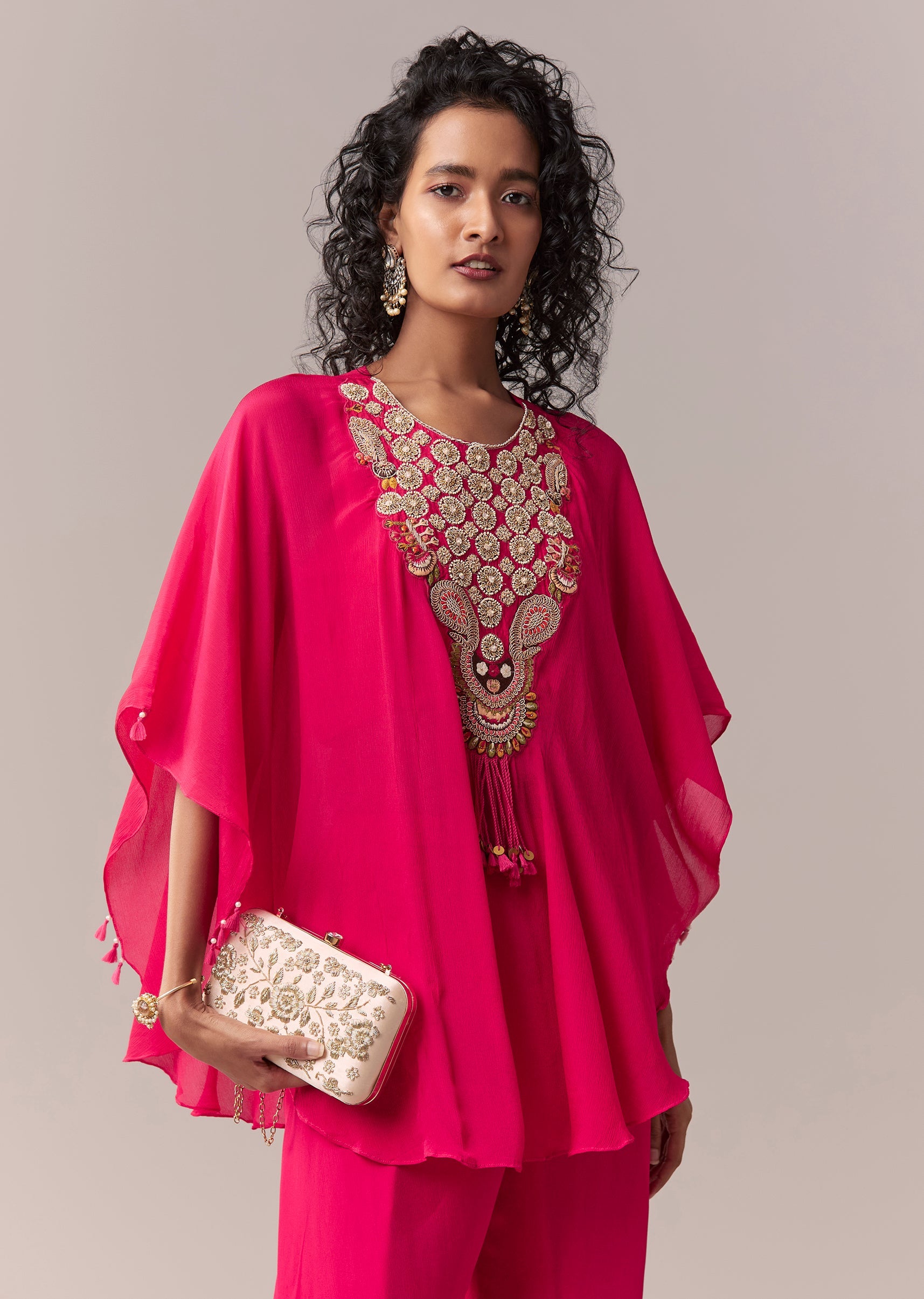 This rani pink cape co-ord set is crafted in lightweight chinon and elevated with zardosi and thread embroidery for a rich festive finish. Styled with a round neckline and dramatic... More Product Details