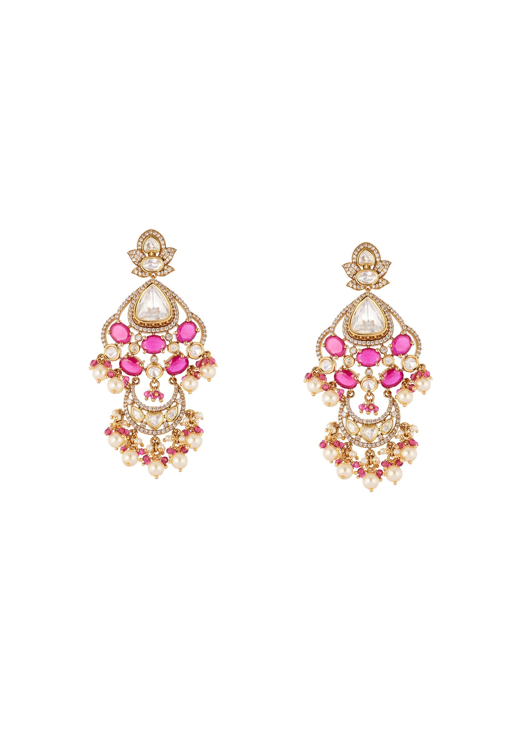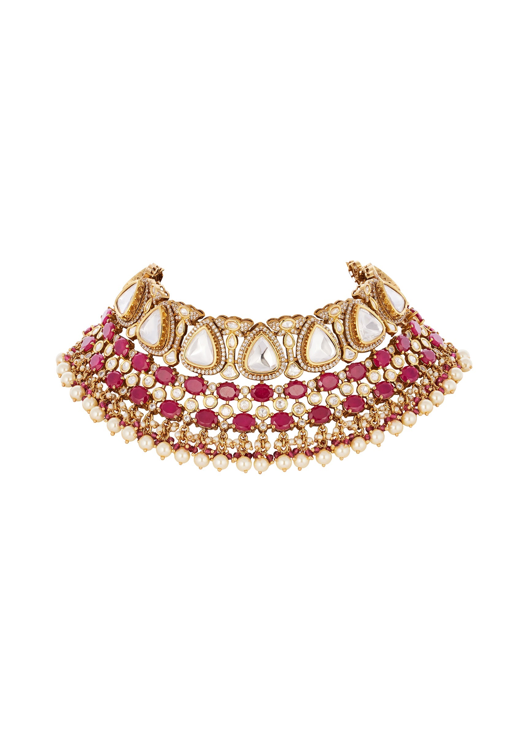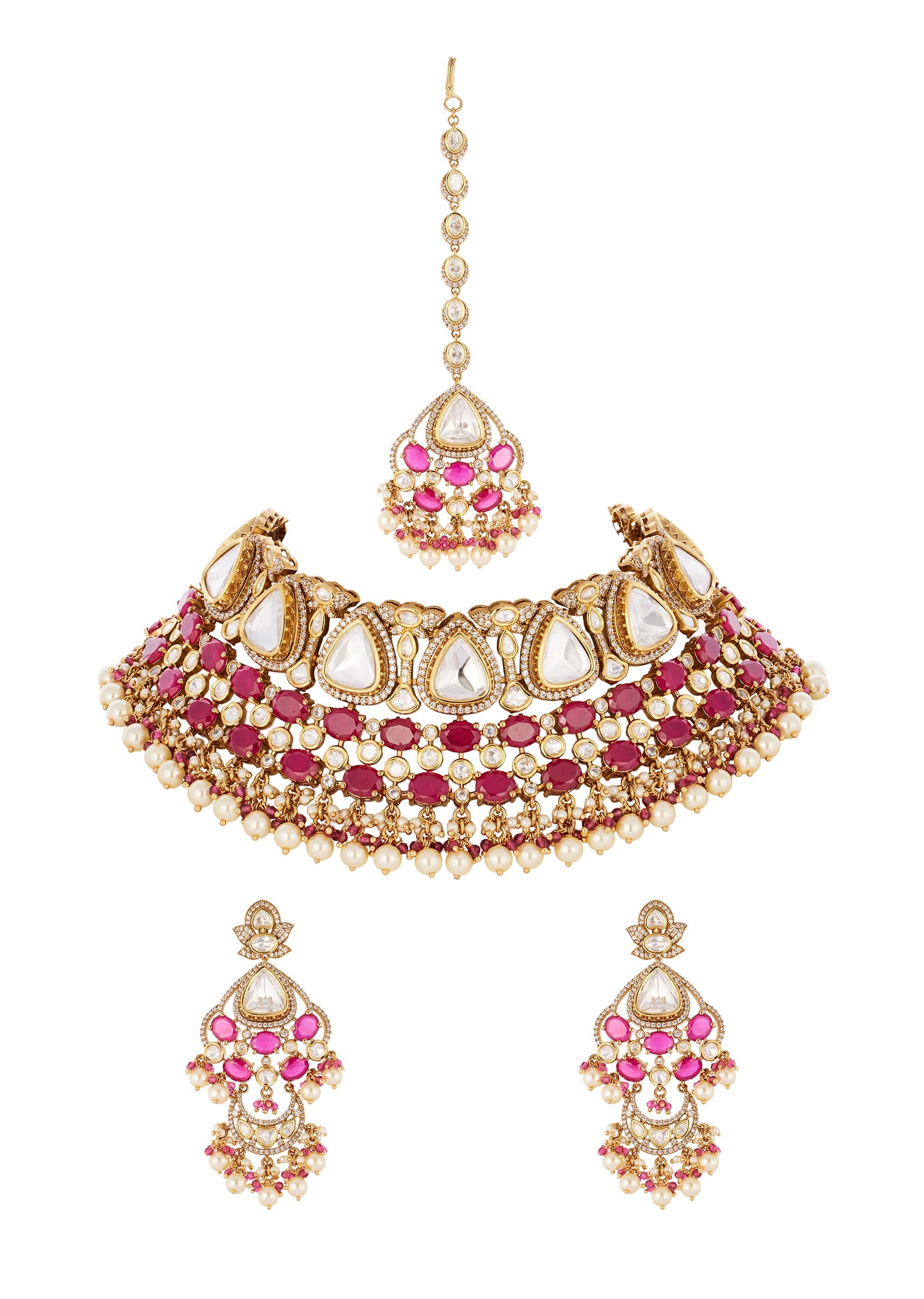 A regal red gold jewellery set crafted using Polki uncut diamonds in the traditional Kundan Jadau technique. Designed with semi precious stones and elegant drop detailing. Handcrafted Indian jewelry that... More Product Details
