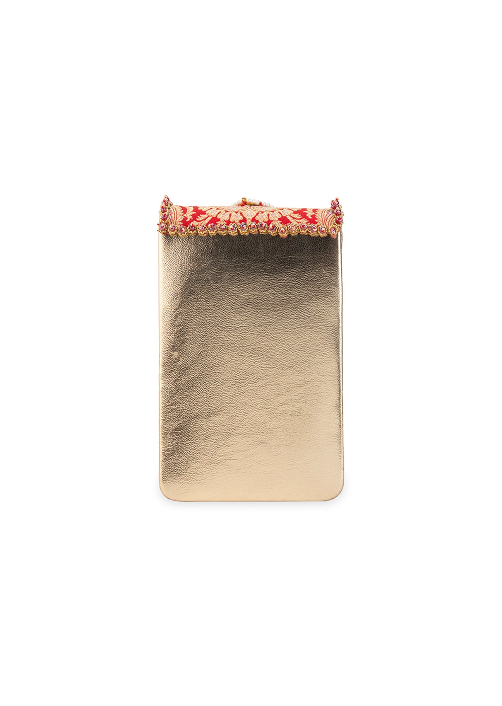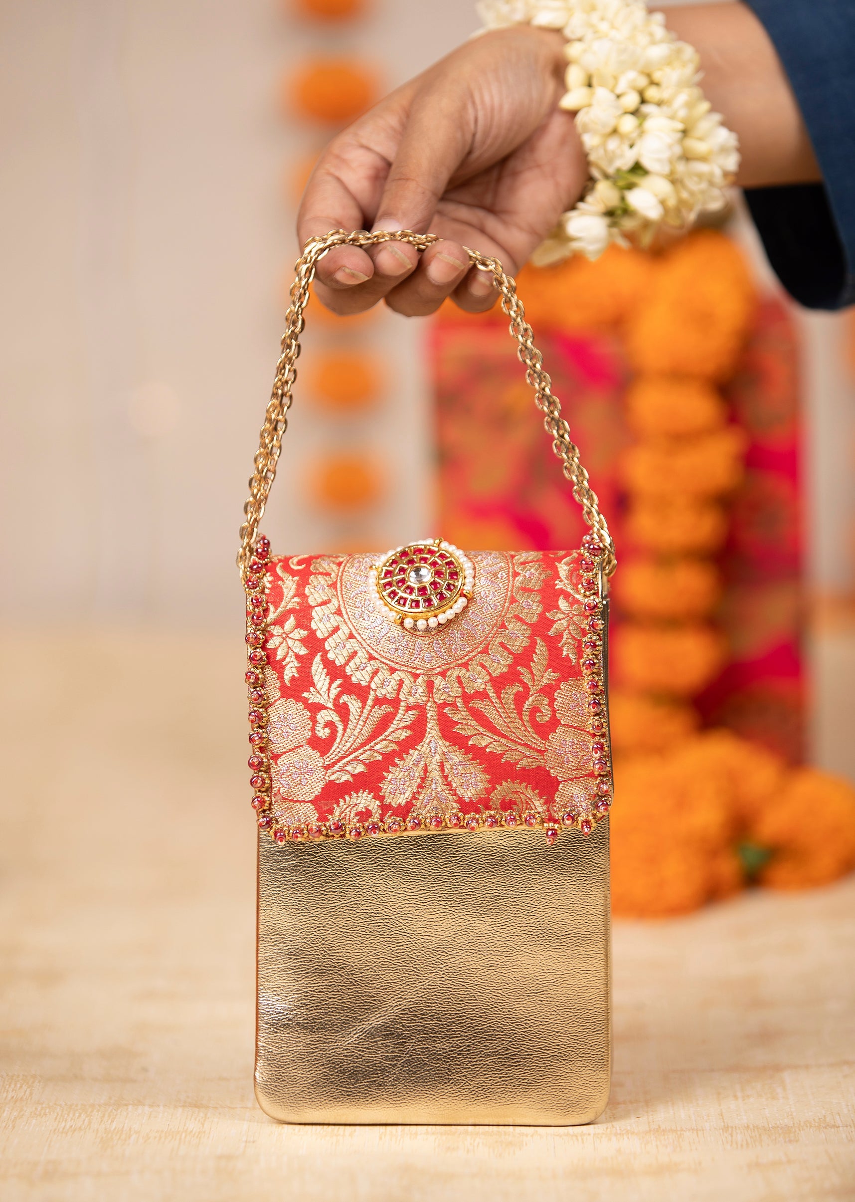 Elevate your festive style with this red and gold flap bag, featuring intricate golden brocade detailing that adds a rich, regal touch. The silk brocade blend and embellished accents create a luxurious finish perfect for weddings, sangeets, and grand celebrations. Compact yet striking, it’s a sophisticated accessory that instantly enhances any ethnic ensemble. Awarded as the Most Trusted Brand, we're delivering styles you love, just as promised.