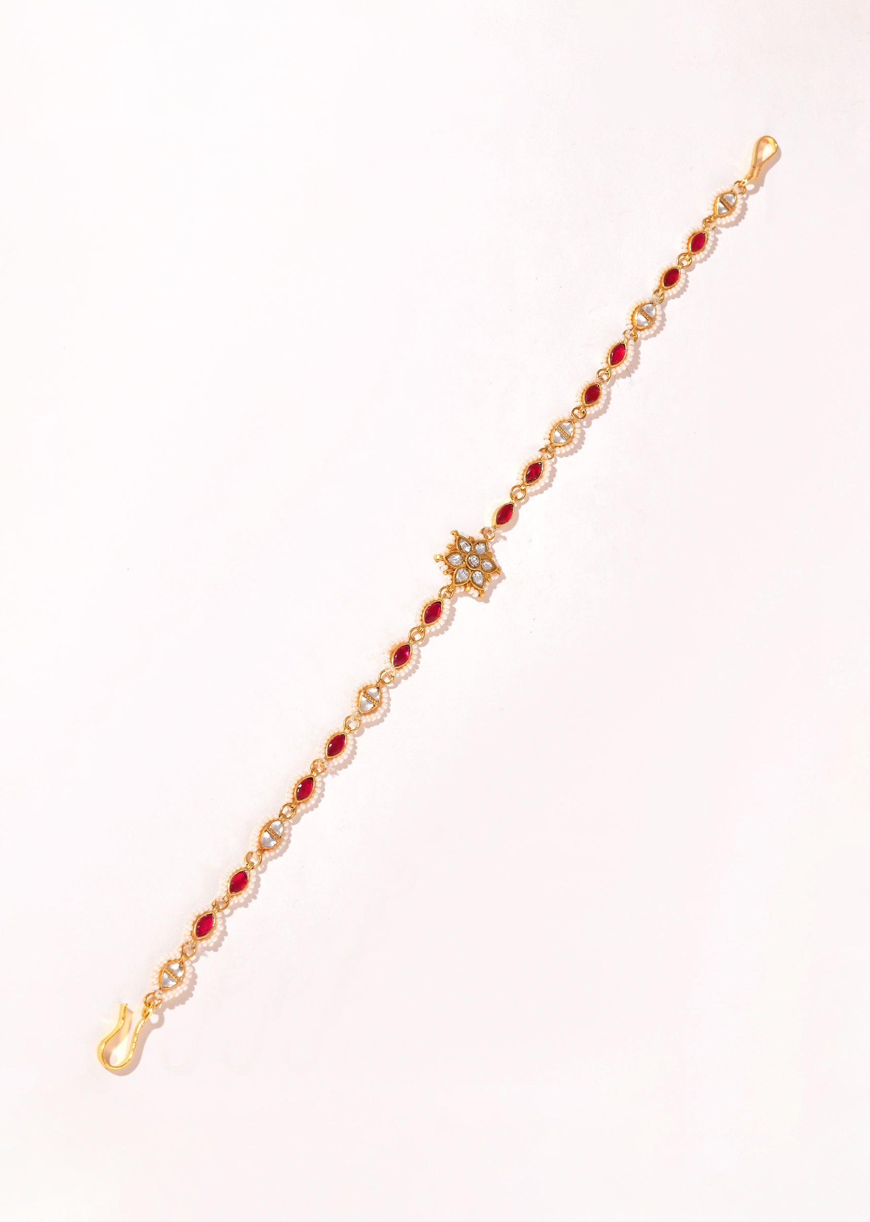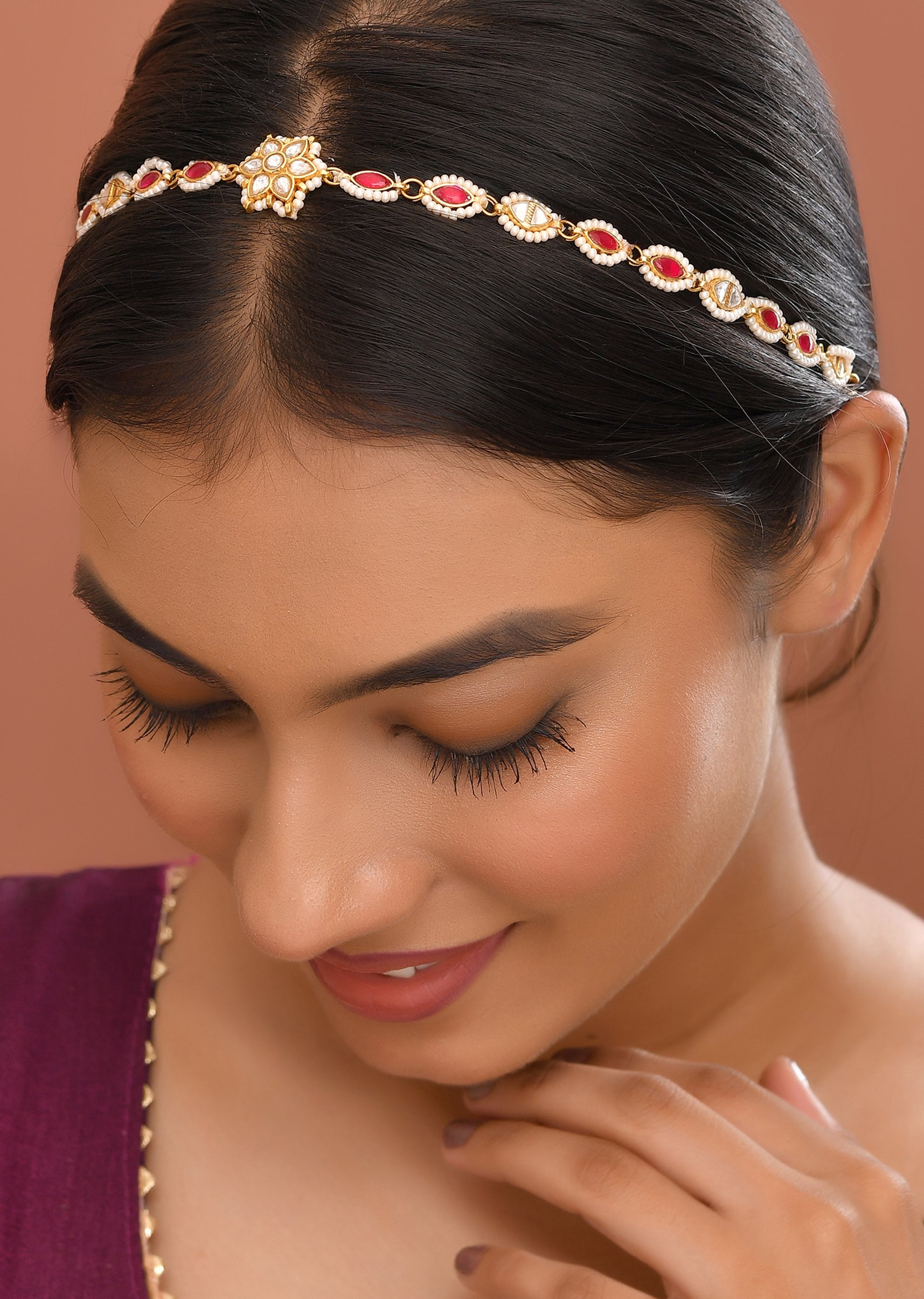This red and gold floral motif Kundan mathapatti dazzles with delicate handcrafted detailing and a soft, regal glow. Its floral accents add a touch of elegance, making it perfect for... More Product Details