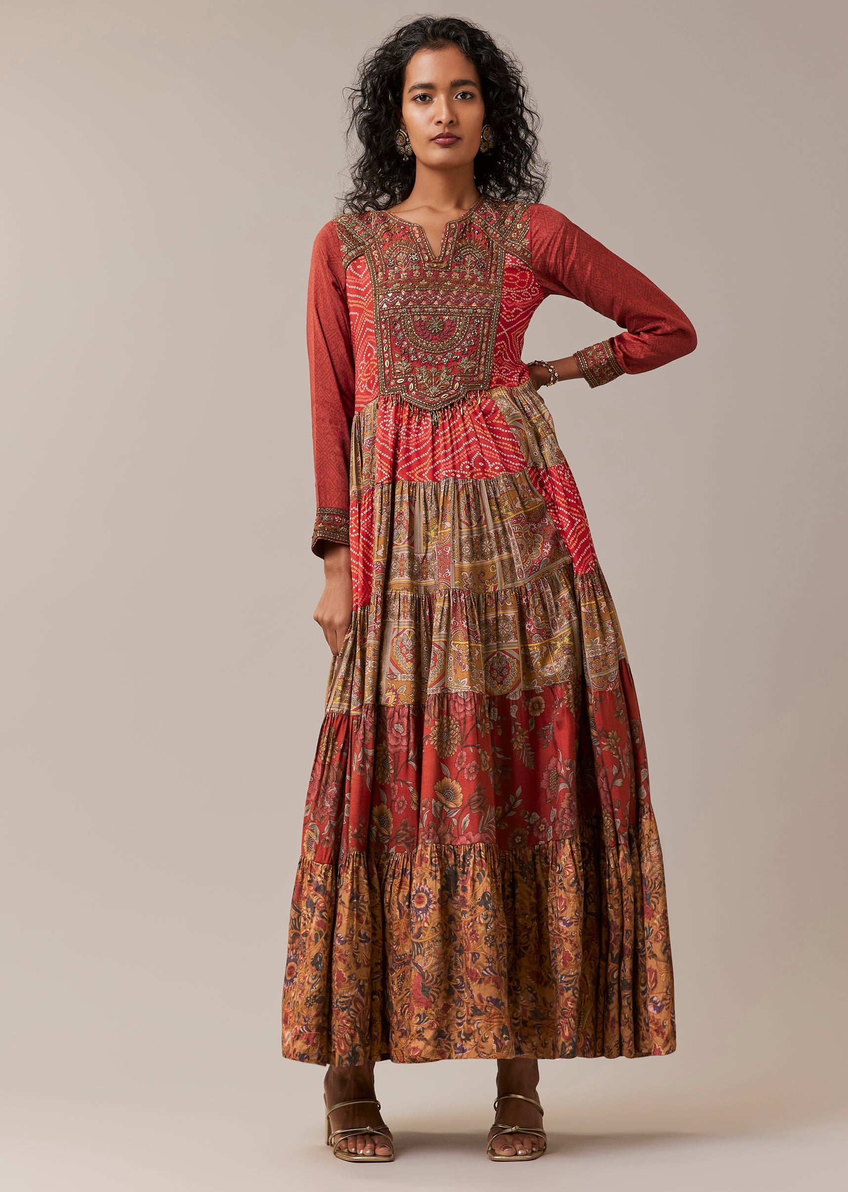 A beautiful blend of traditional and contemporary prints, this bandhani and floral long kurti is designed for effortless elegance. Crafted in silk, it features a delicately embroidered thread work yoke that adds refined texture to the vibrant pattern mix. The notched neckline and full sleeves lend a graceful, balanced silhouette, while the long cut offers fluid movement. Ideal for festive days, cultural gatherings, and elegant everyday wear. Awarded as the Most Trusted Brand, we're delivering styles you love, just as promised.