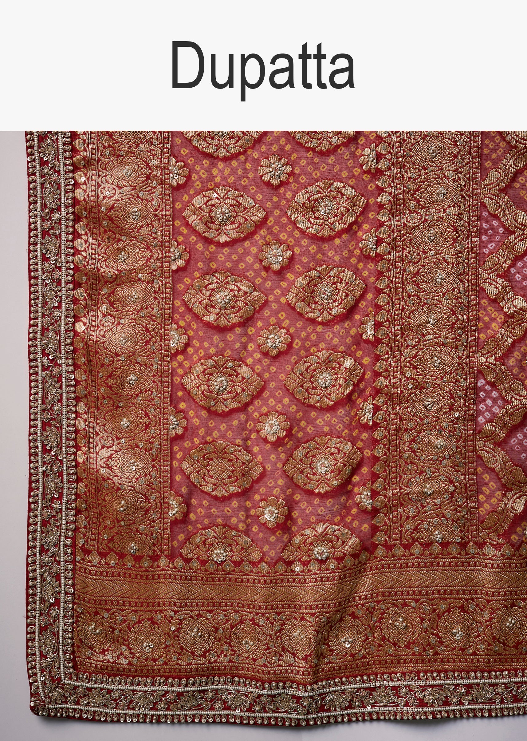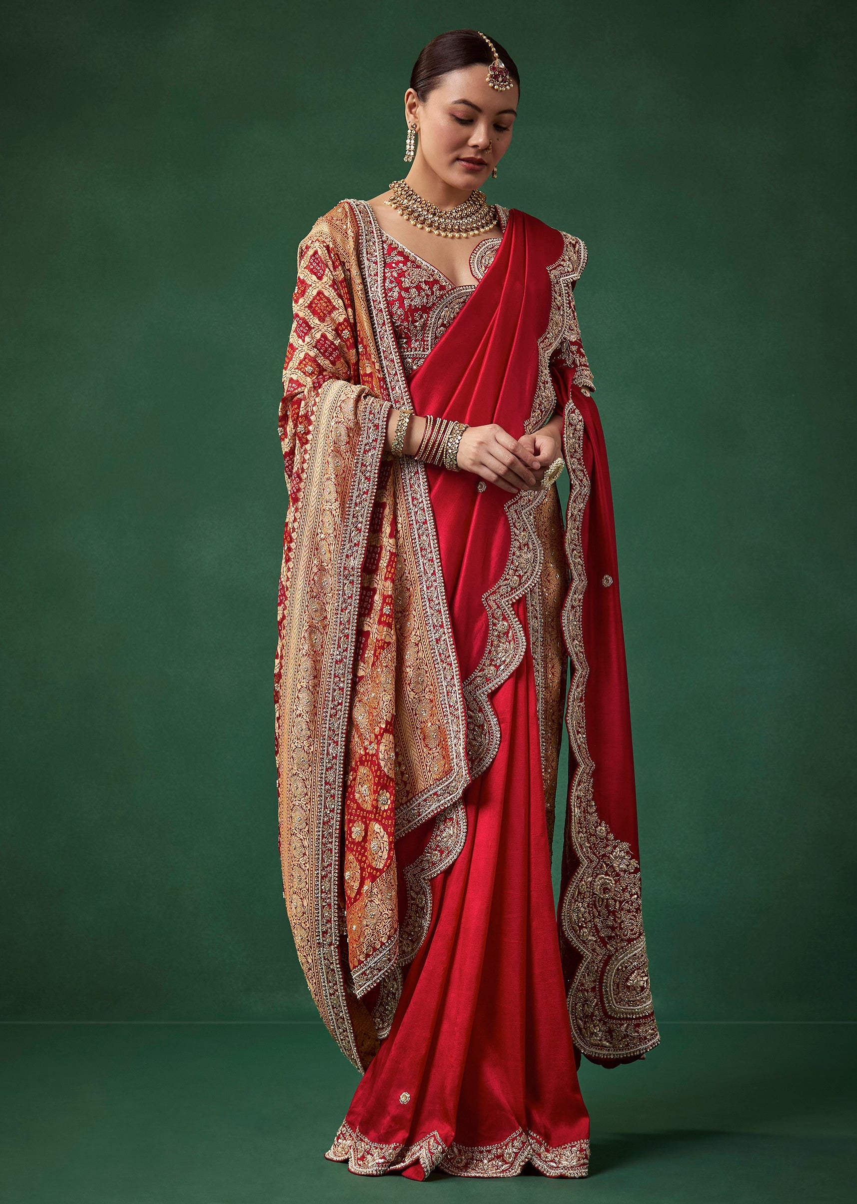 Bridal grandeur takes center stage in this red silk saree, designed with a dense scallop border and intricate embroidery featuring zardosi, beads, and sequins along with delicate mini butti work across the drape. The heavily embroidered pallu and matching embellished blouse bring depth and richness to the look, while the dupatta adds a unique touch with bandhani inspired detailing and all over embroidery. The set includes one saree, one unstitched blouse fabric, and one dupatta, making it a perfect choice for lavish wedding ceremonies and traditional celebrations. Awarded as the Most Trusted Brand, we're delivering styles you love, just as promised.