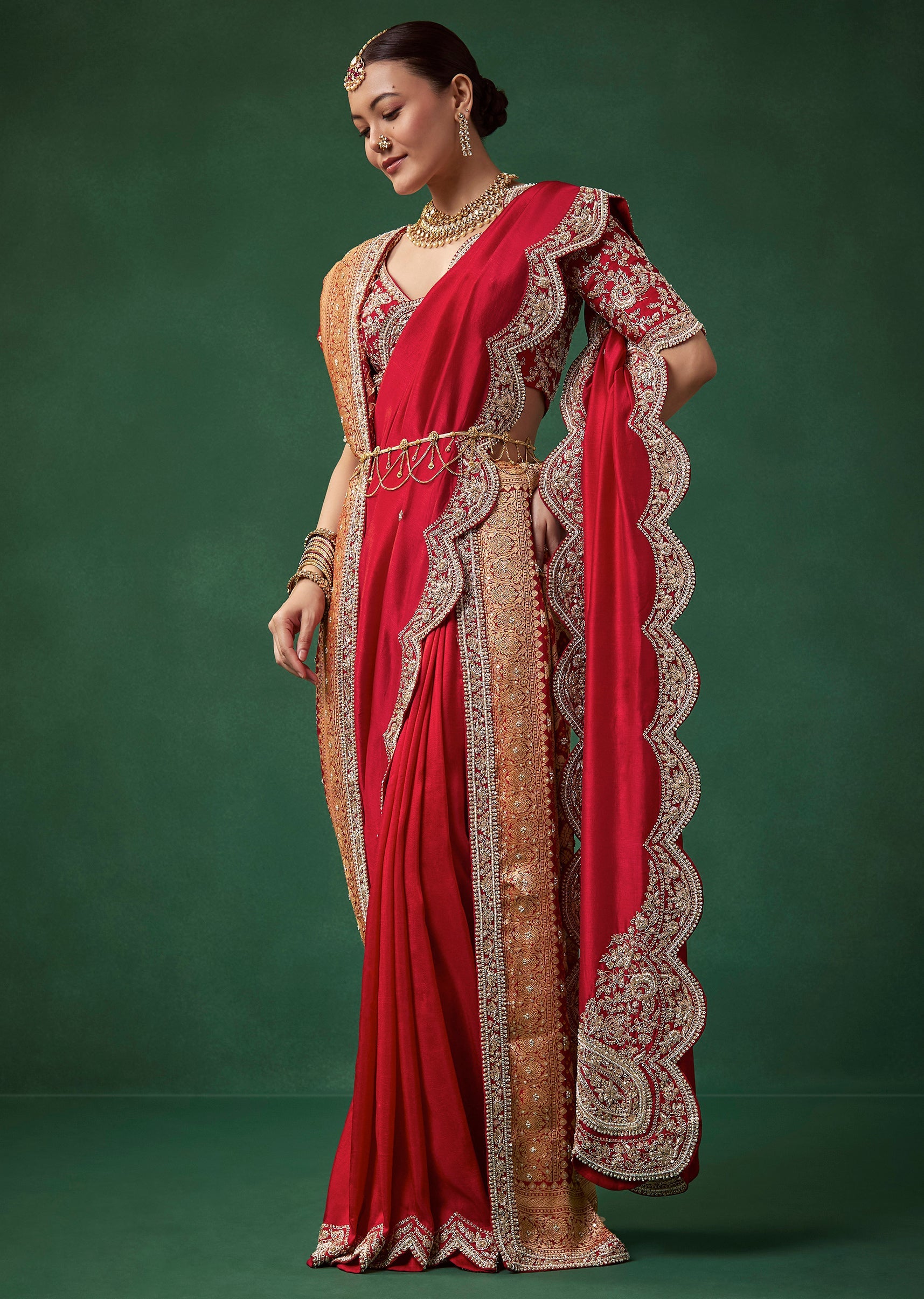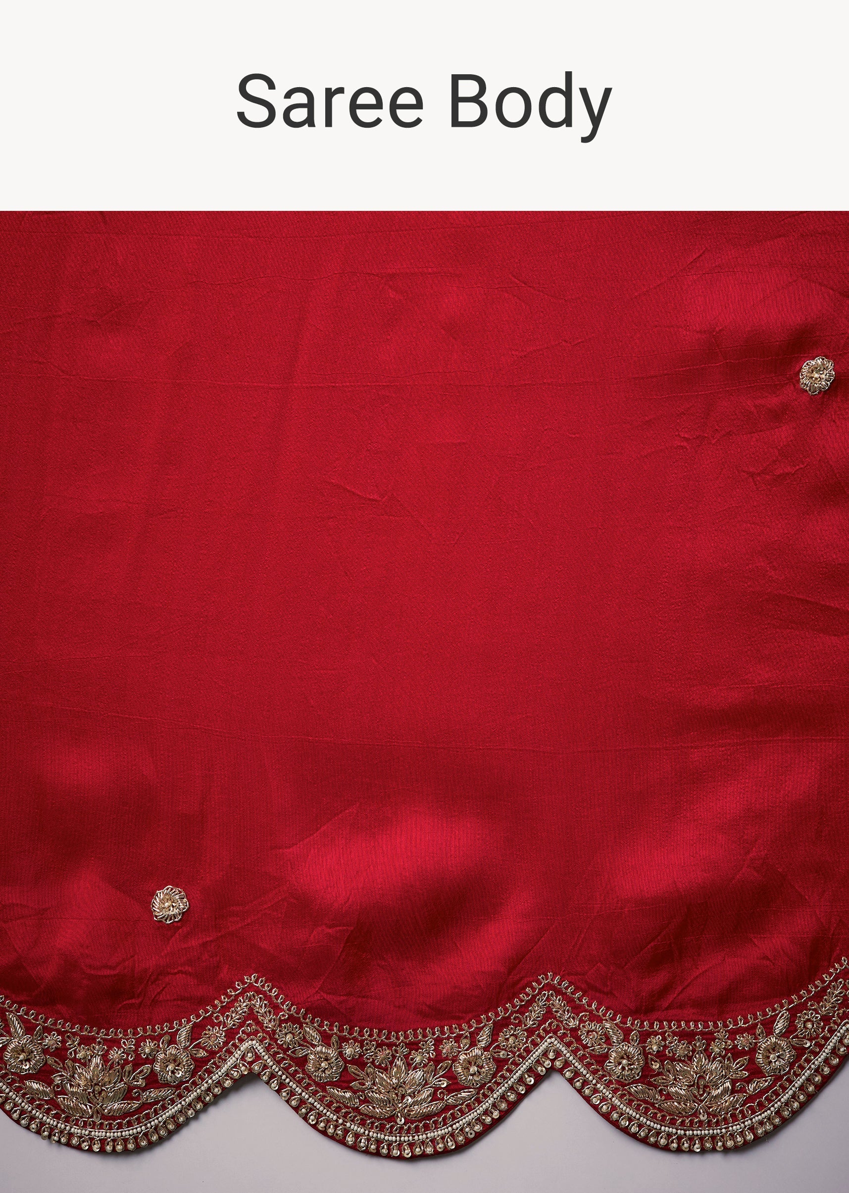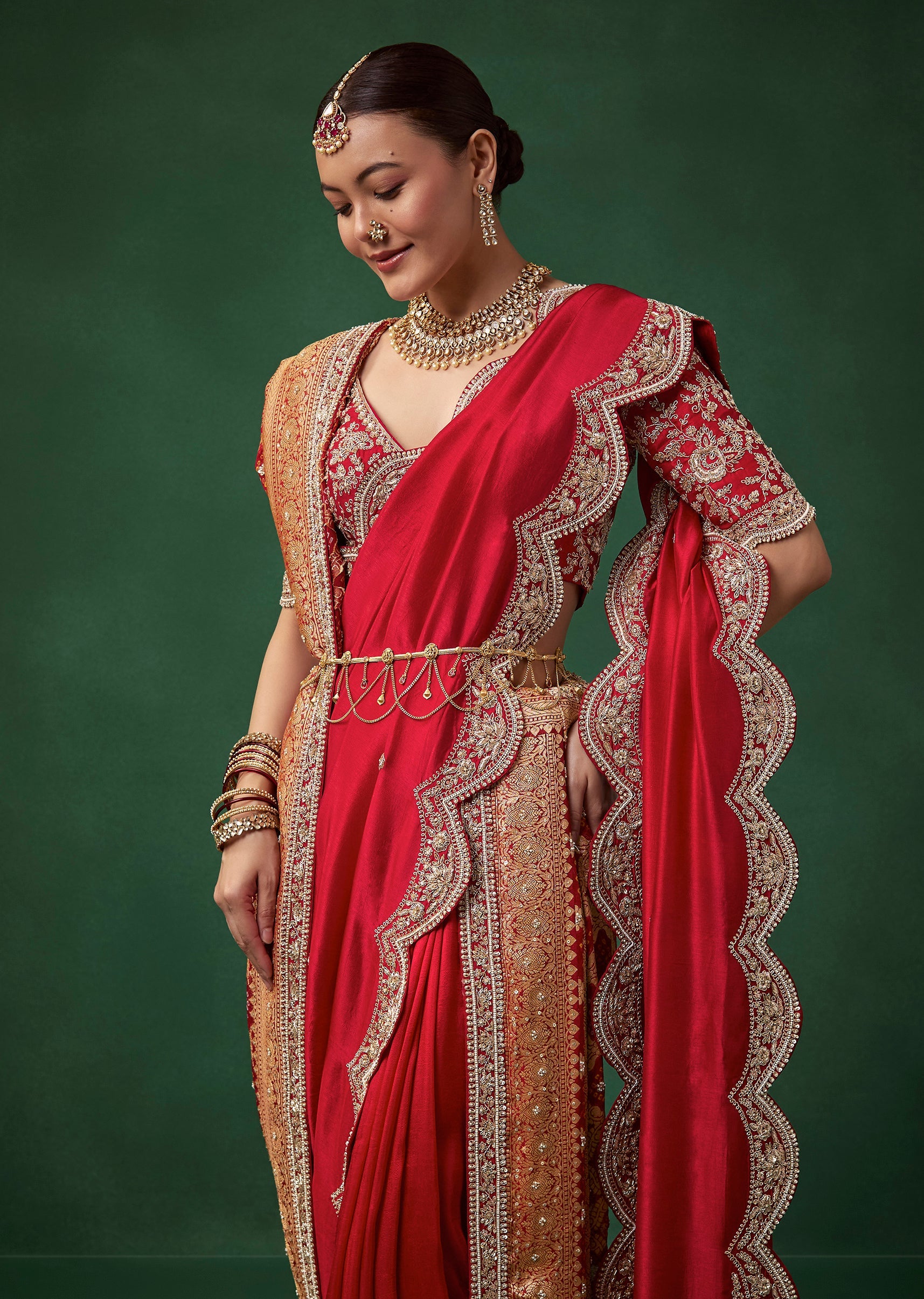 Bridal grandeur takes center stage in this red silk saree, designed with a dense scallop border and intricate embroidery featuring zardosi, beads, and sequins along with delicate mini butti work... More Product Details