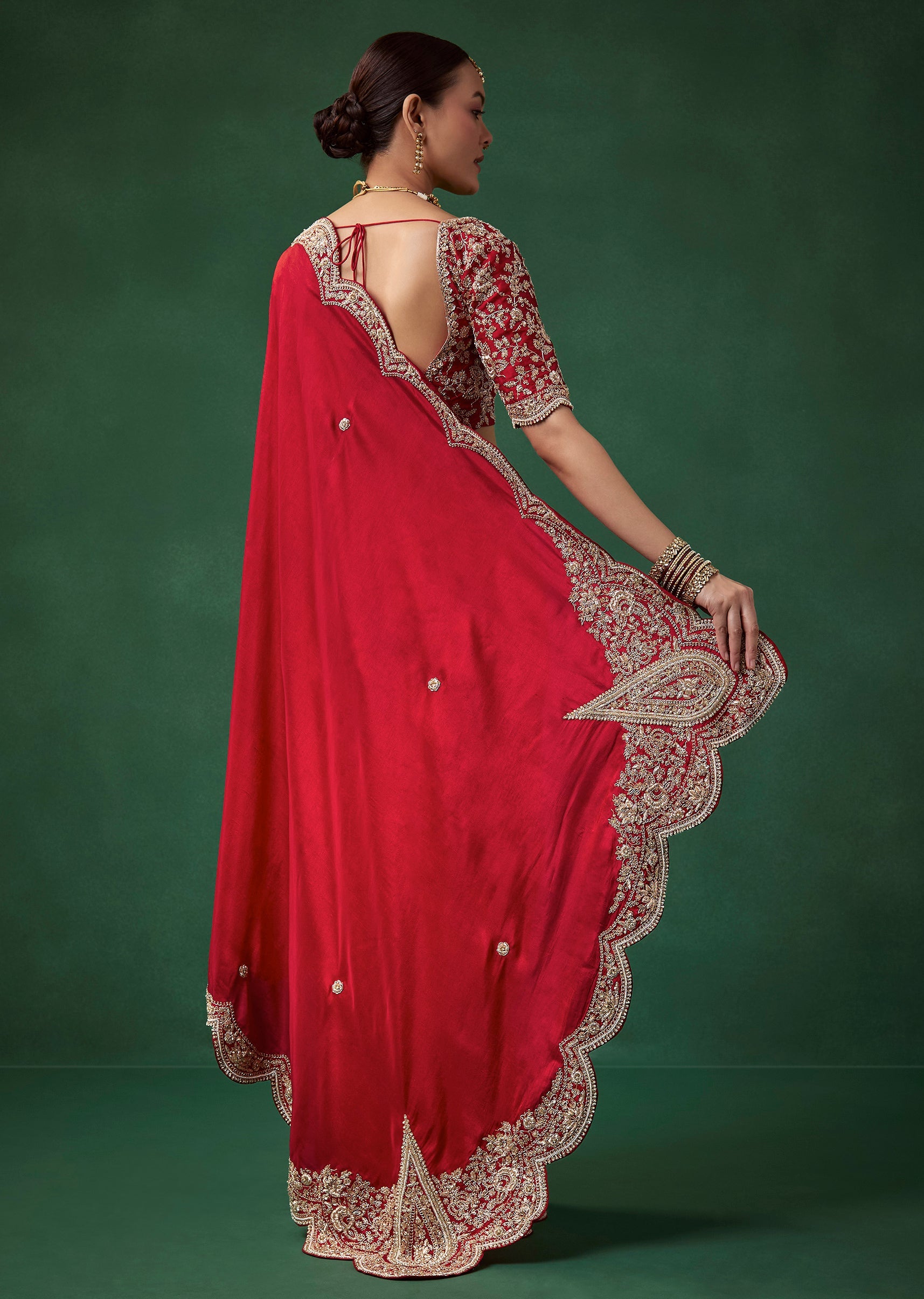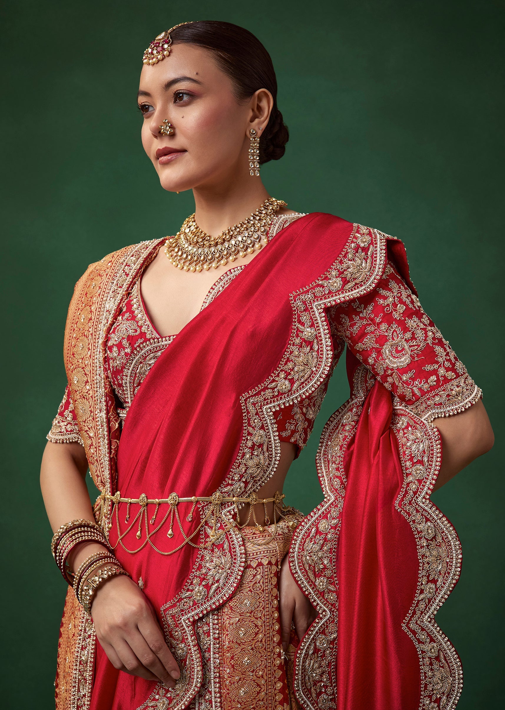 Red Bridal Silk Zardozi Saree with Unstitched Blouse and Dupatta