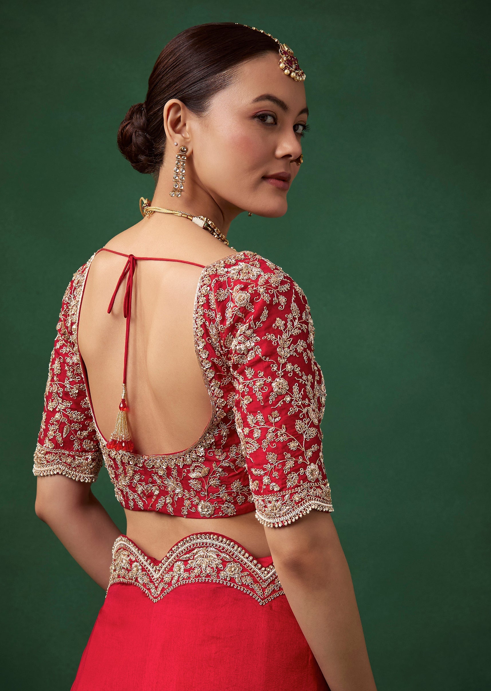 Pair it with classic kundan or temple jewelry, a neatly styled bridal bun, and bold glowing makeup to enhance its royal red appeal.