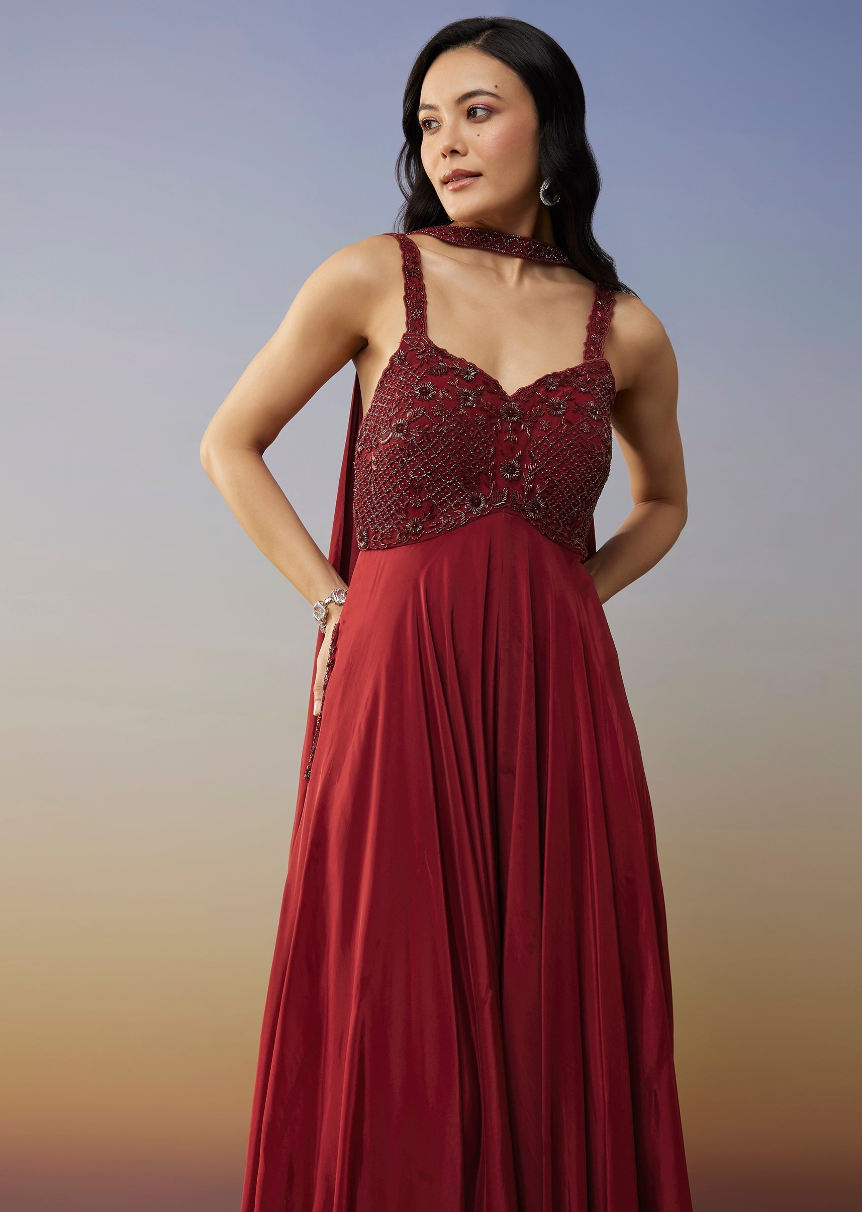 This red jumpsuit brings a bold contemporary charm perfect for sangeet and cocktail celebrations. Crafted in a fluid crepe fabric it features delicate cut dana work that adds a festive... More Product Details