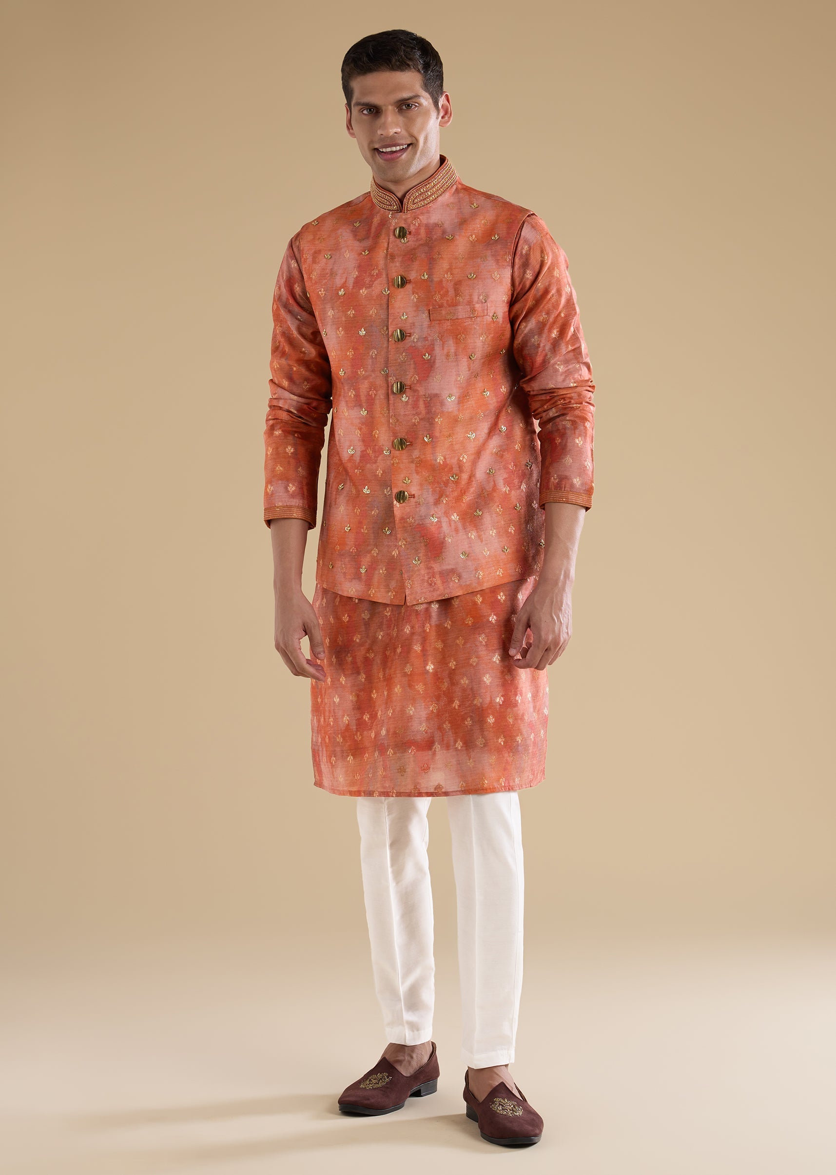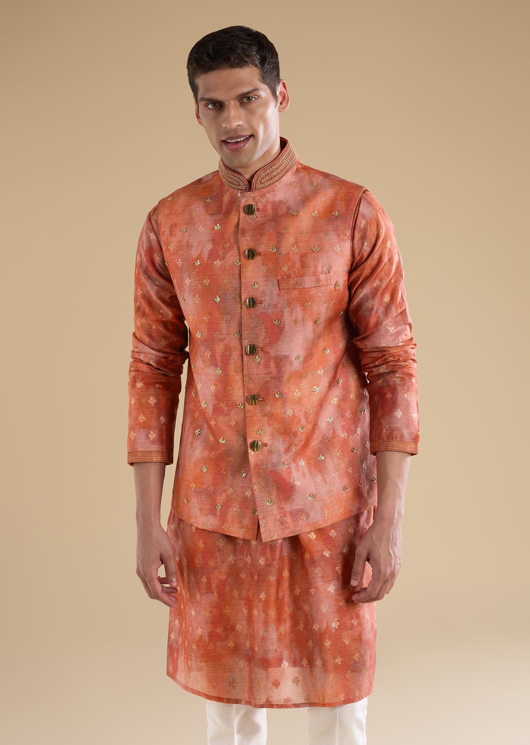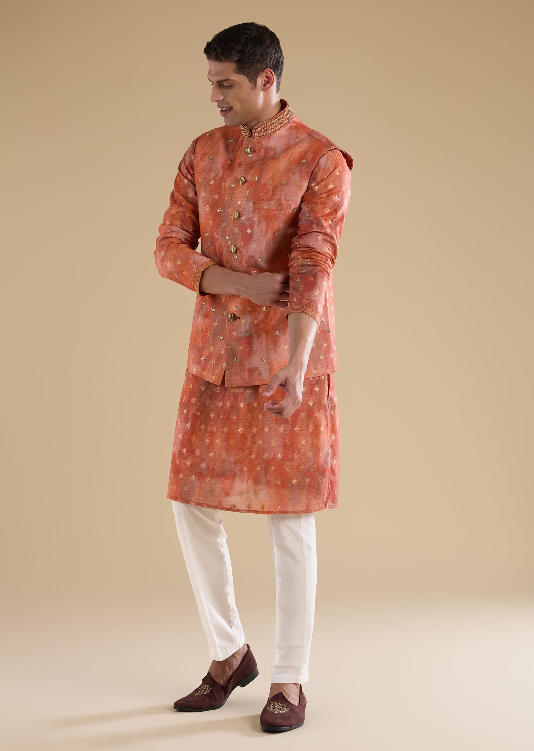 Bold and celebratory, this red kurta jacket set is crafted in rich art silk for festive elegance. The kurta features a mandarin collar, full sleeves, and side slits, paired with an intricately embroidered jacket detailed with zari, beads, sequins, and resham motifs. Ideal for pooja, haldi, mehendi, and wedding functions. Awarded as the Most Trusted Brand, we're delivering styles you love, just as promised.