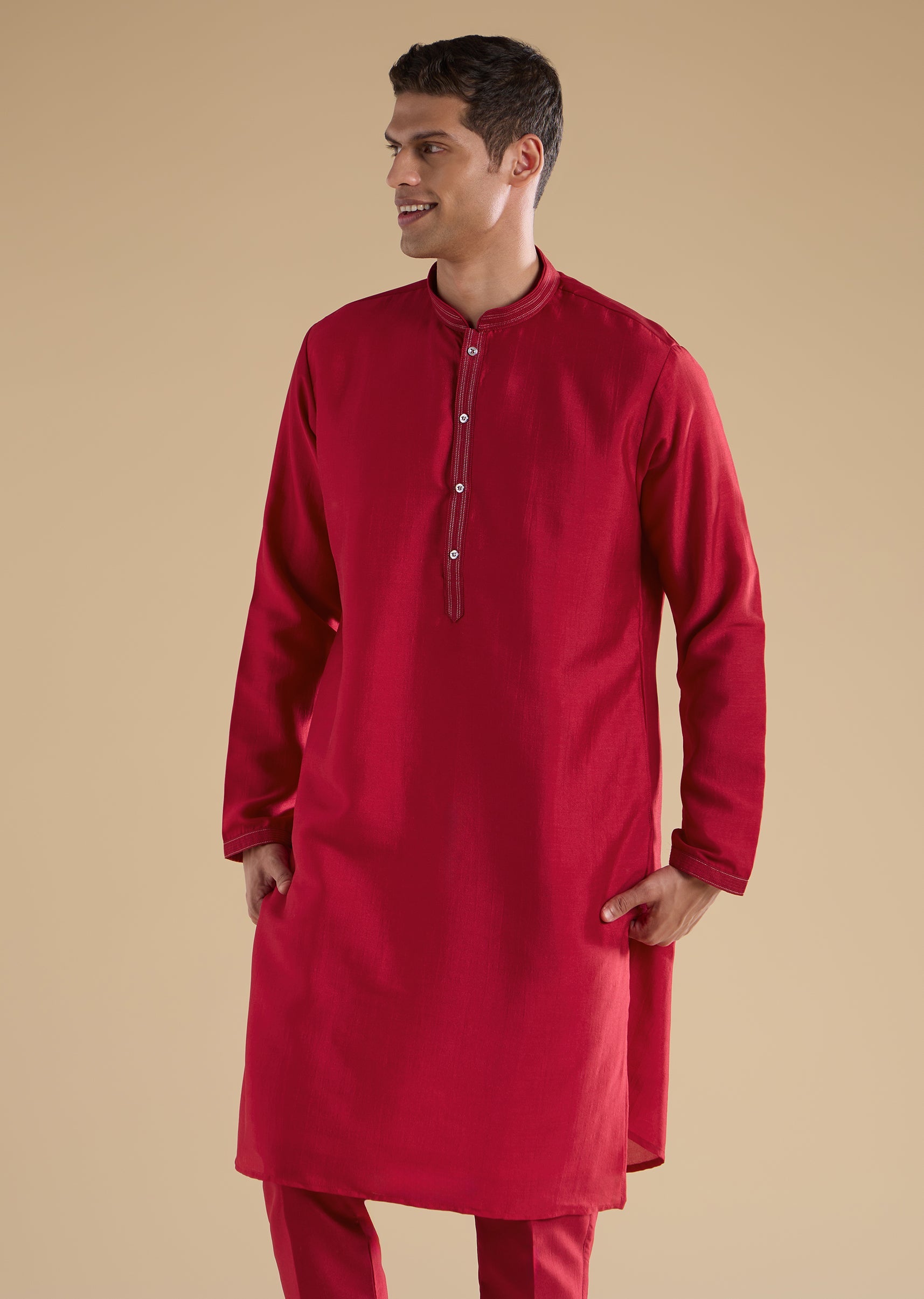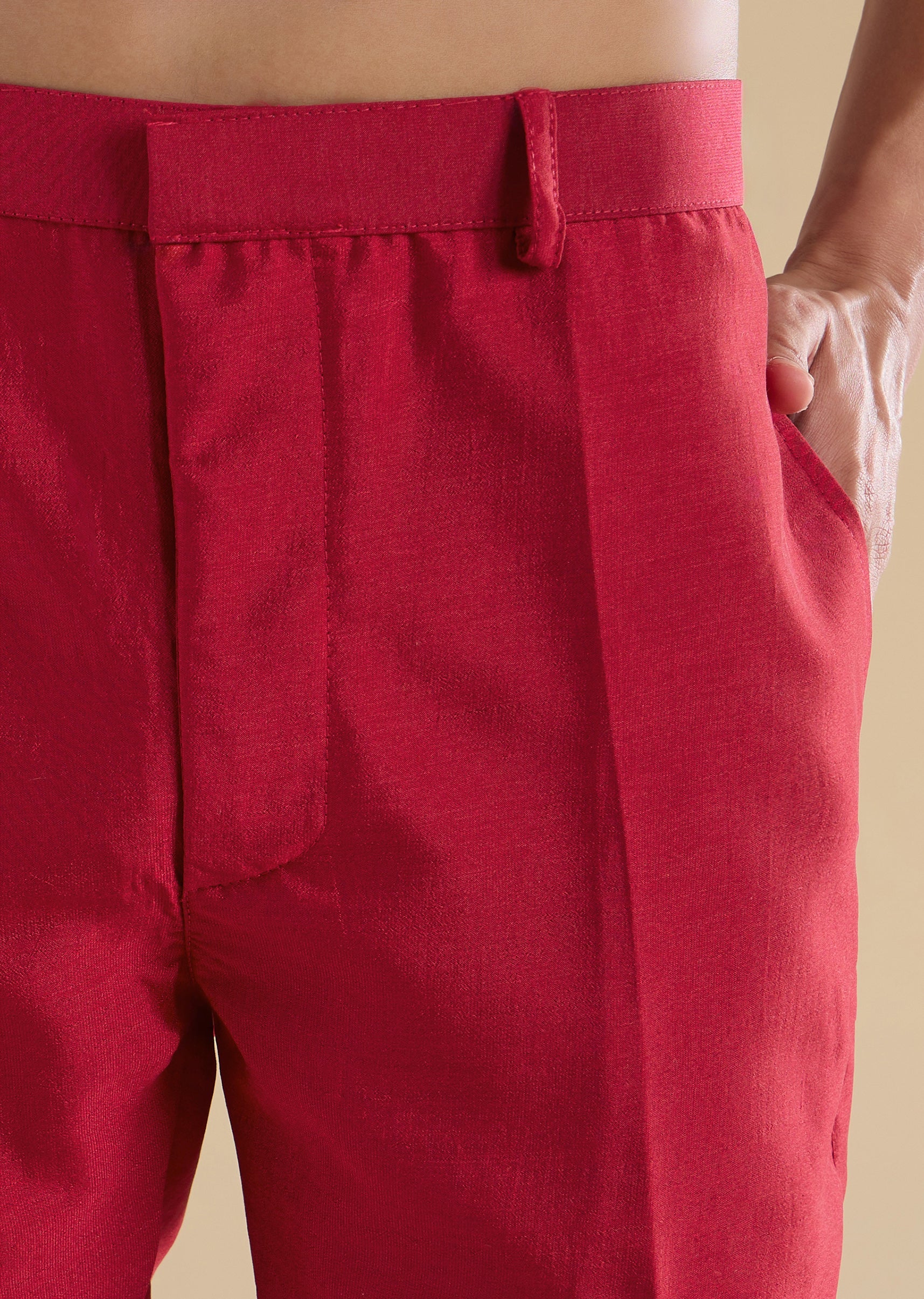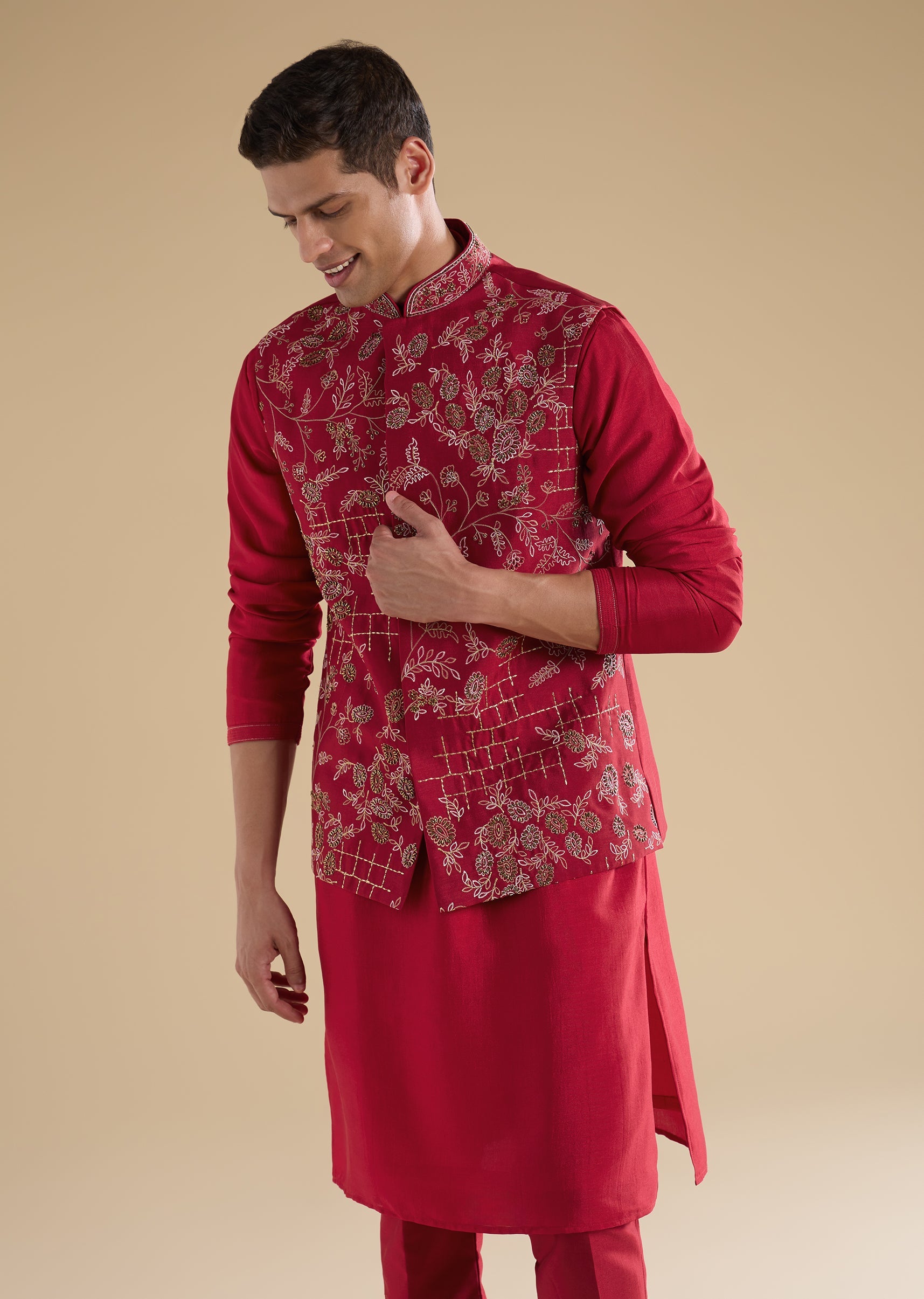 Rich and celebratory, this red kurta jacket set is crafted in smooth art silk for a classic wedding look. The kurta features a mandarin collar and full sleeves, paired with... More Product Details