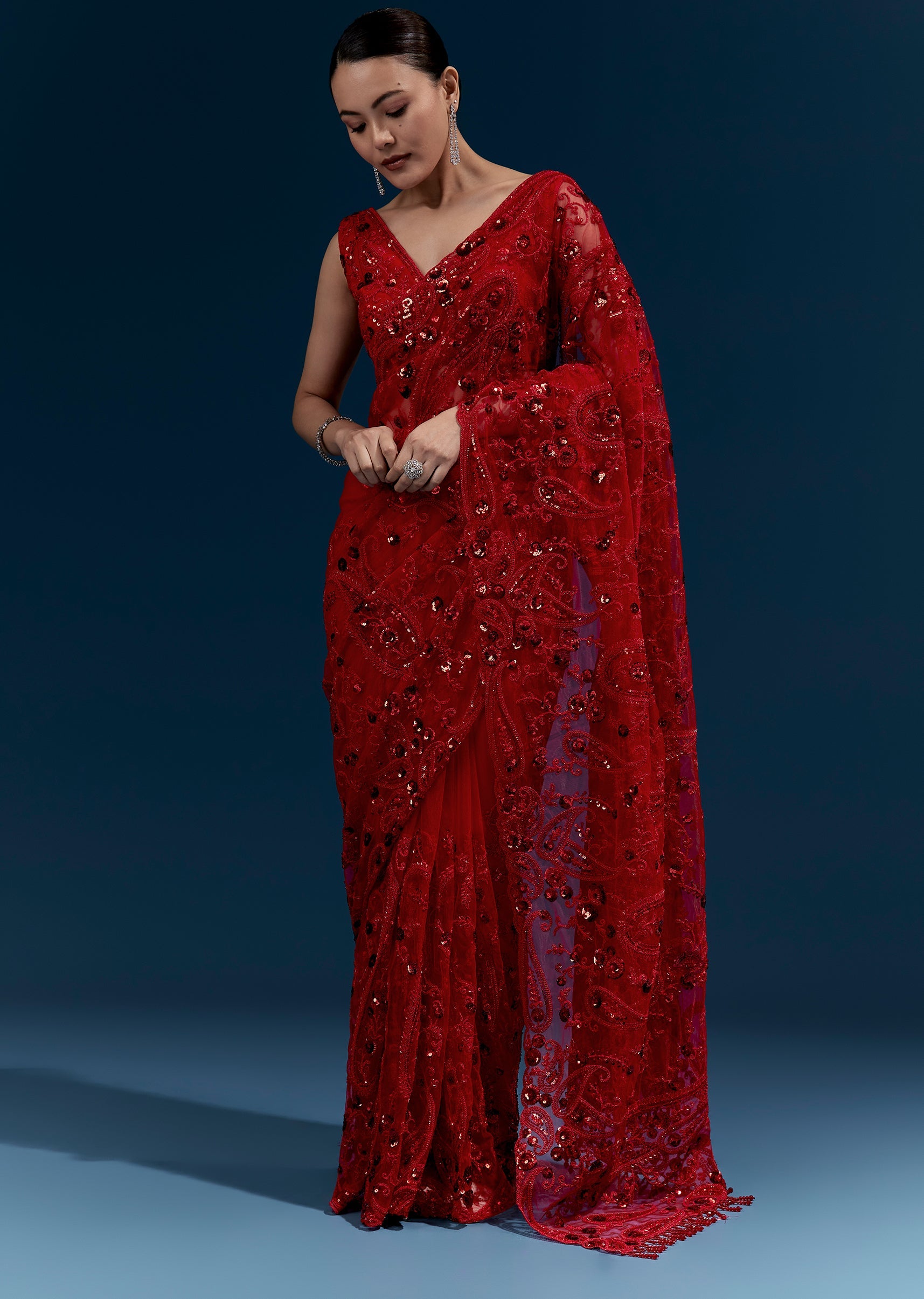Fit Tips:Net sarees look best with a fitted petticoat and pinned pallu for structure.