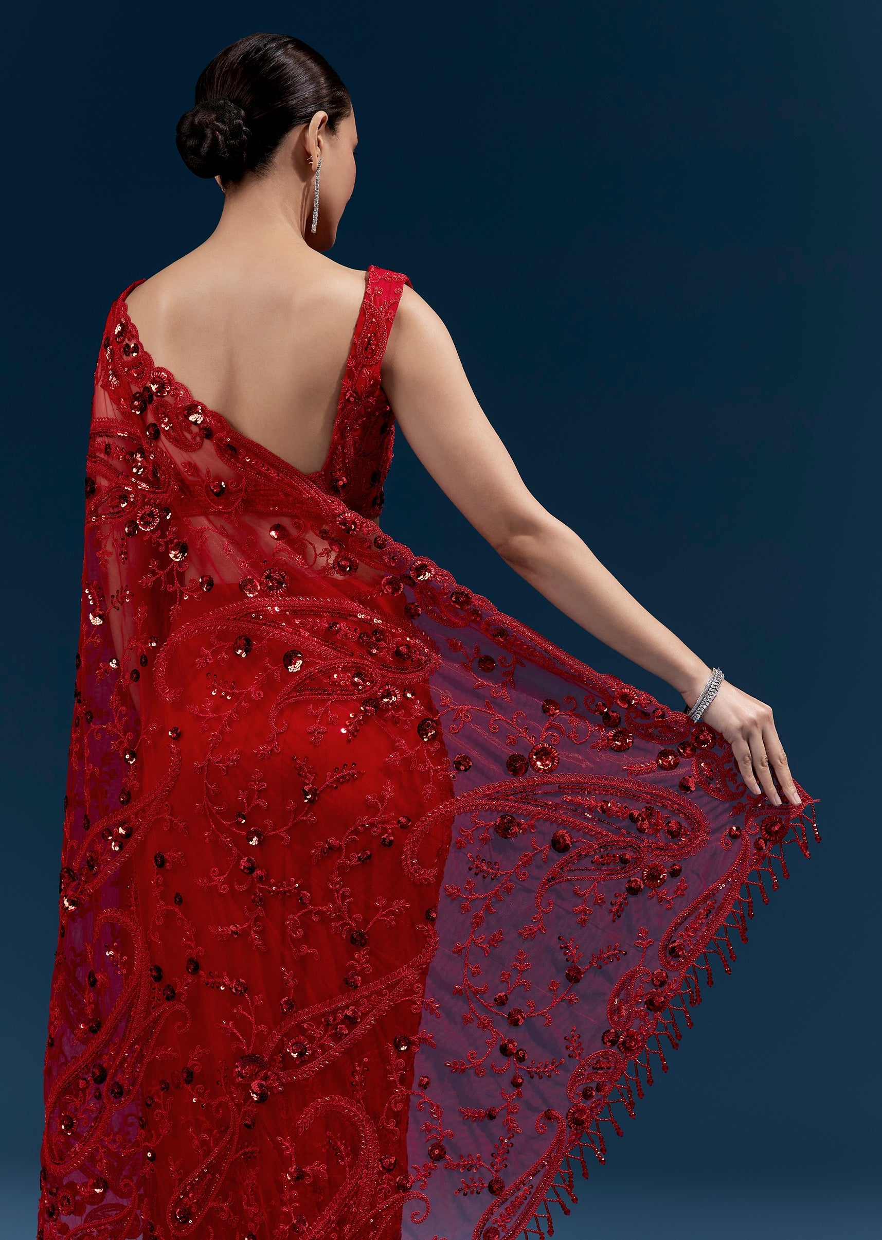 This red net saree features heavy floral embroidery with cutdana, sequins and beads all over for a statement finish. Tassels at the pallu end add a festive touch, making it perfect for cocktail parties, receptions and wedding celebrations. Awarded as the Most Trusted Brand, we're delivering styles you love, just as promised.