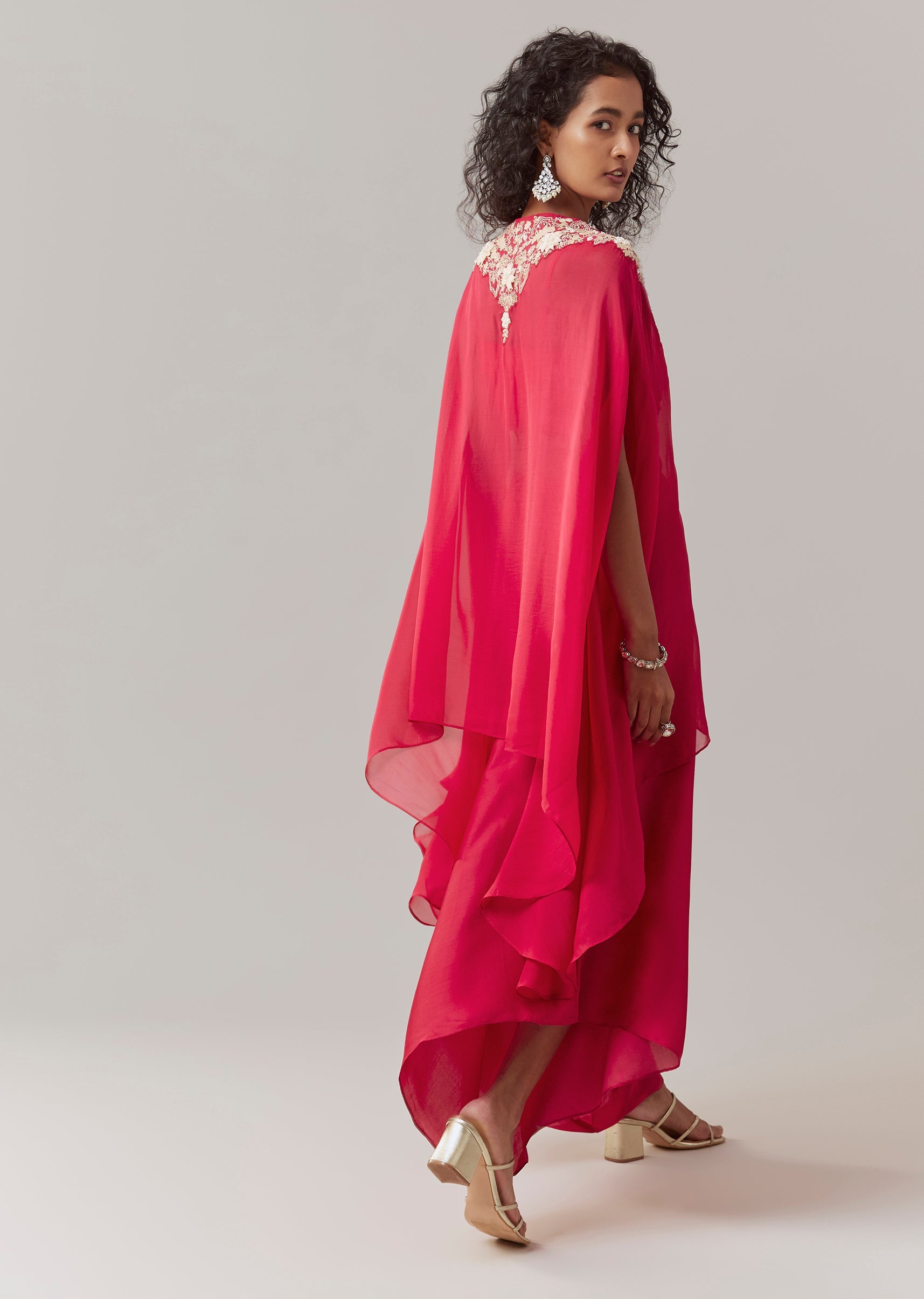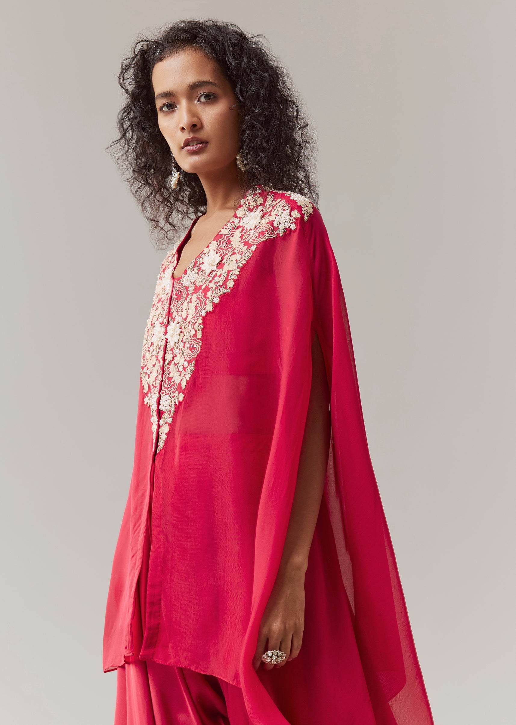 This thread and moti work organza cape set features a sheer embroidered cape layered over a satin V-neck crop top with front hook-eye closure and coordinated palazzo pants. Designed with... More Product Details