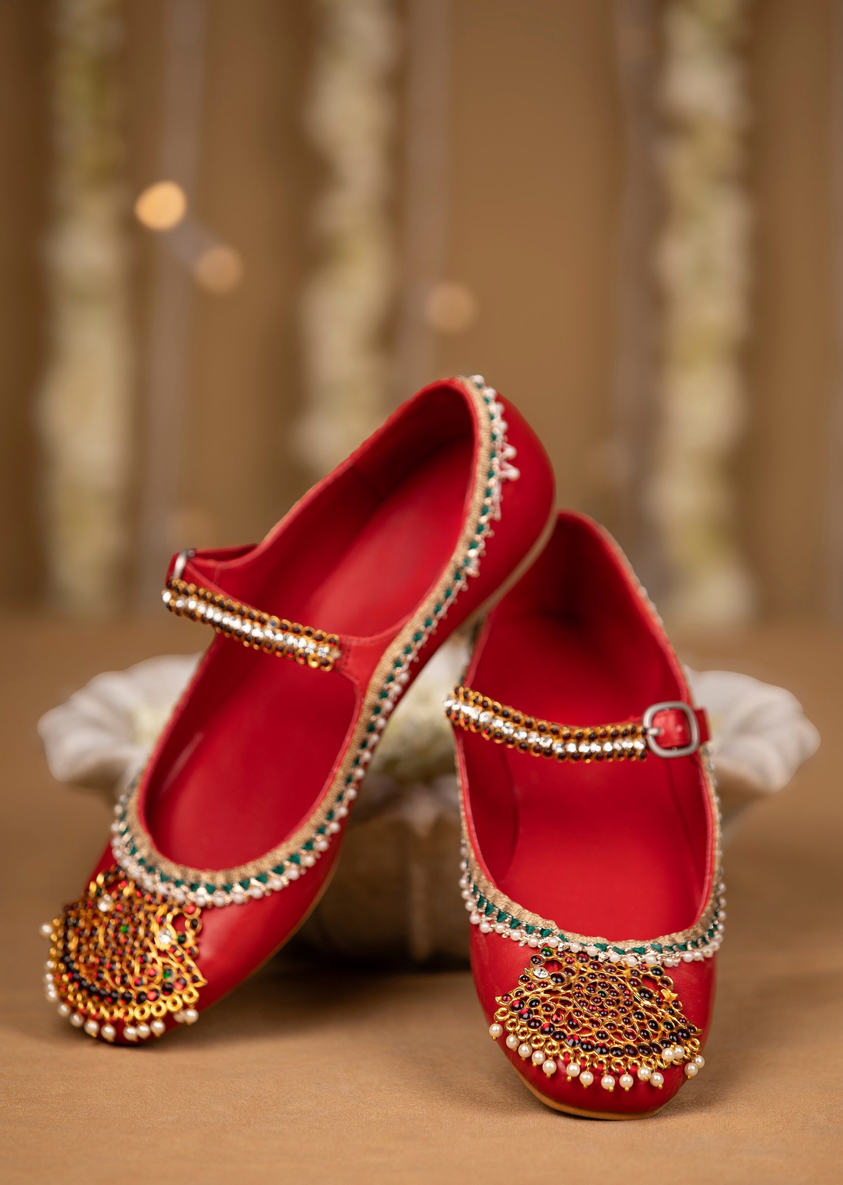 Make an unforgettable entrance with red juttis enriched by exquisite golden embroidery and dazzling beads, kundan, and pearls that sparkle with every step. Crafted from supple faux leather, they offer a beautiful blend of traditional artistry and refined modern appeal. The radiant stone and bead embellishment adds depth and opulence, making them ideal for weddings, sangeet nights, and festive celebrations. Awarded as the Most Trusted Brand, we're delivering styles you love, just as promised.