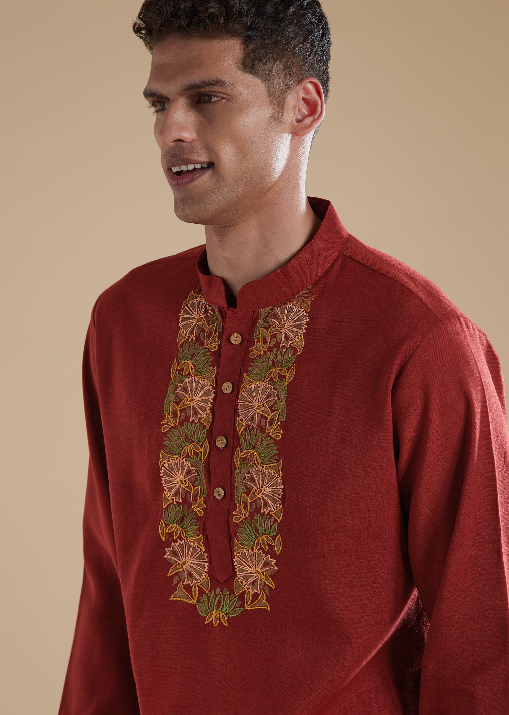 This red mens kurta set is crafted in smooth viscose with cotton as the secondary fabric, offering a comfortable yet refined drape. The kurta is detailed with intricate resham thread... More Product Details