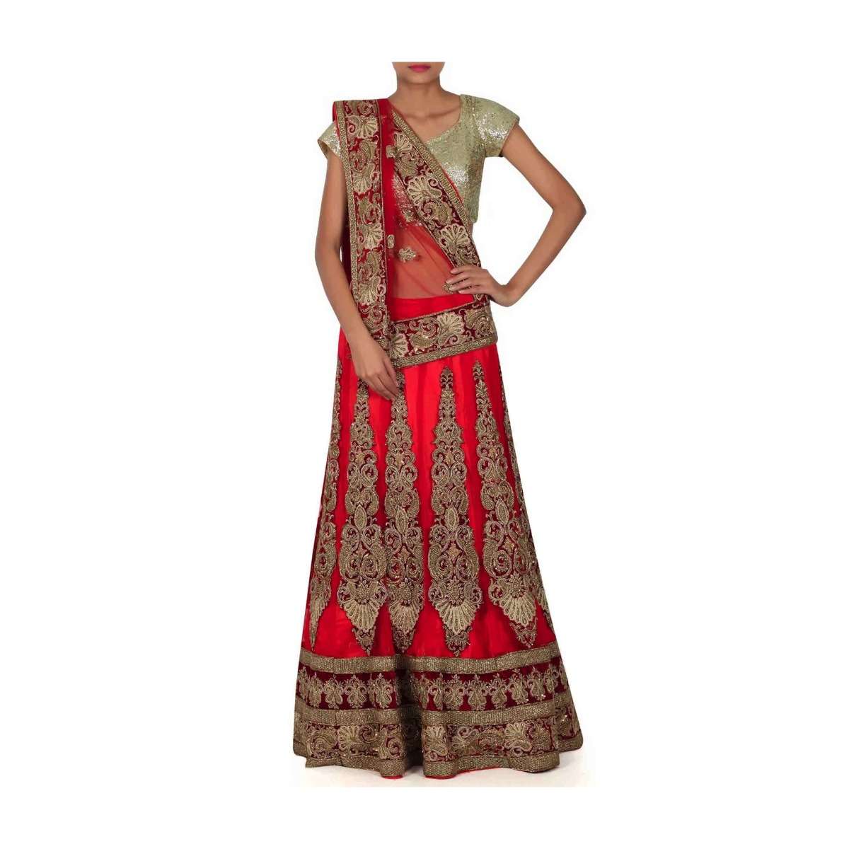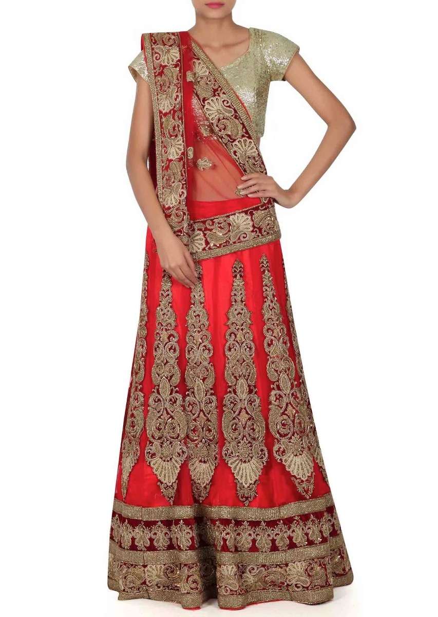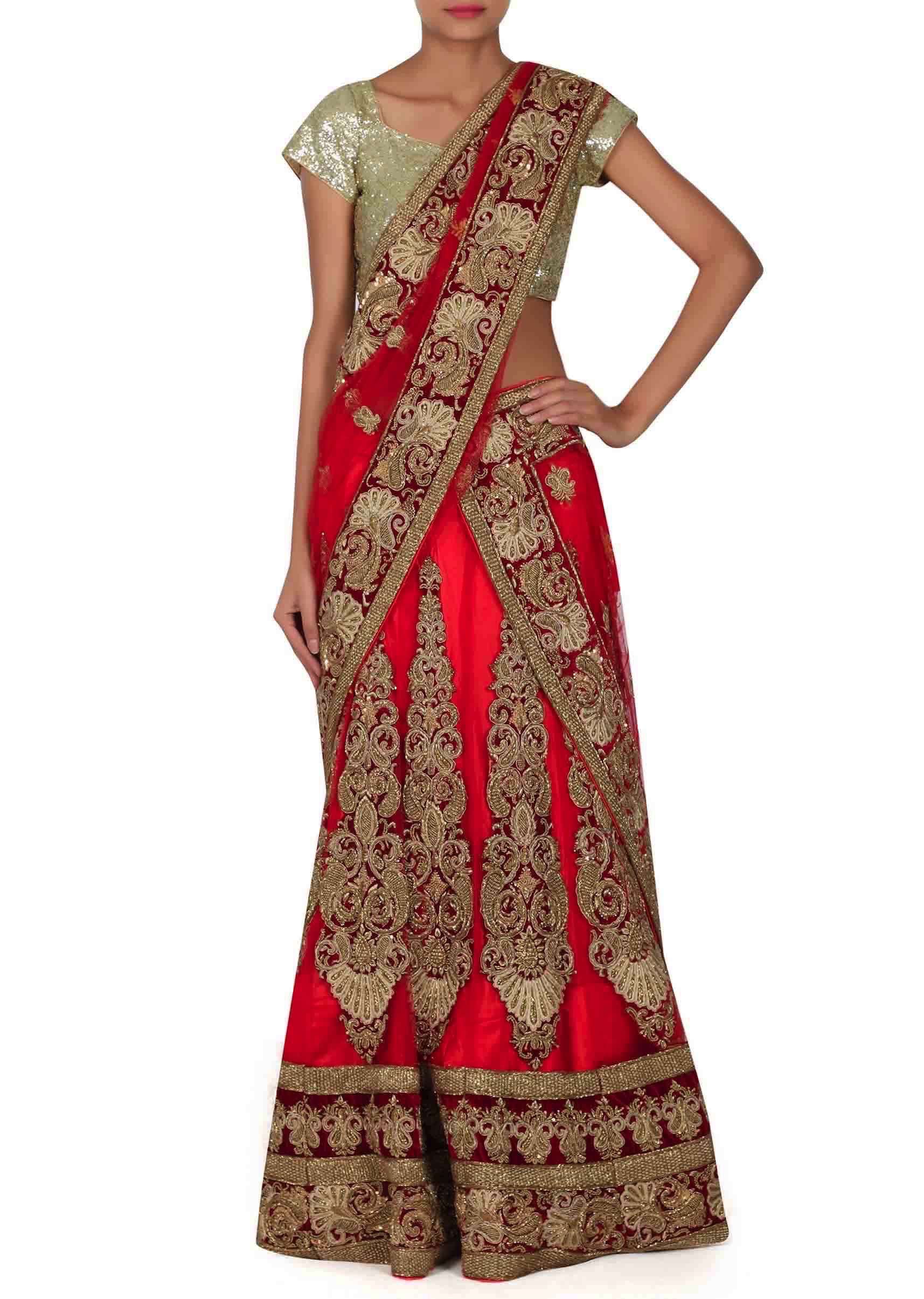 Red Lehenga Choli In Semi Stitched Form With Zardozi Patch Work Online - Kalki Fashion