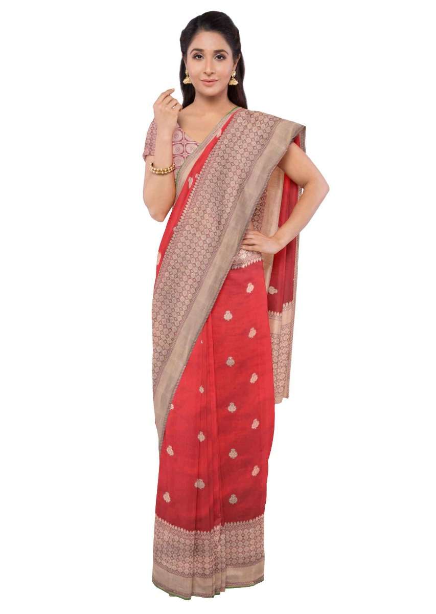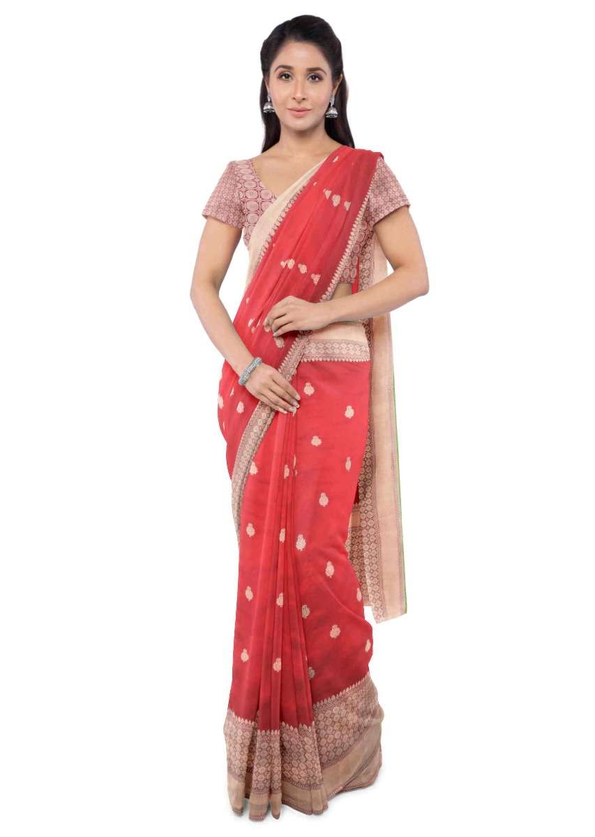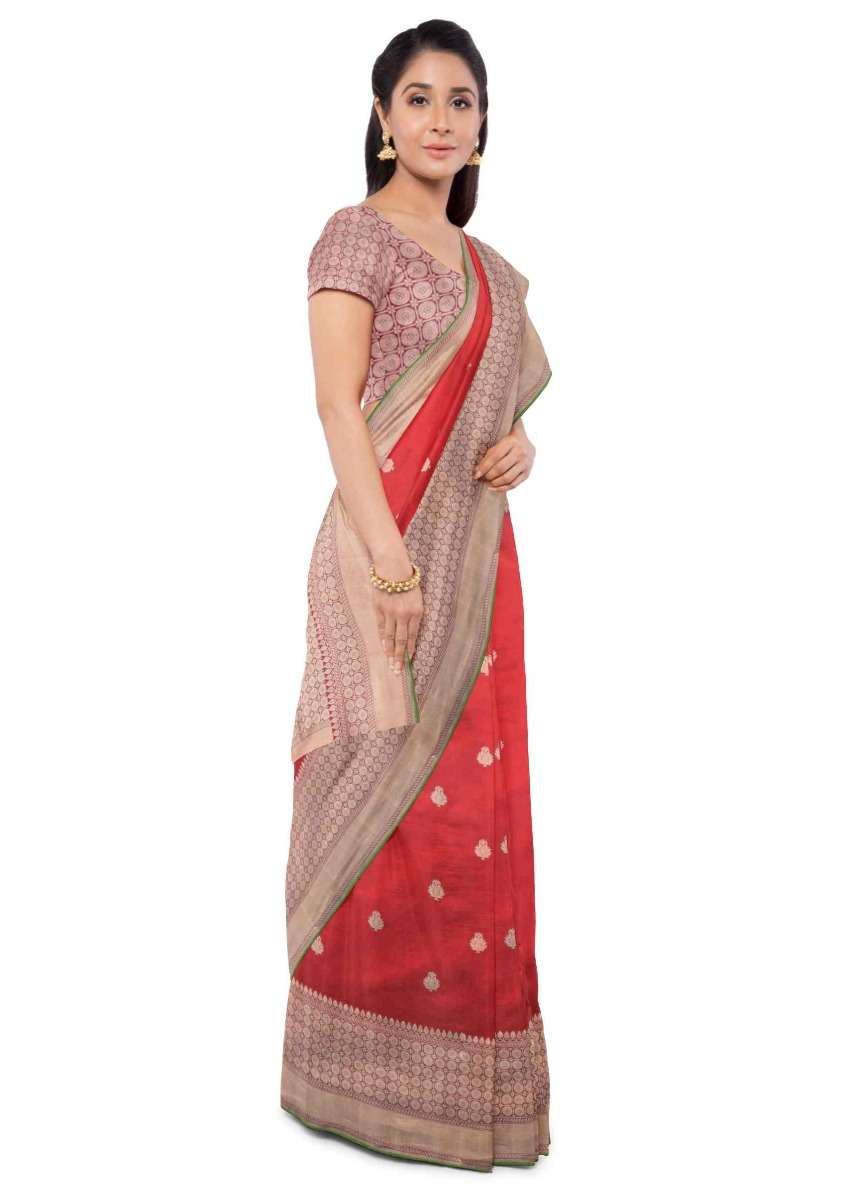 Red Orange Banarasi Silk Saree With Matching Brocade Blouse Piece Online - Kalki Fashion