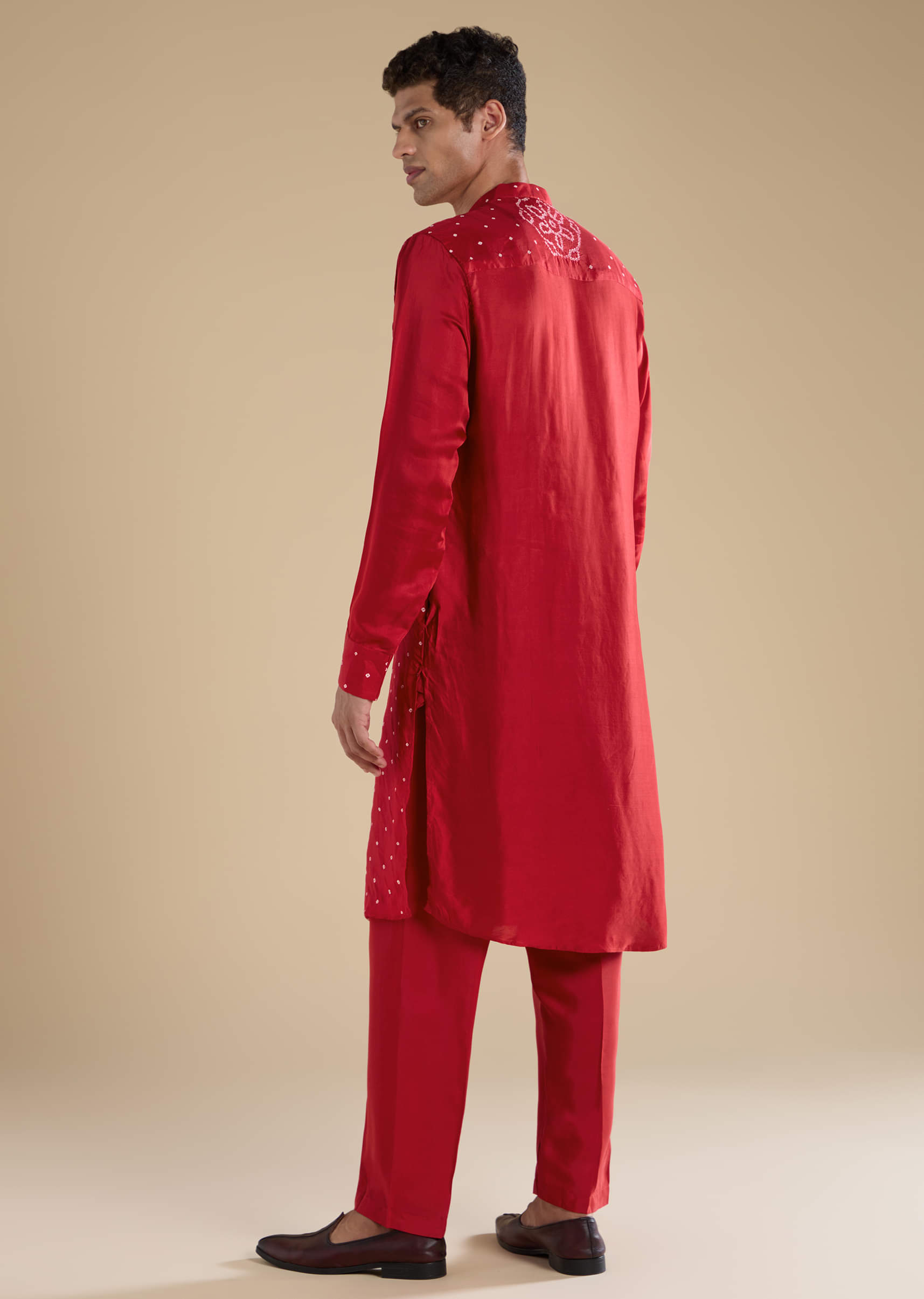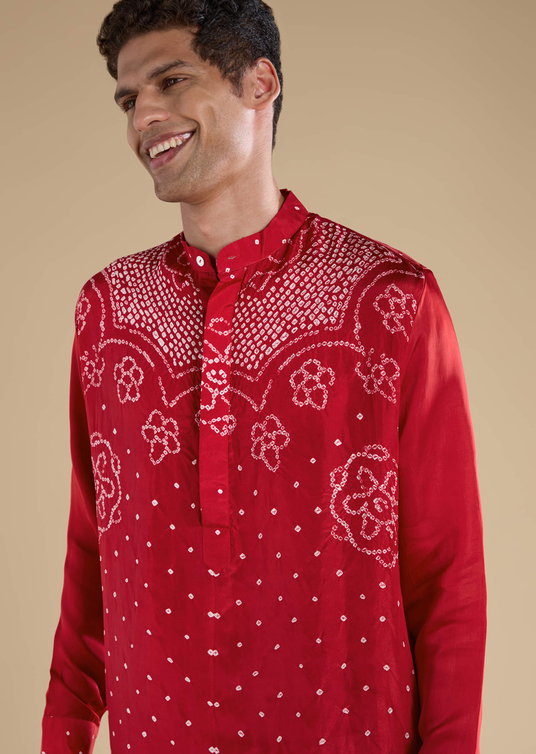 Red Pure Bandhani Silk Mens Straight Kurta Pant Set