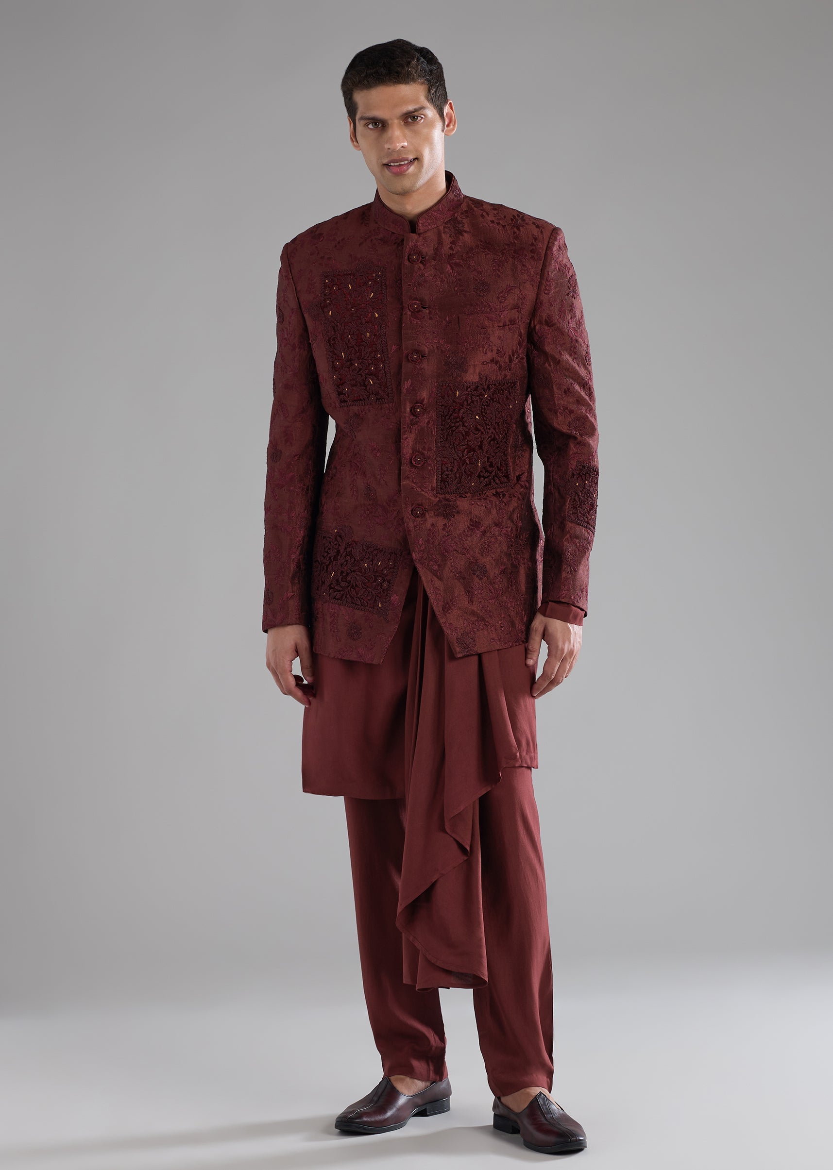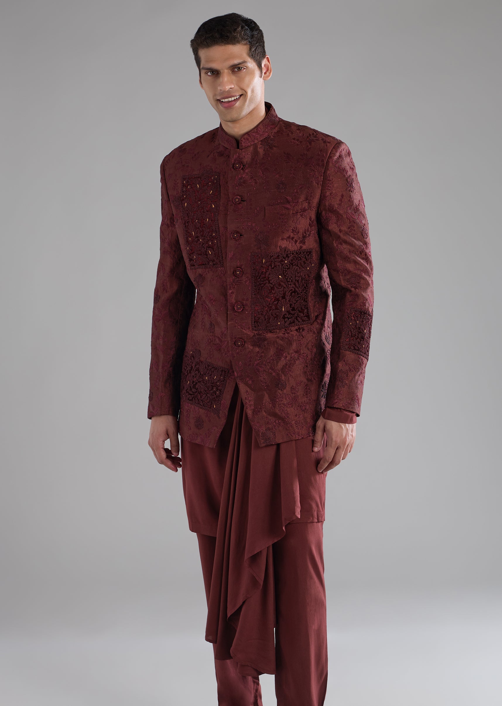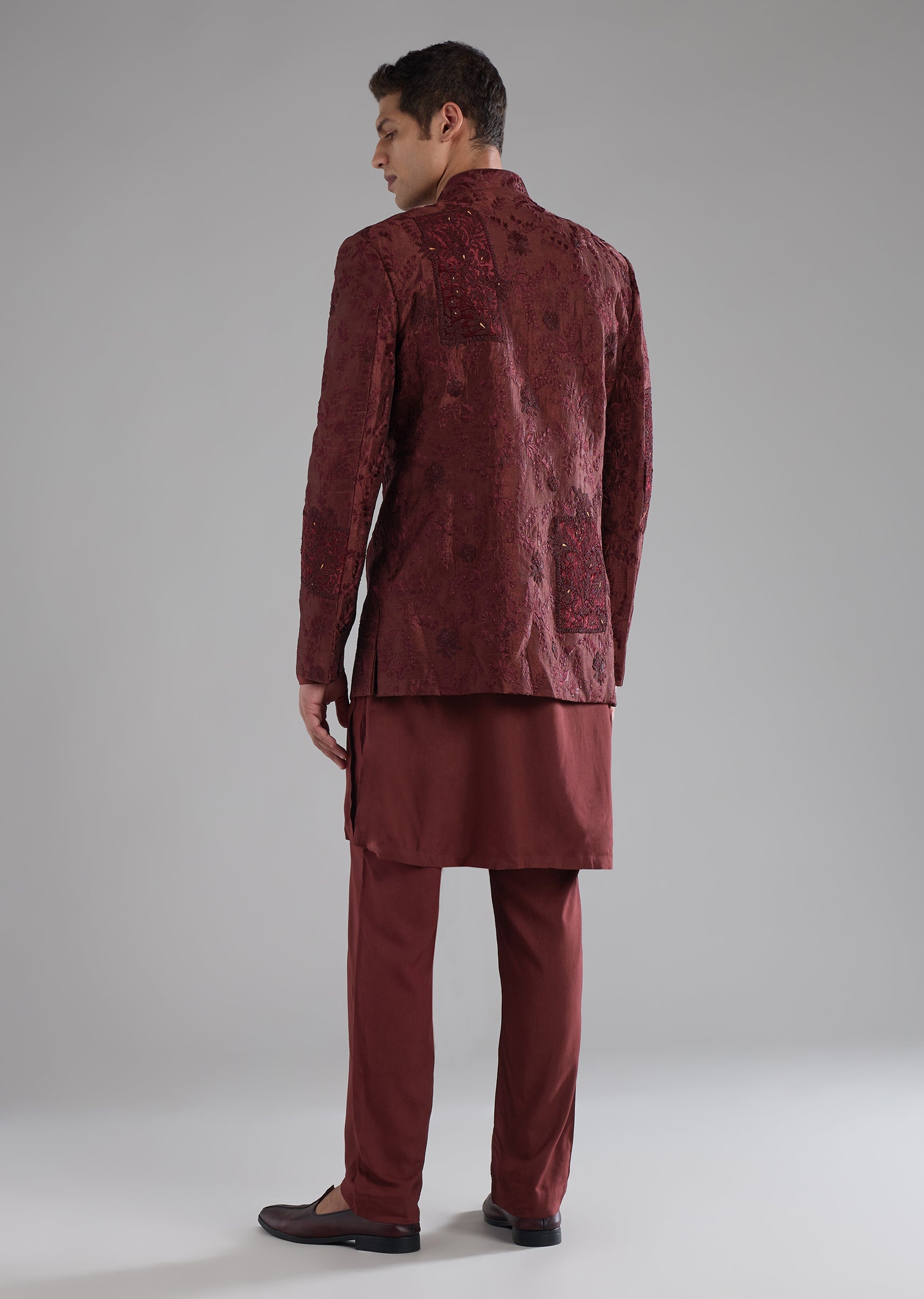 Red Raw Silk Embroidered Indowestern Kurta Set