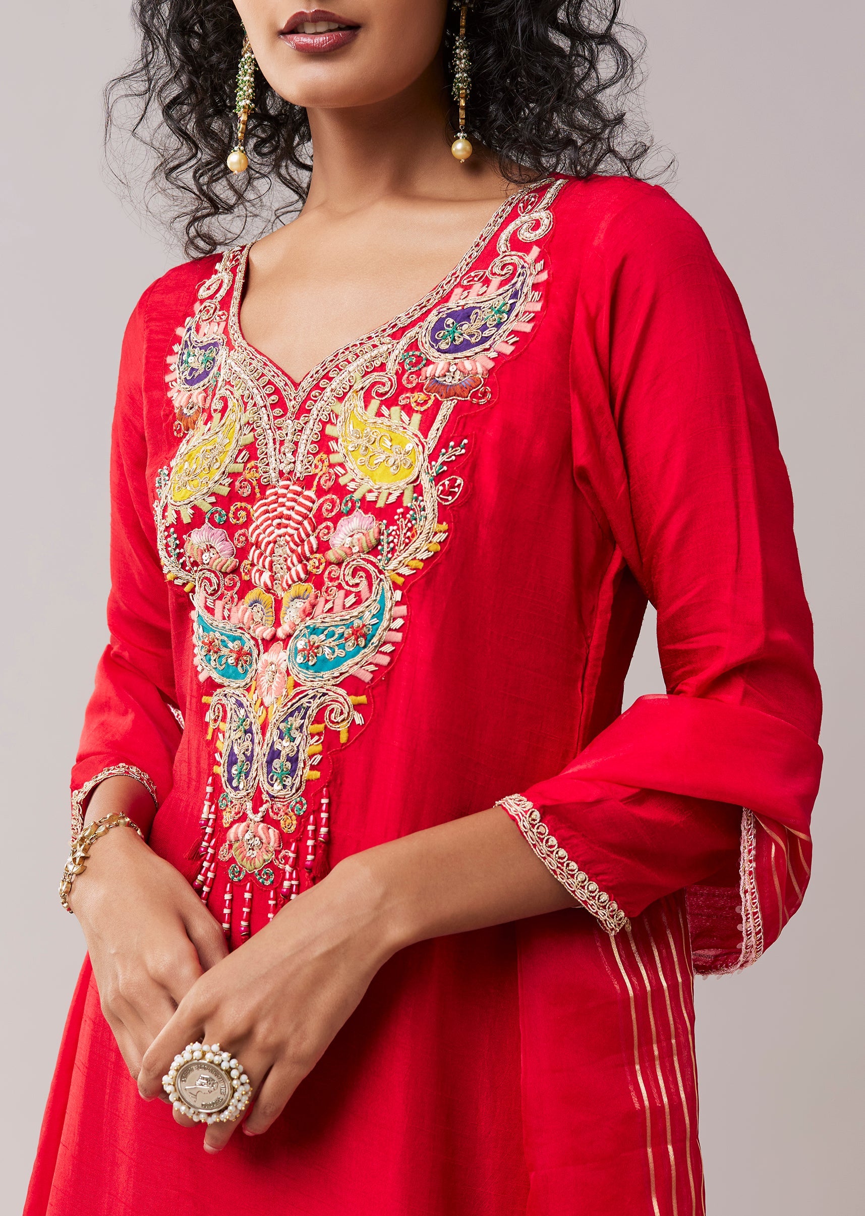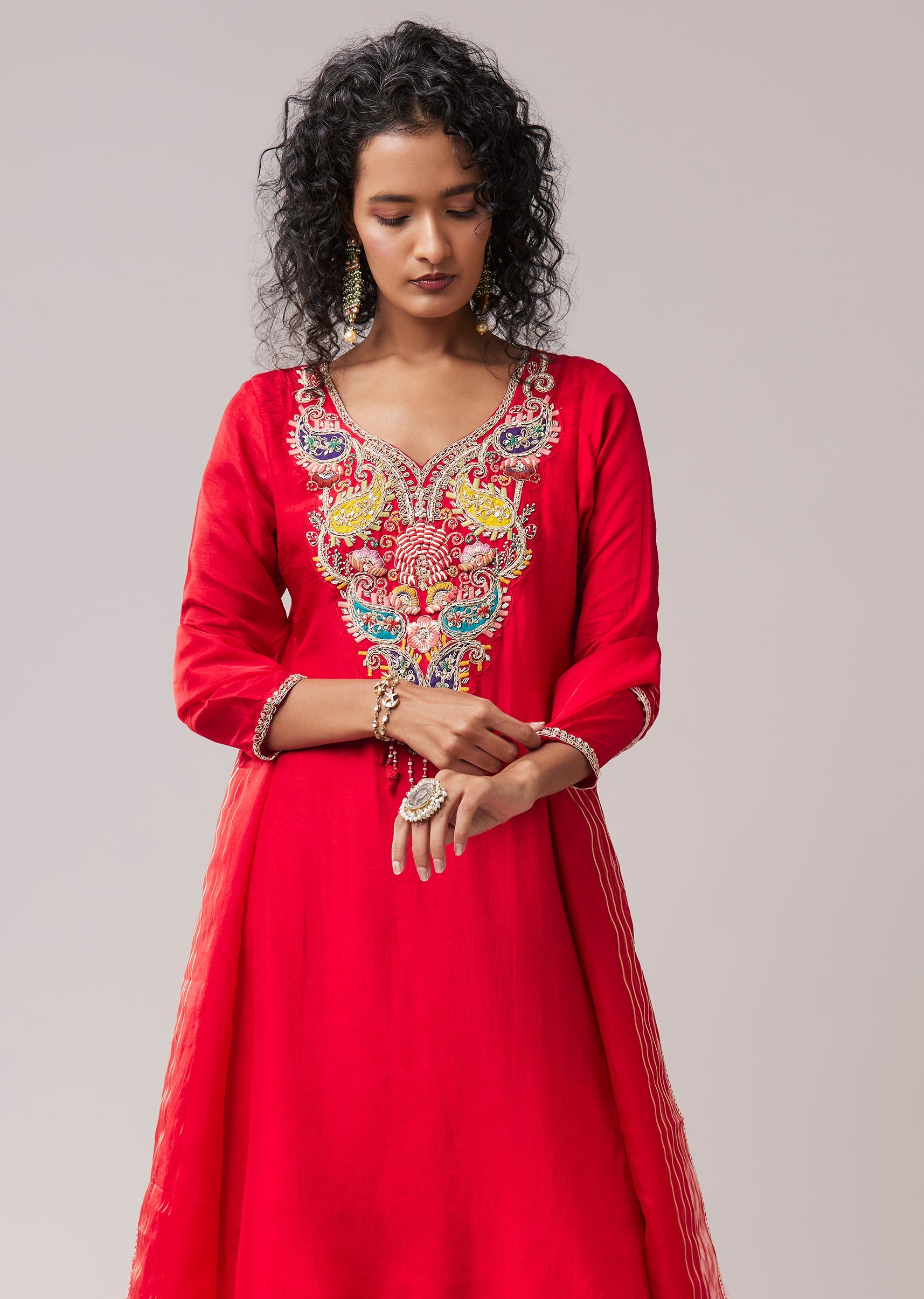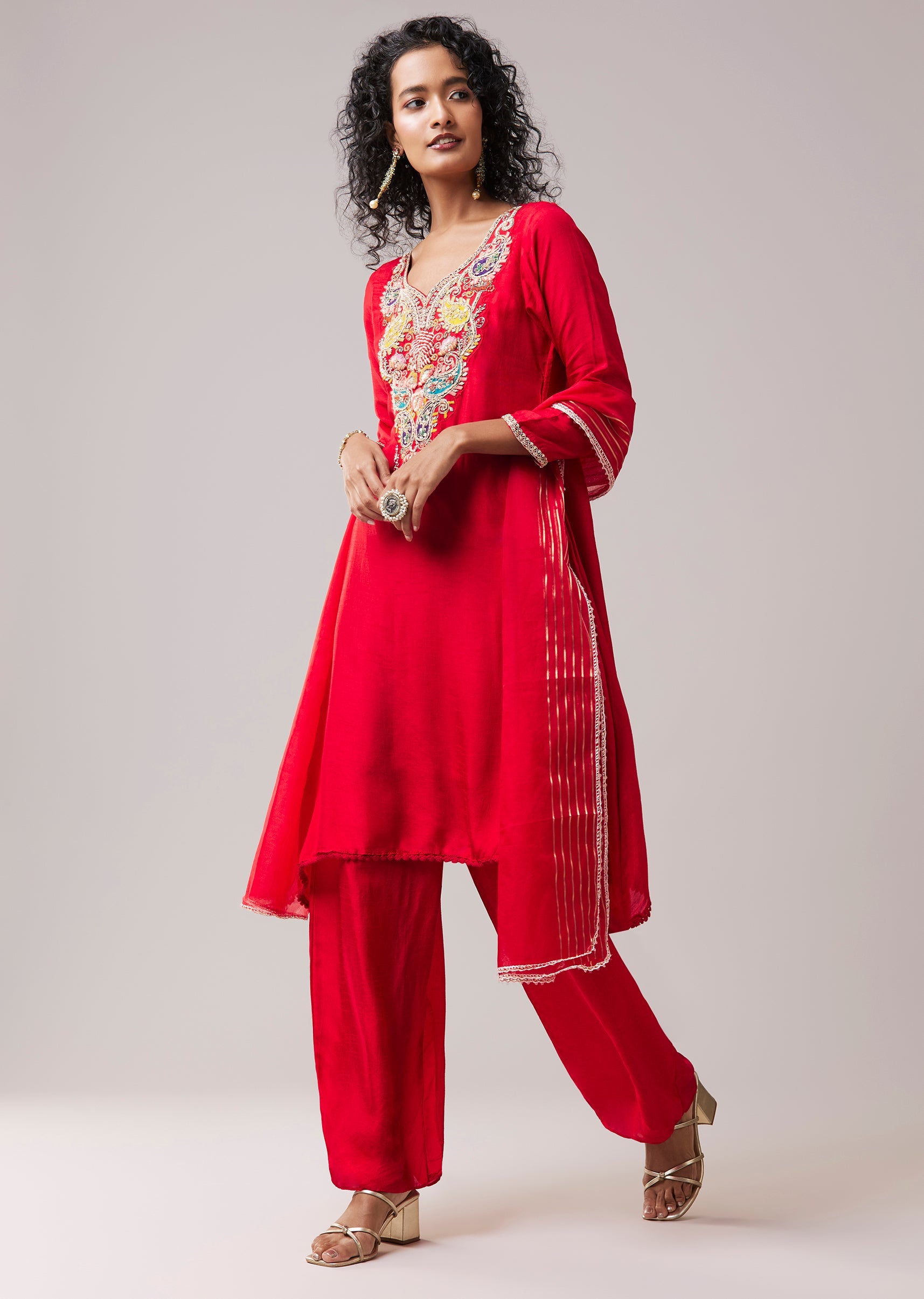 Red Resham Work Silk Kurta Palazzo Set