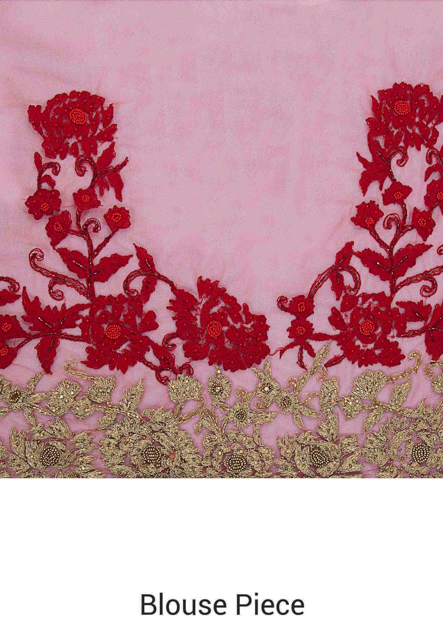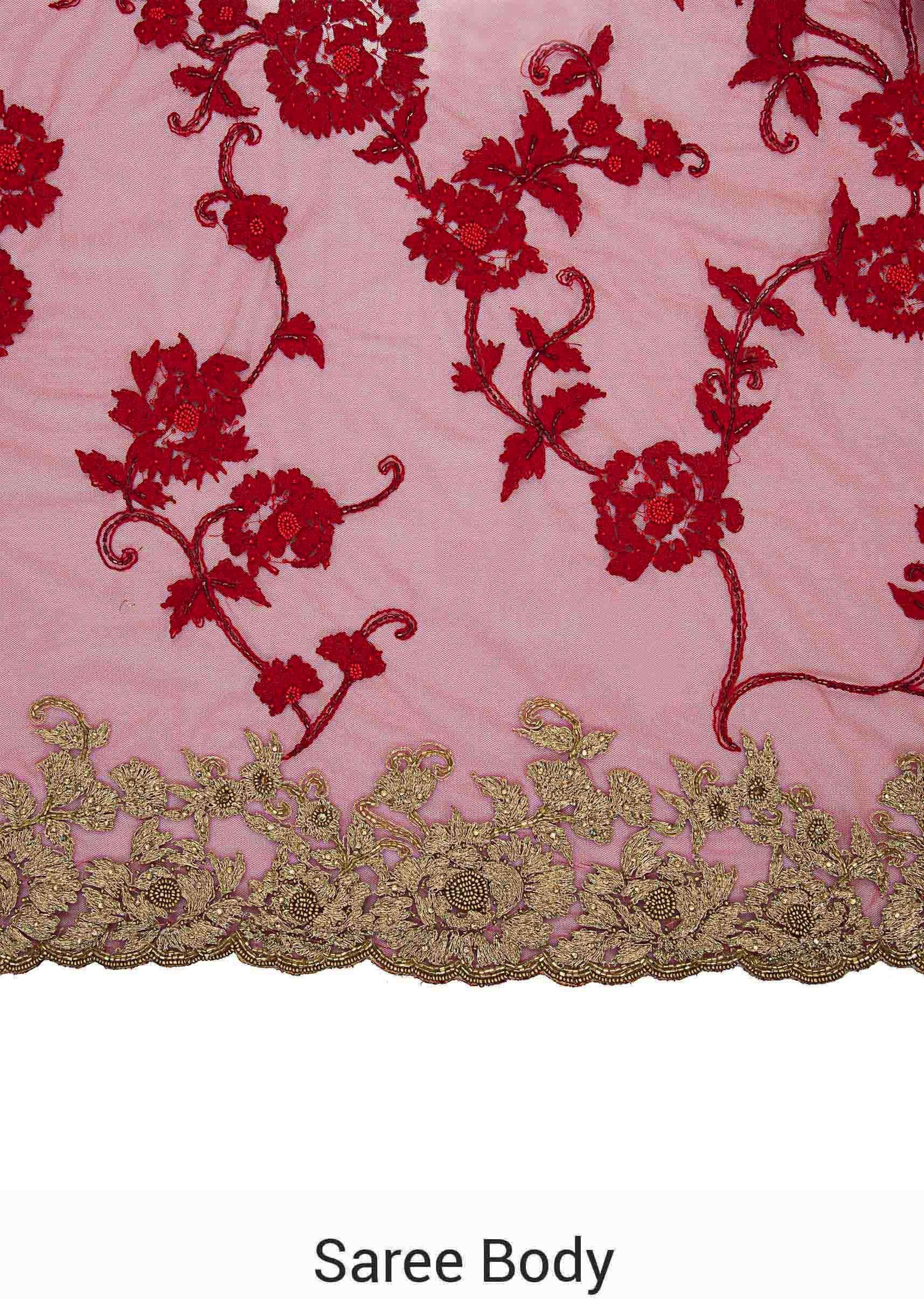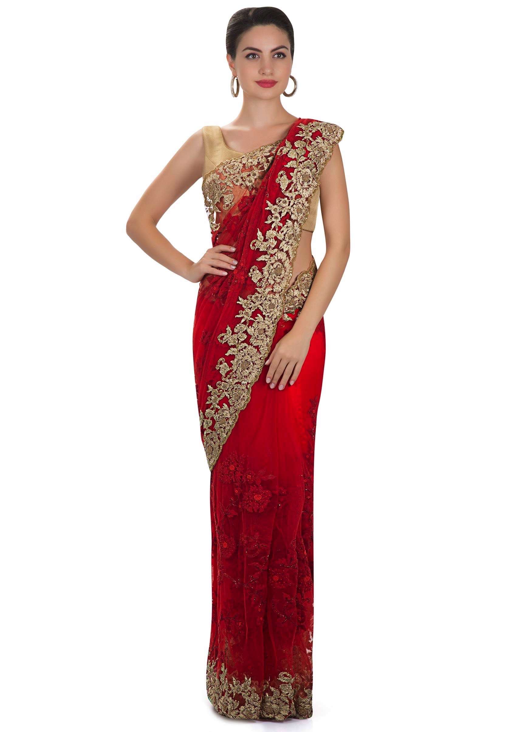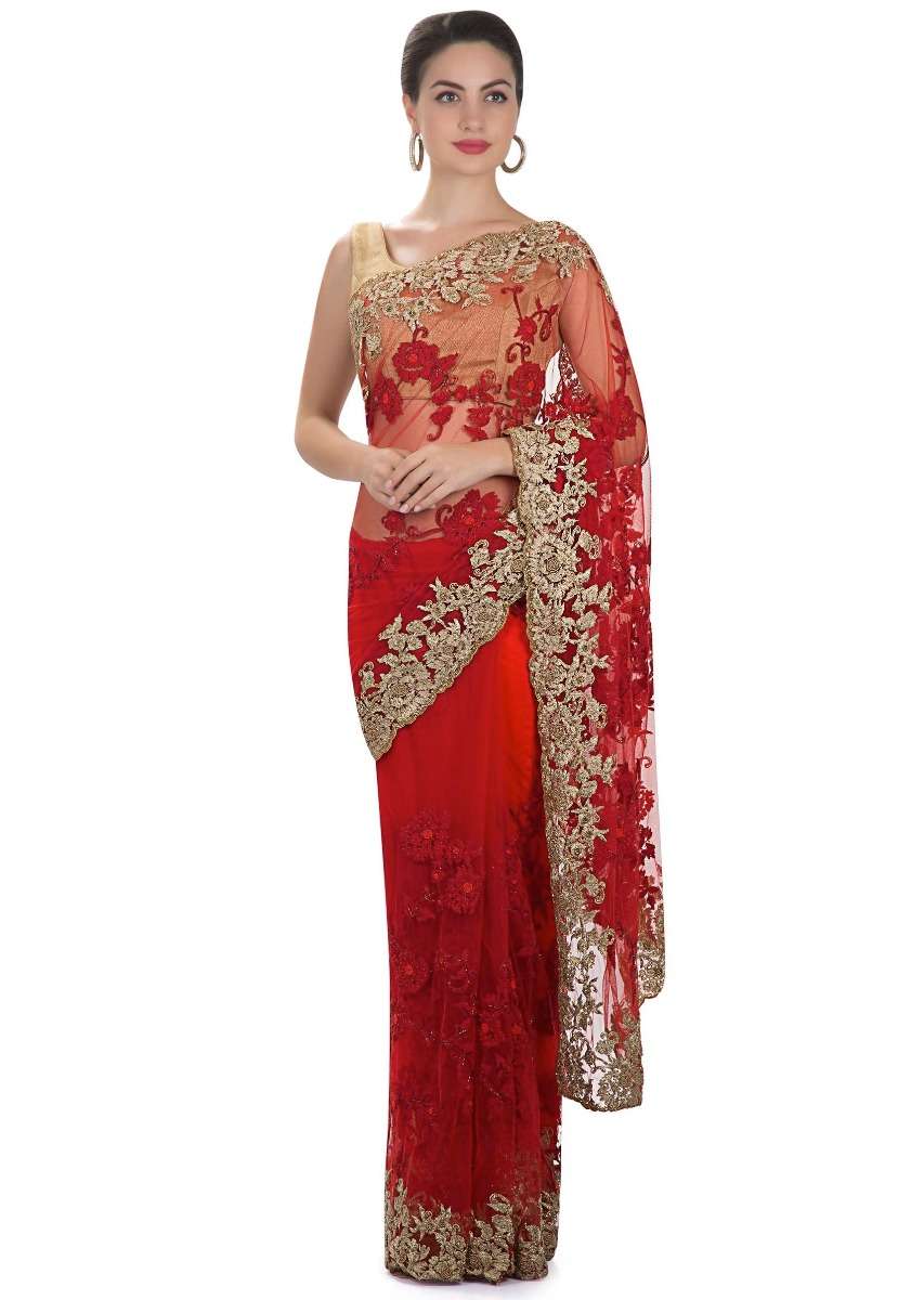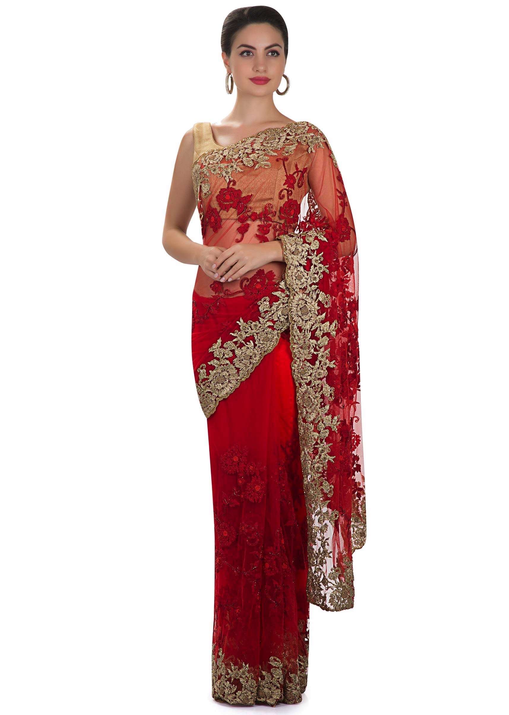 Red Saree In Net Featuring Moti And Zari Work Online - Kalki Fashion
