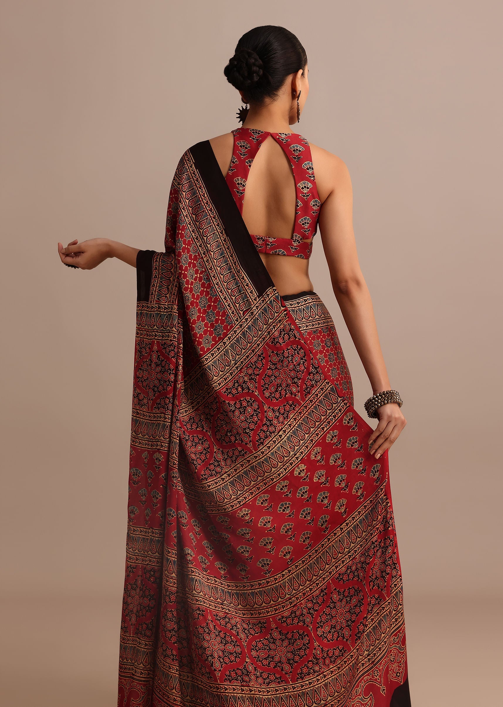 Red Satin Ajrakh Handblock Printed Ready To Wear Saree