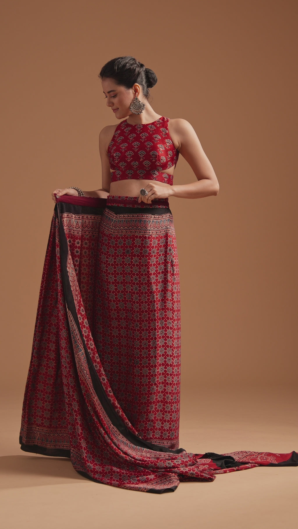 Red Satin Ajrakh Handblock Printed Ready To Wear Saree