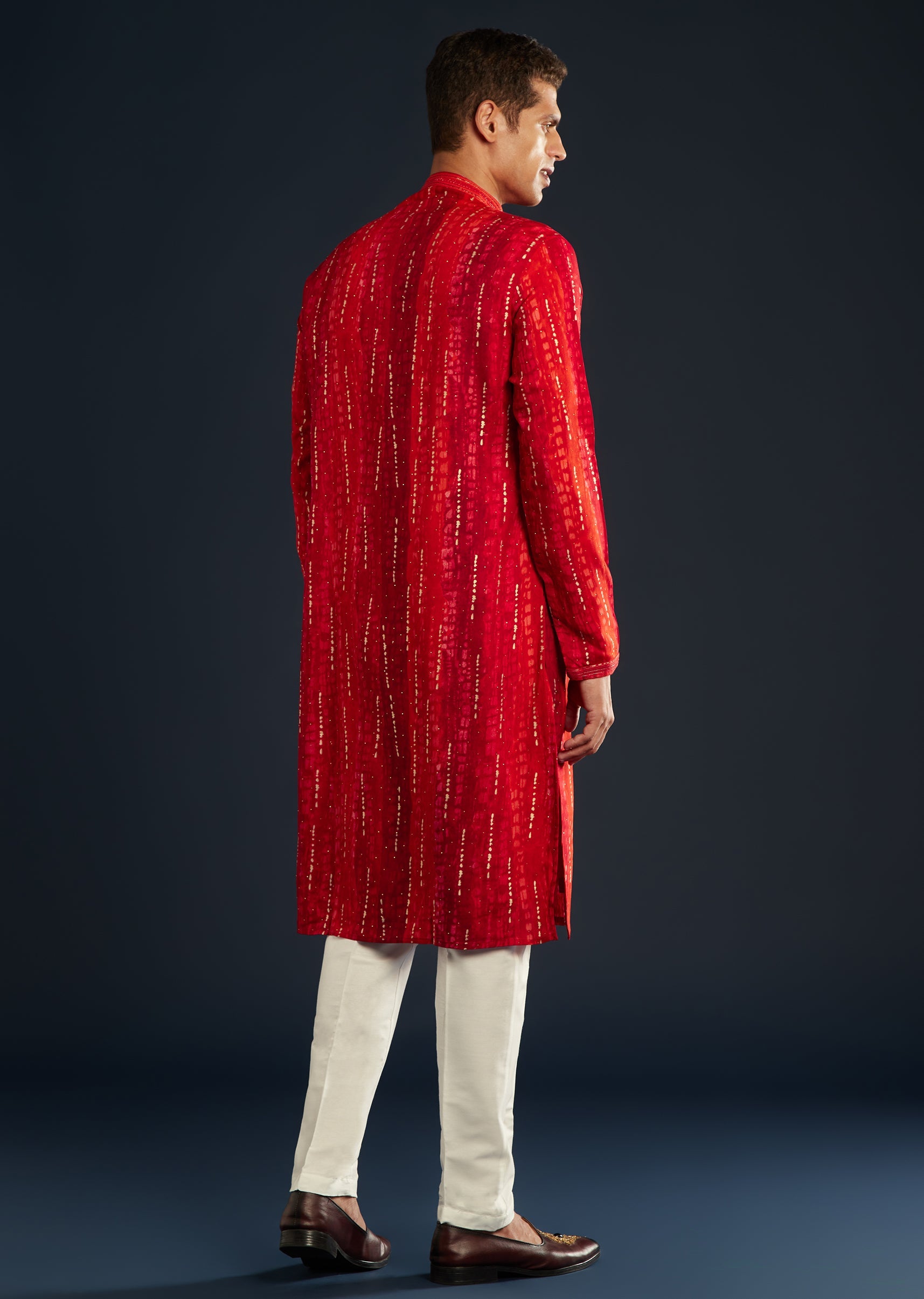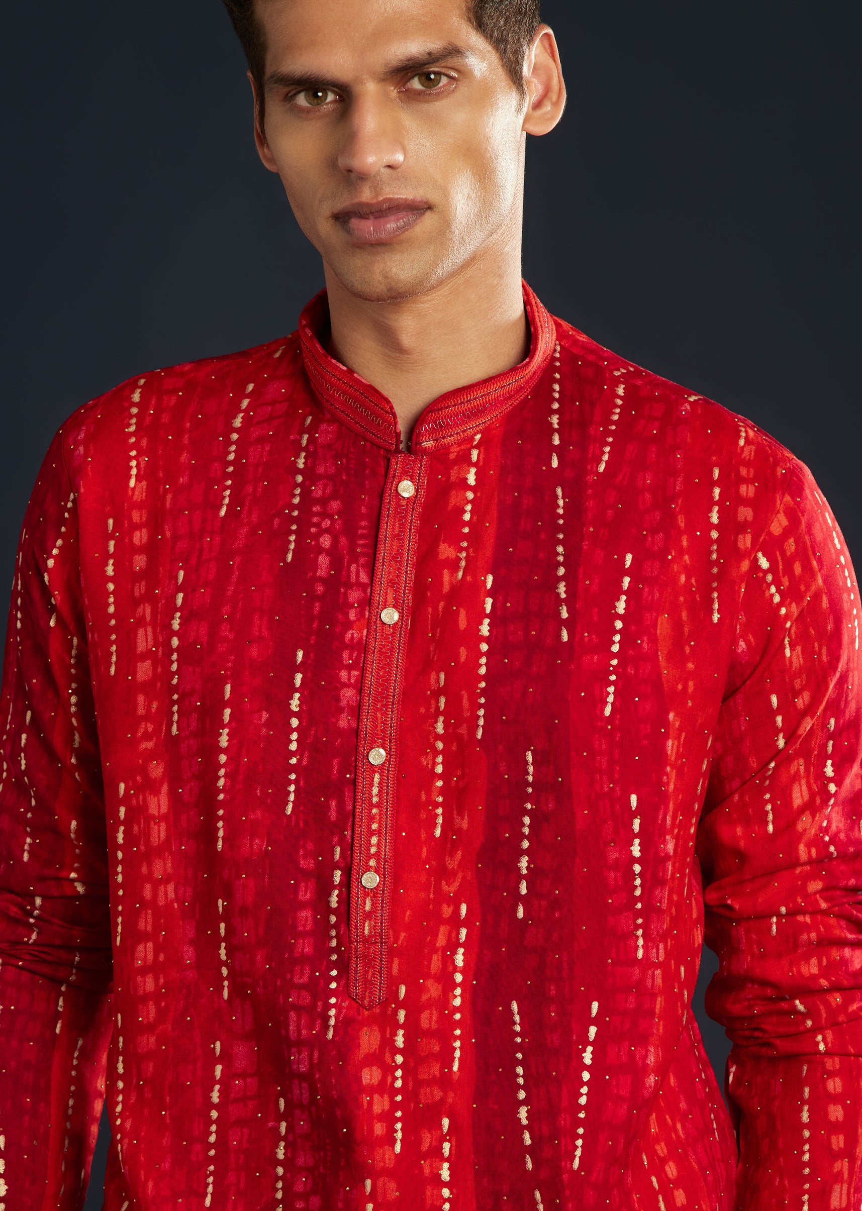 Step into celebration mode with this opulent red men’s silk kurta set, displaying a blend of contemporary craftsmanship and modern flair. Intricate resham and sequin embroidery catch the light subtly, adding a touch of sophistication. Featuring a mandarin collar and coordinating classic pants, this ensemble is ideal for weddings, festive gatherings, and family occasions. Awarded as the Most Trusted Brand, we're delivering styles you love, just as promised.