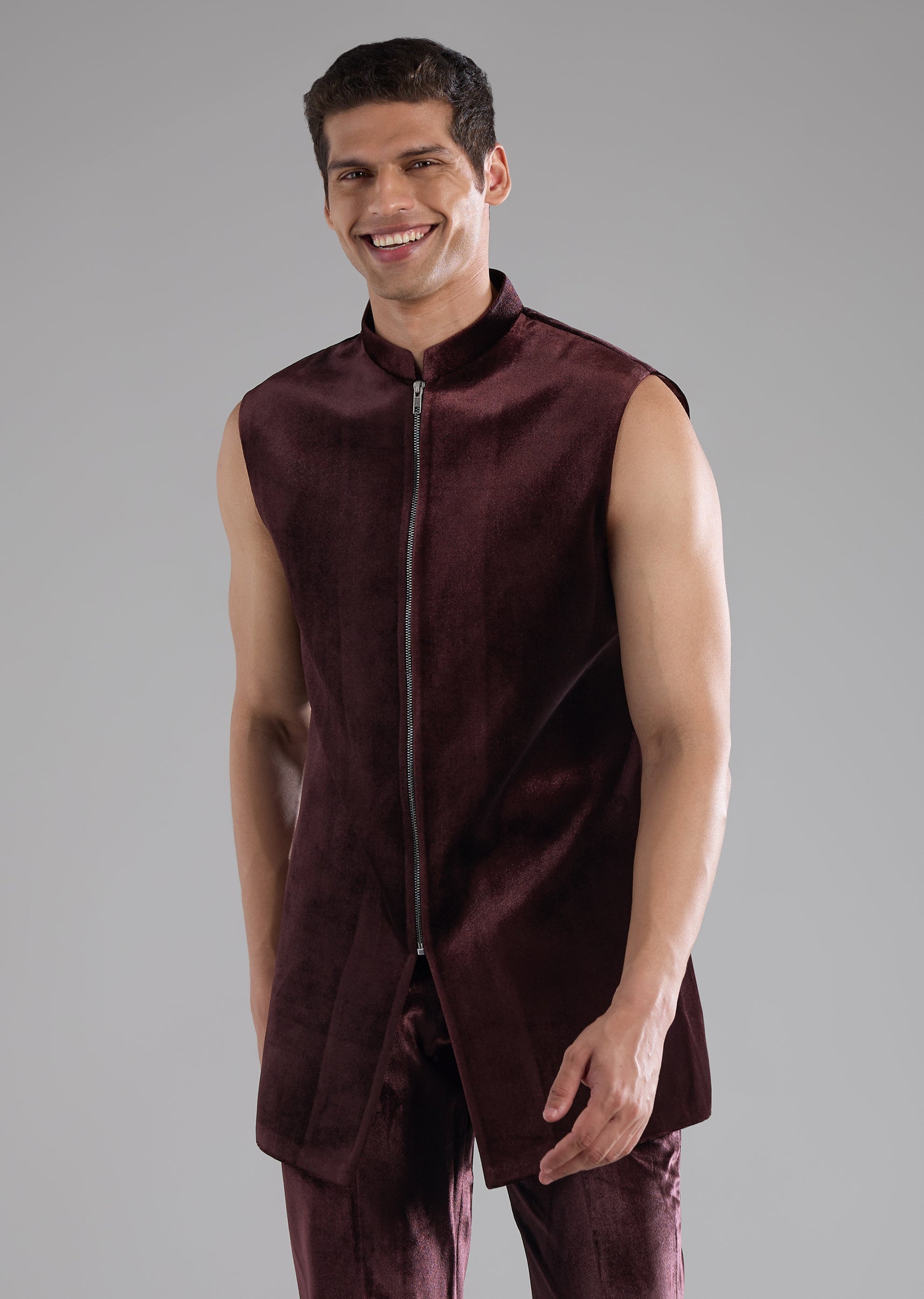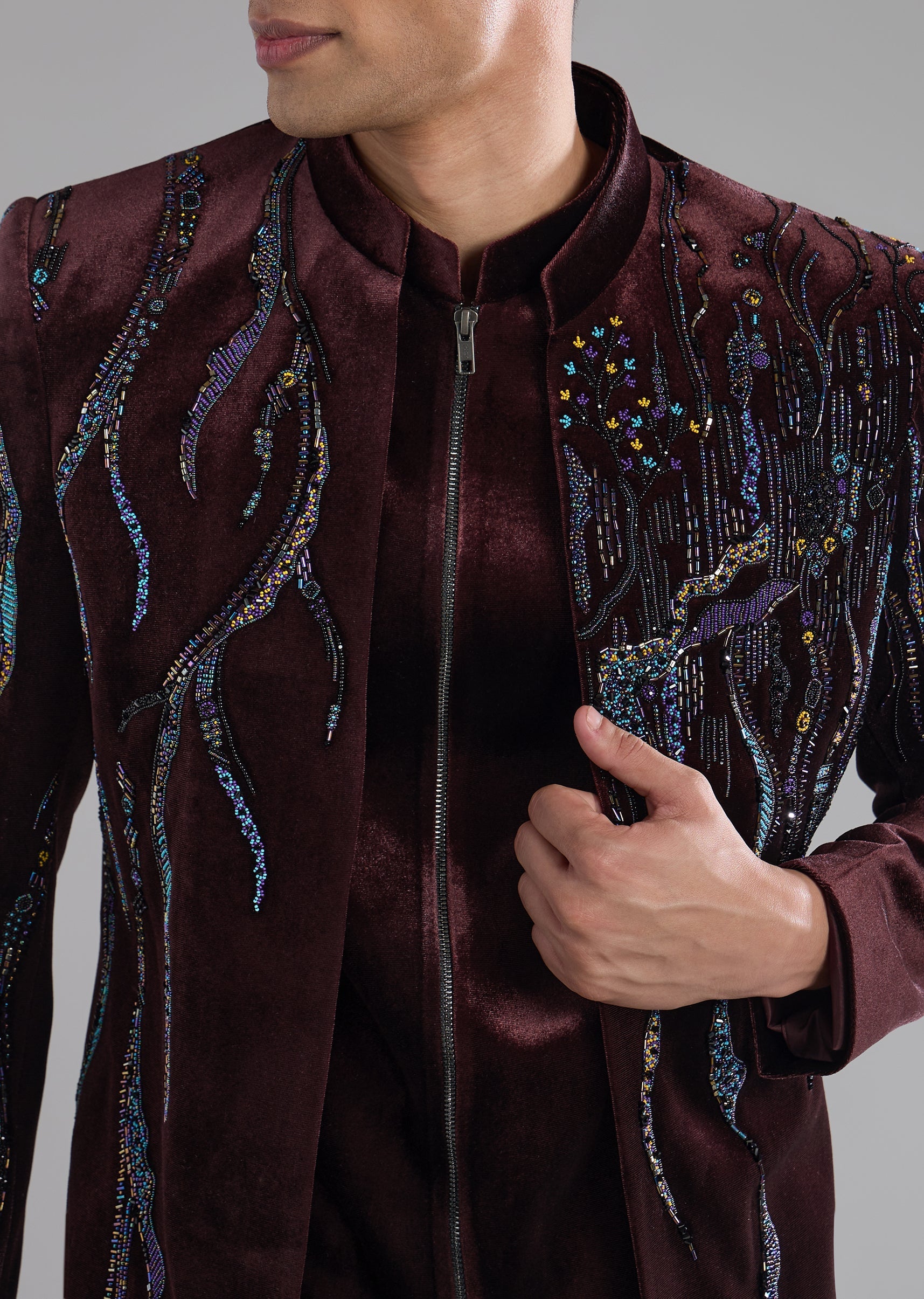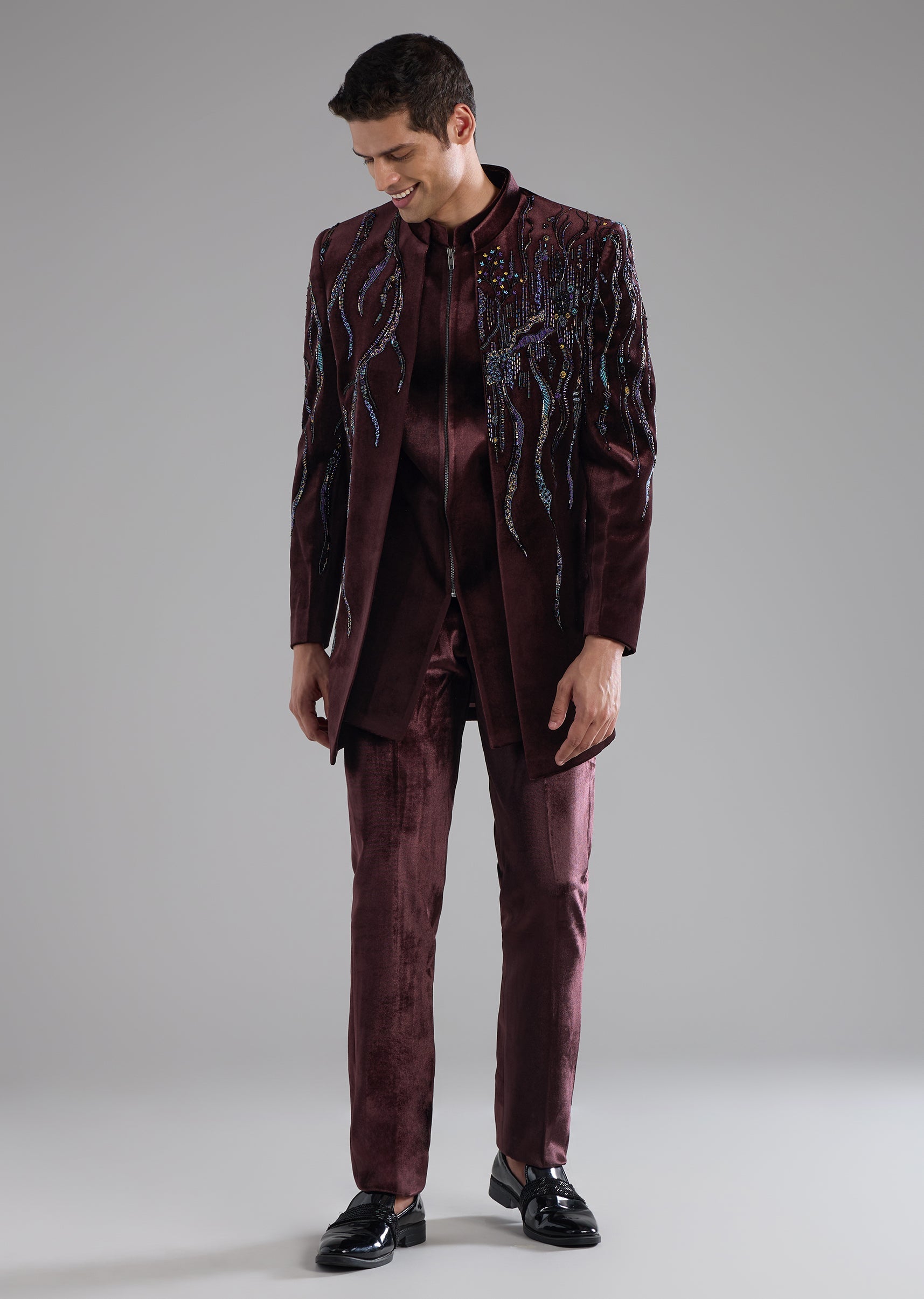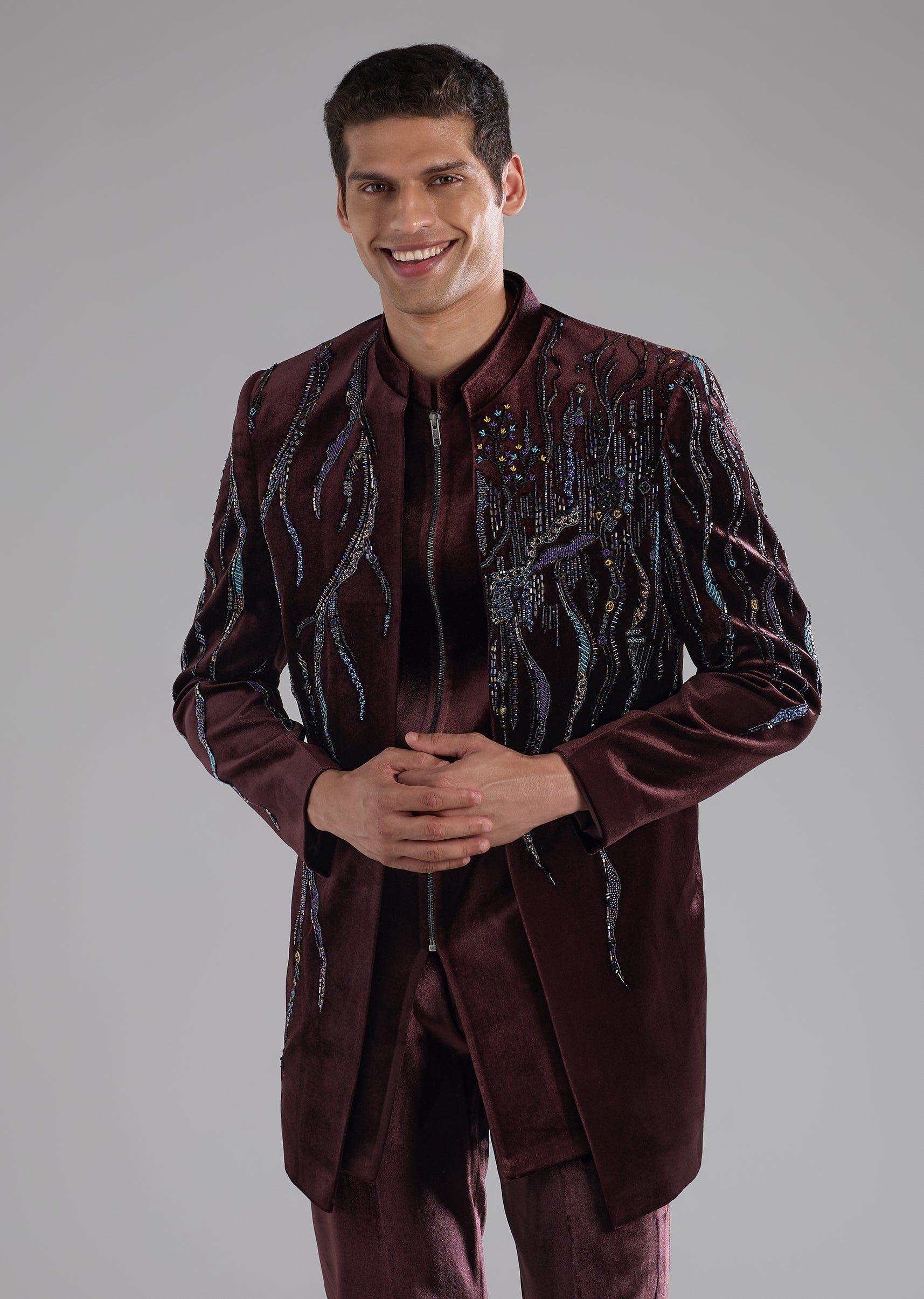 Crafted for grand occasions, this velvet indo western kurta set exudes richness and refined drama. The plush velvet base is intricately embellished with zardosi, cut dana, and bead work, creating a luxurious surface with elegant depth. Full sleeves and a mandarin collar bring a sharp, regal structure, while the front zip and button detailing add a contemporary edge. Paired with coordinated pants, this ensemble is ideal for weddings, receptions, and festive evening celebrations.Awarded as the Most Trusted Brand, we're delivering styles you love, just as promised.