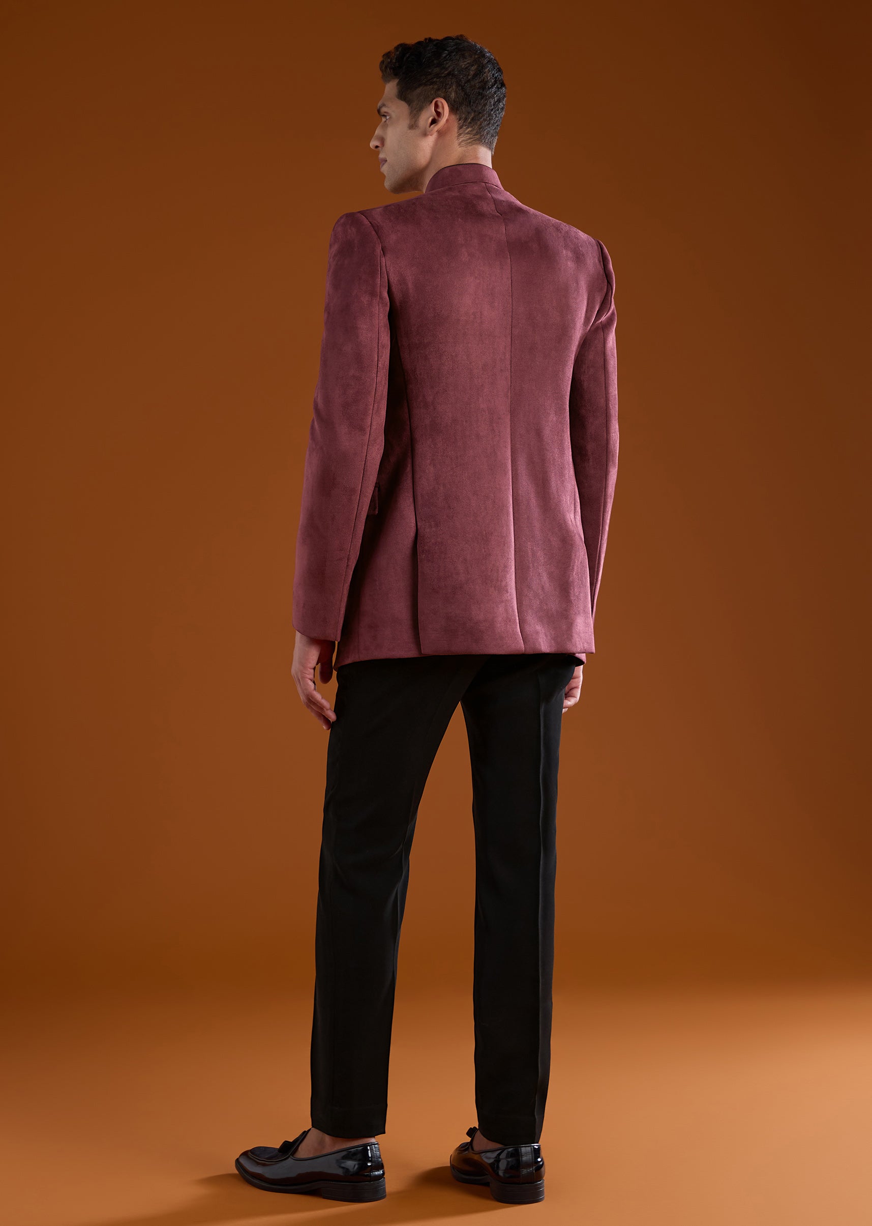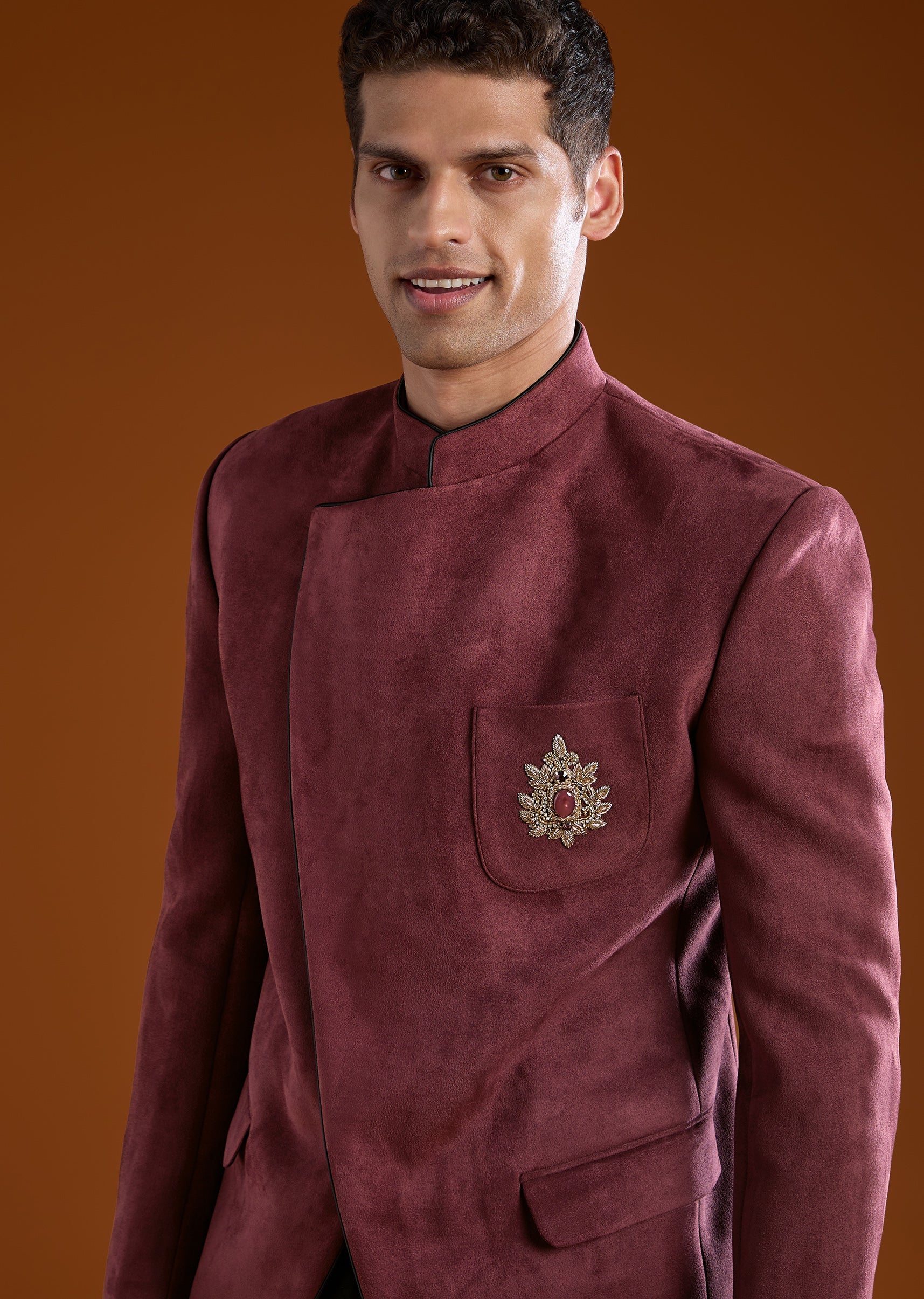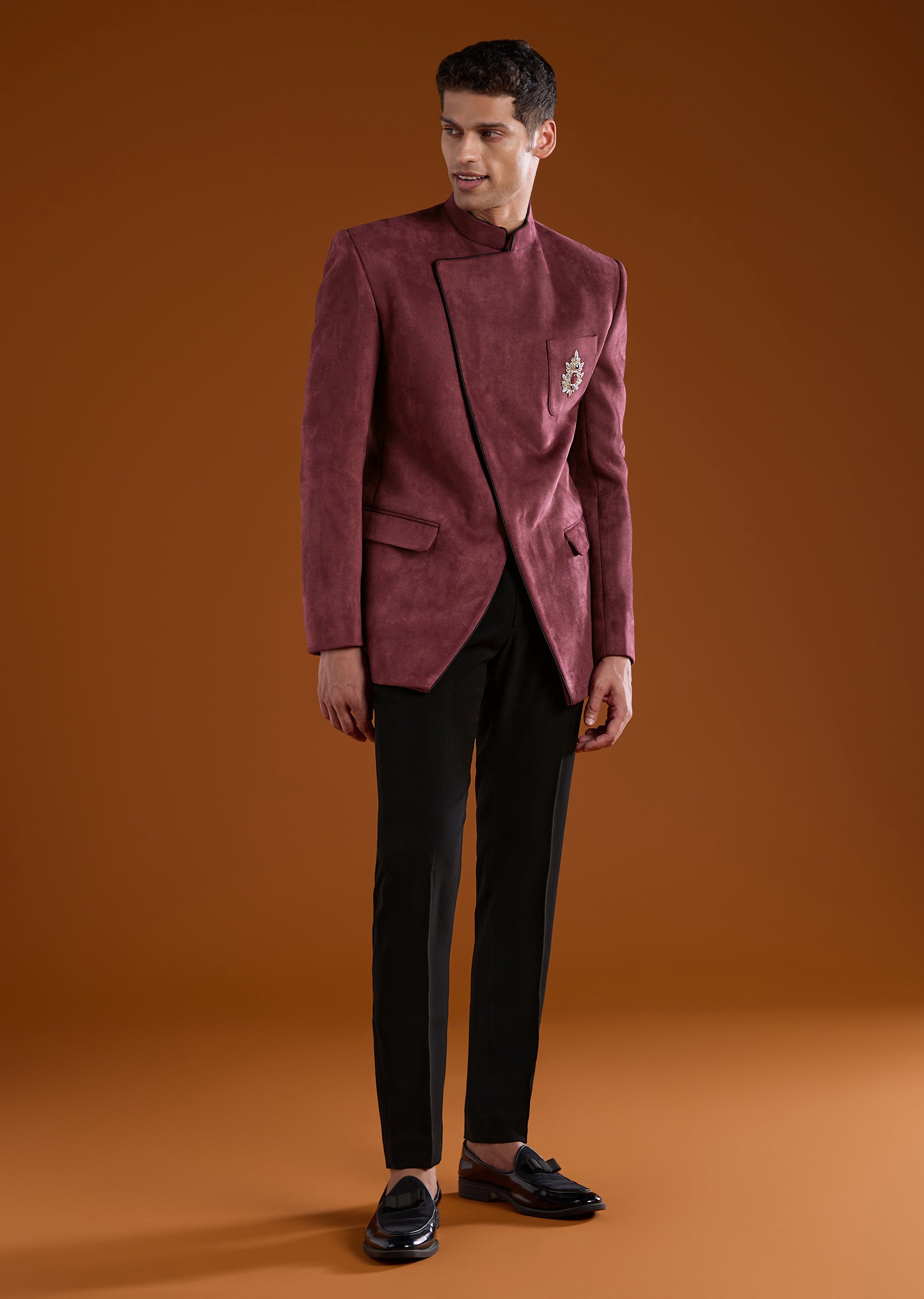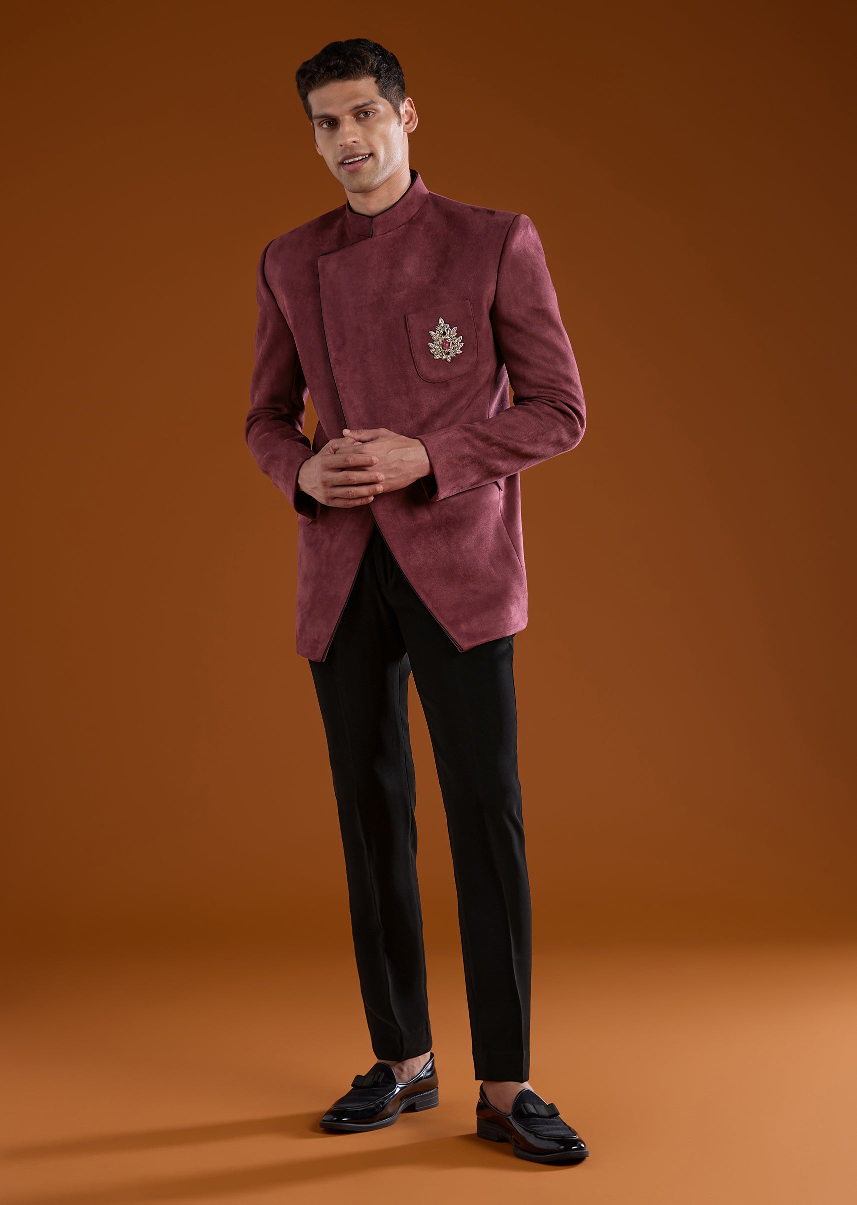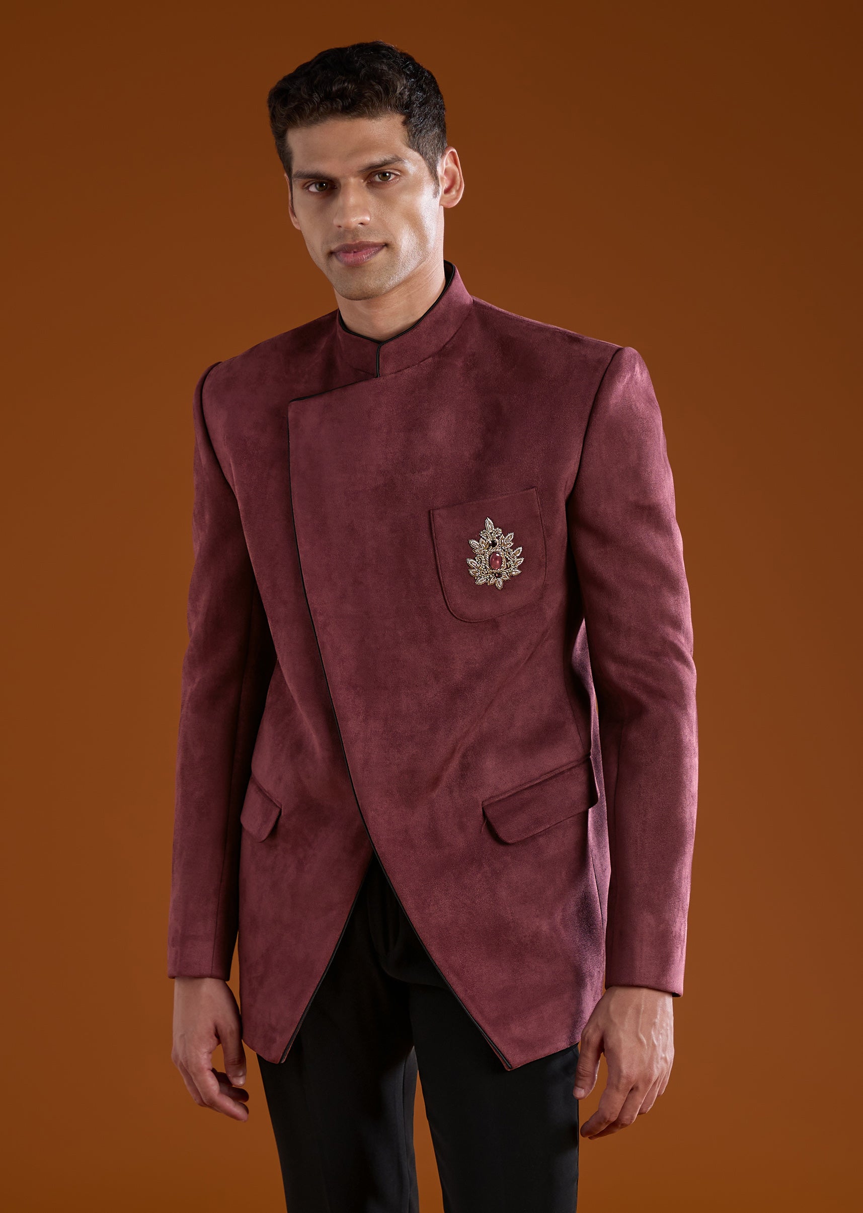 Pair it with polished formal shoes, a sleek watch, and a minimal brooch to enhance its opulent velvet detailing.