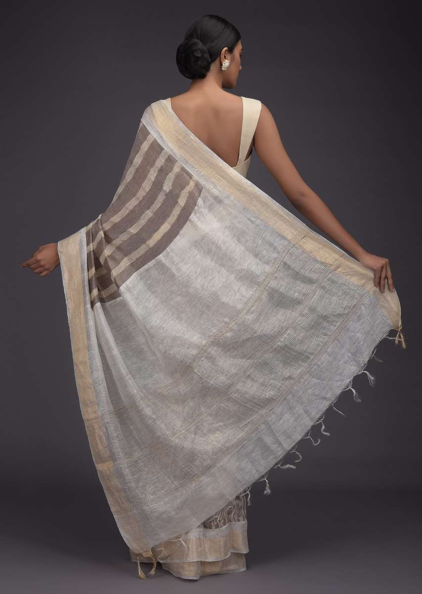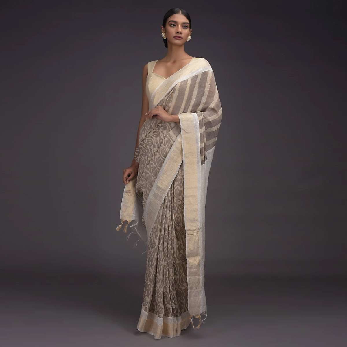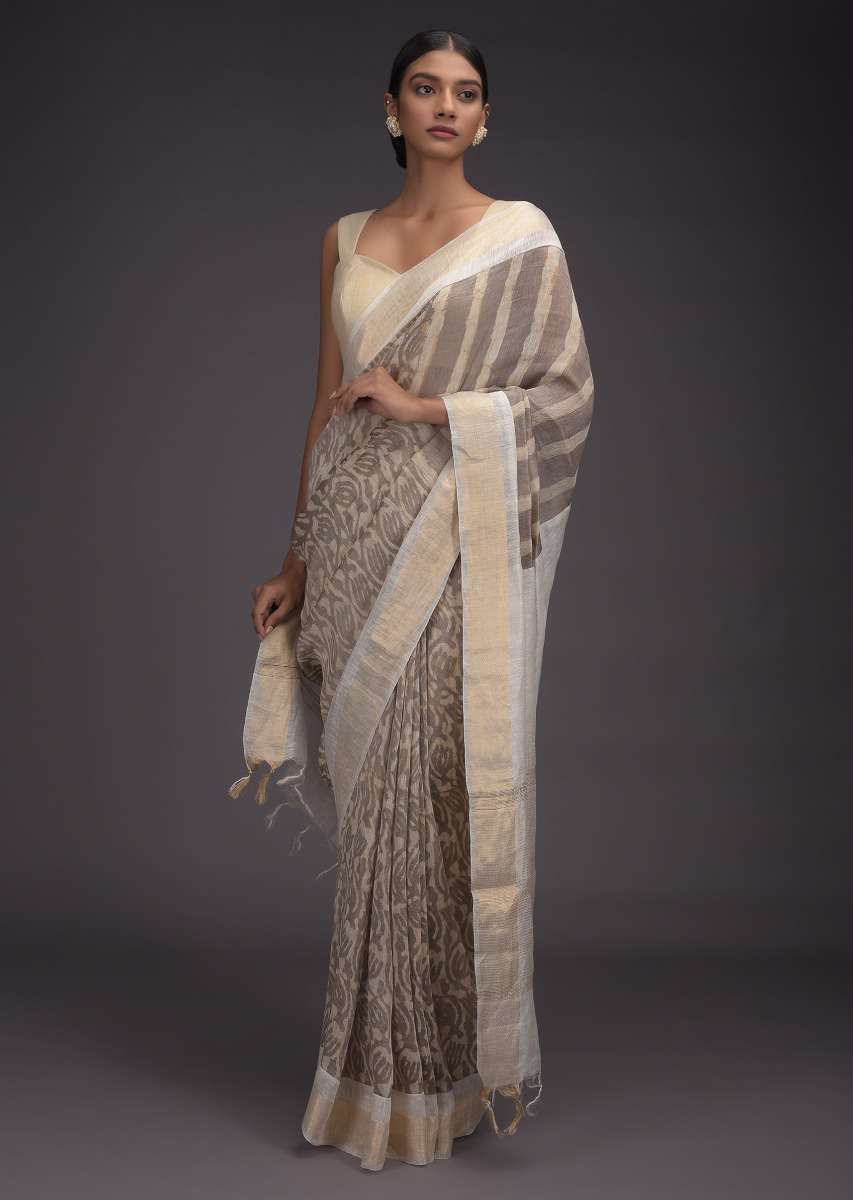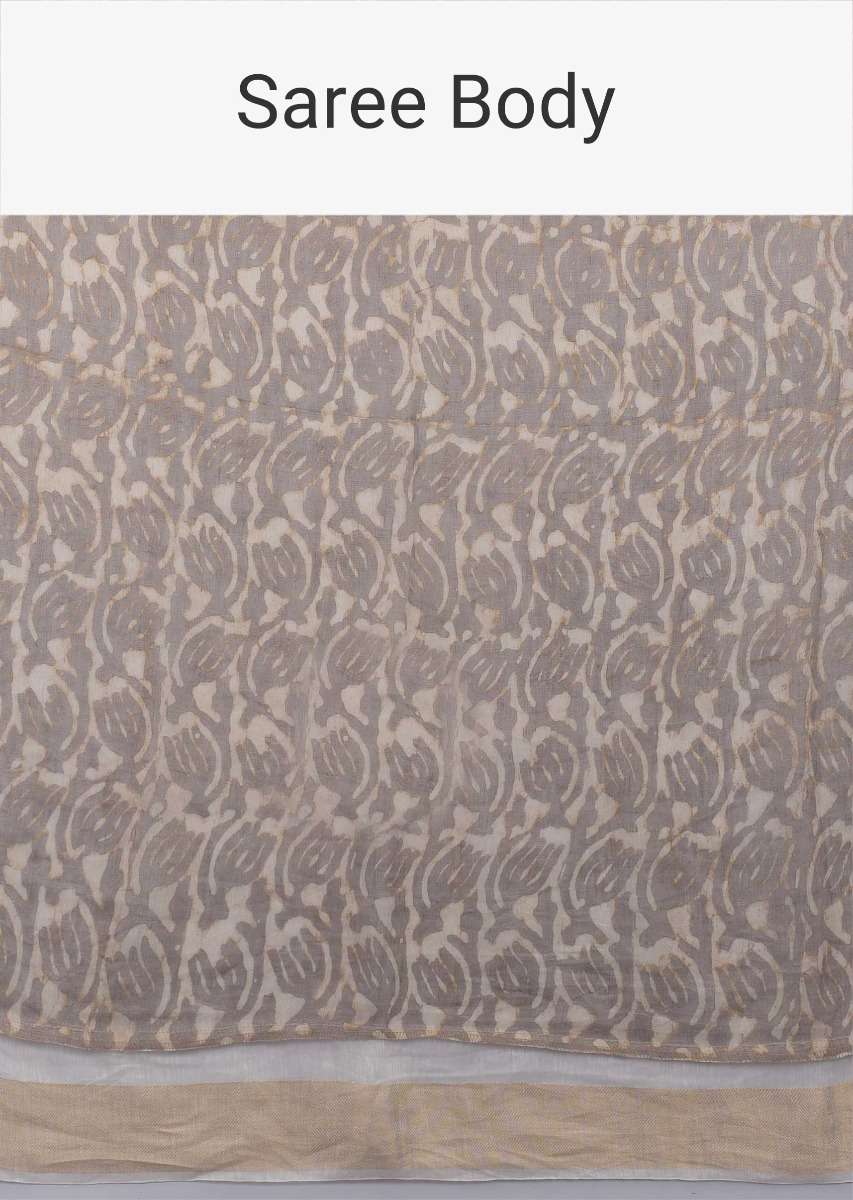 Rhino Grey Saree In Tussar Silk With Batik Print In Floral Jaal Pattern Online - Kalki Fashion