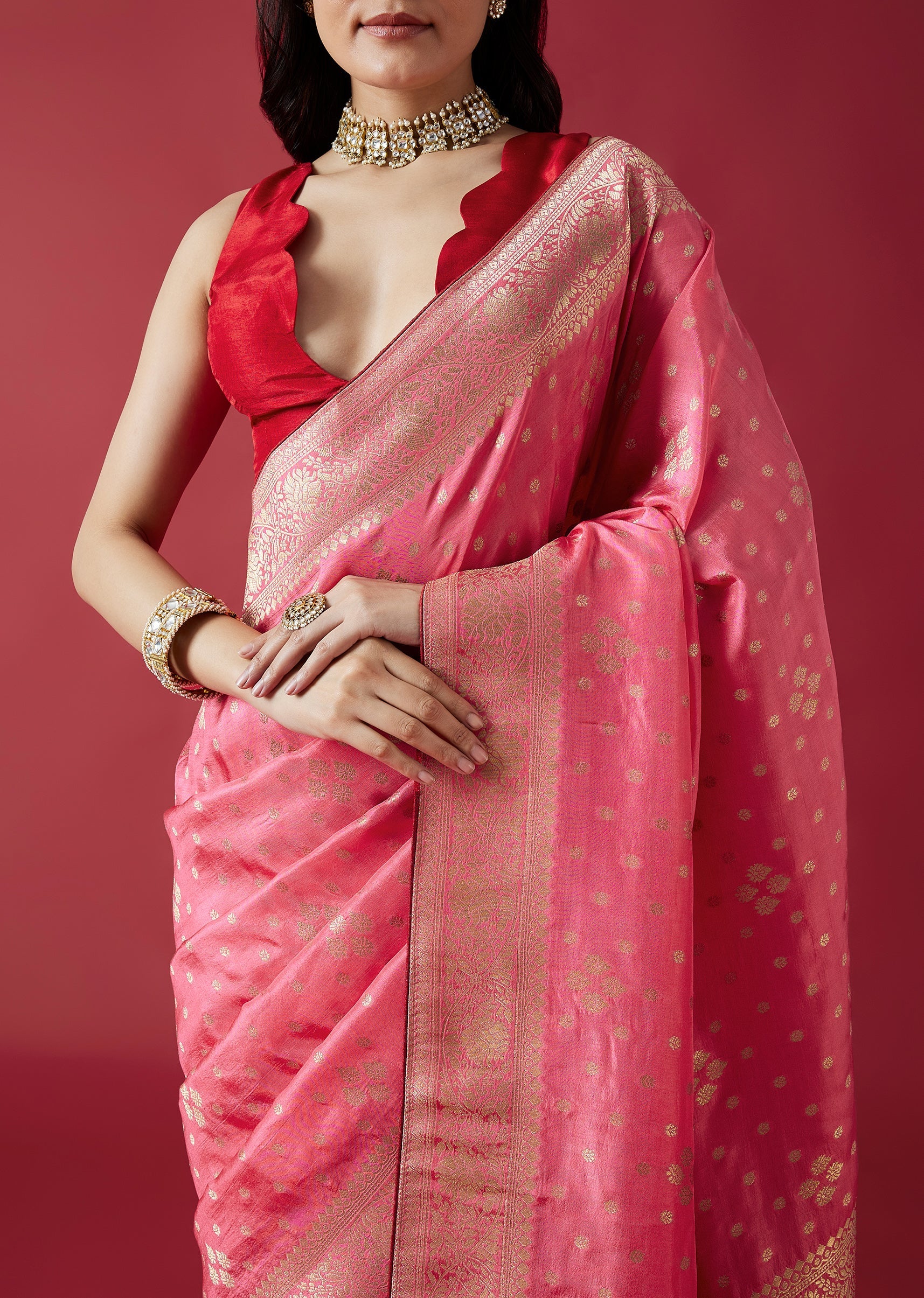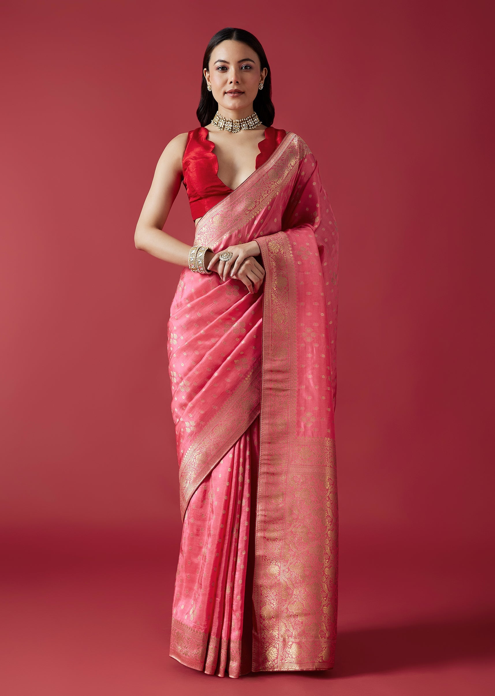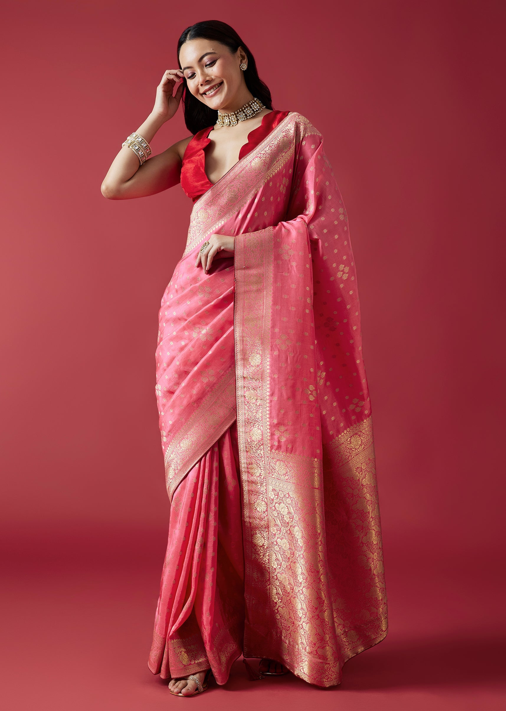 Rose Pink Dola Silk Woven Saree With Zari Floral Border